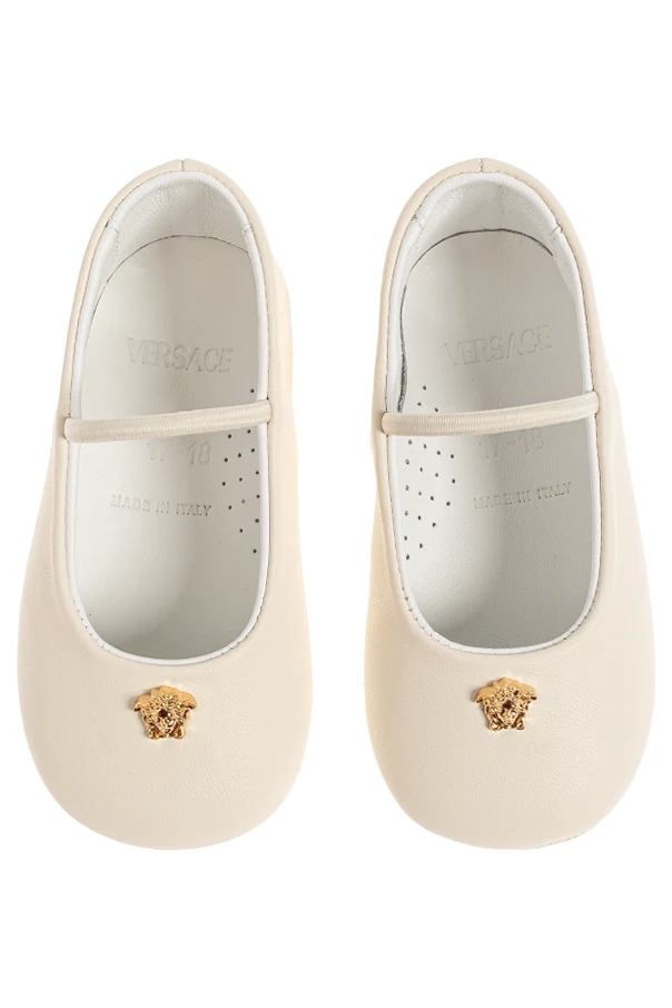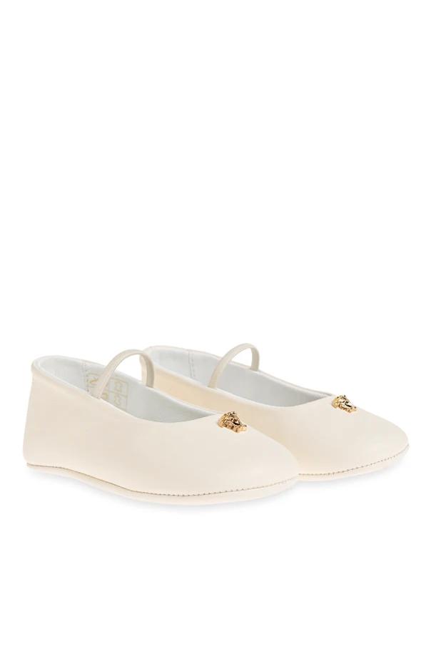 Crafted for the youngest trendsetters, these Versace Kids Leather Ballerinas blend iconic design with exceptional comfort. Presented in a delicate cream hue, the shoes capture timeless elegance through their smooth, high-quality leather construction—both inside and out. The classic ballerina silhouette features a softly rounded toe and a single strap across the midfoot, ensuring a secure and graceful fit for little feet.