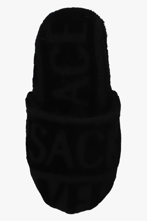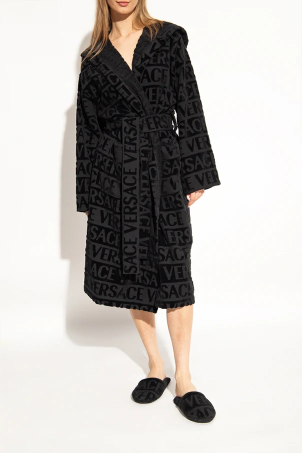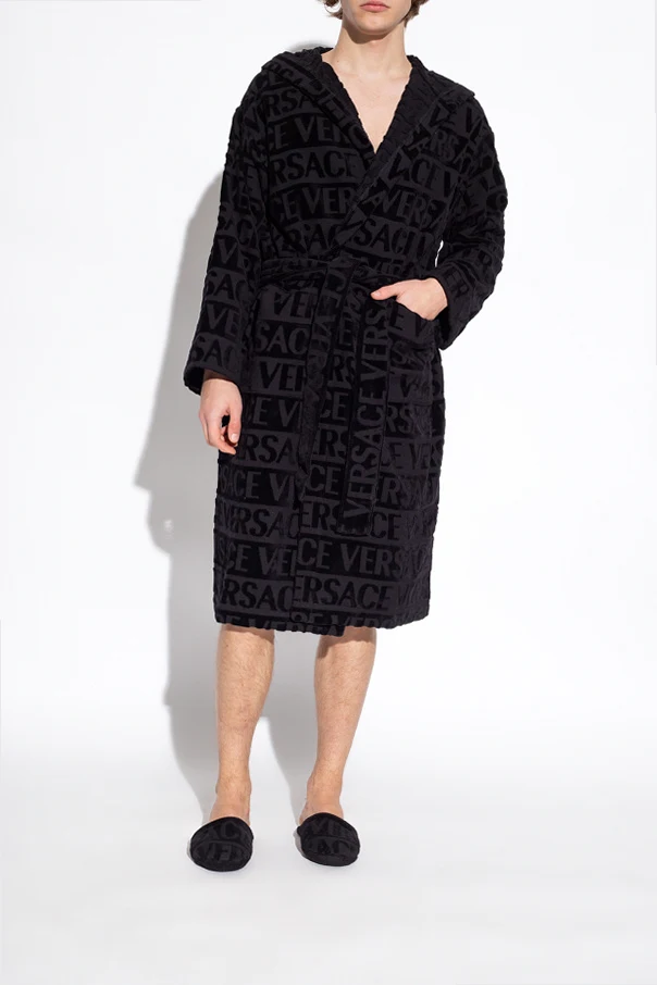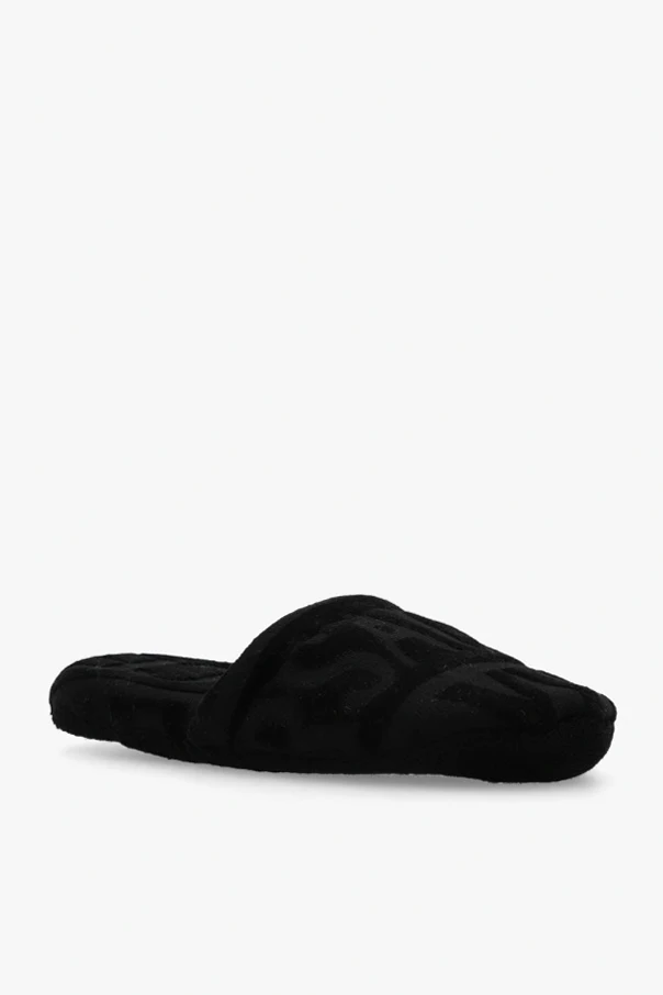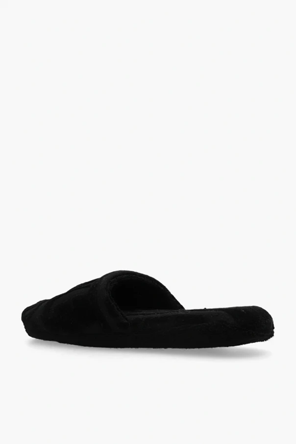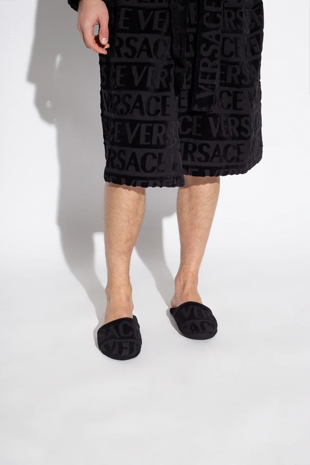 Black slides with a logo pattern from Versace Home. Made of fabric.