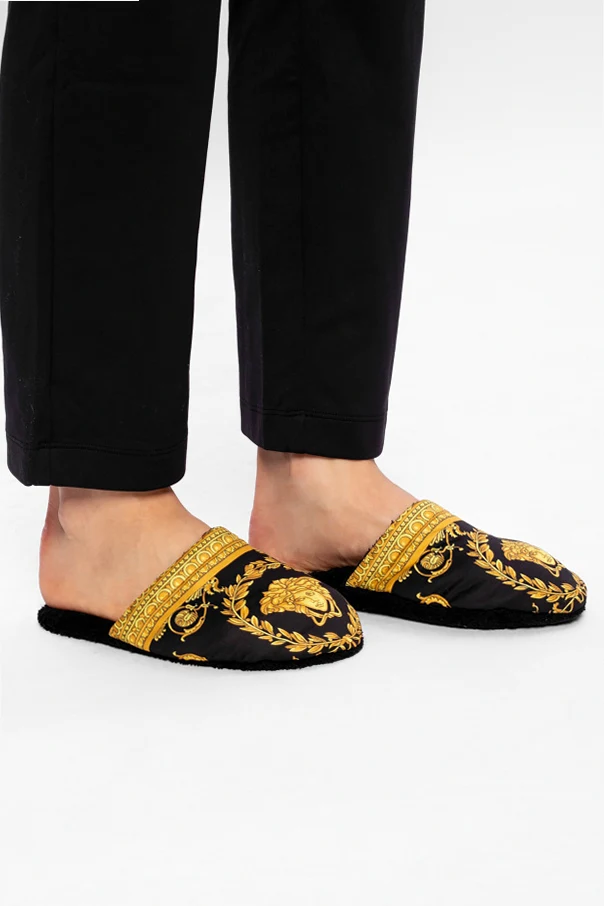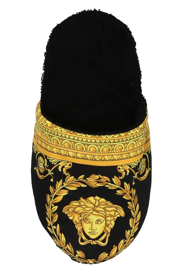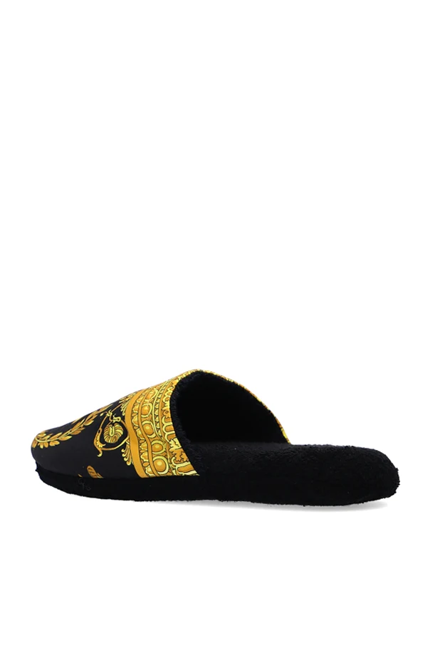 Black slides from Versace Home. Crafted from cotton, this item features the iconic Baroque print in gold-tone.