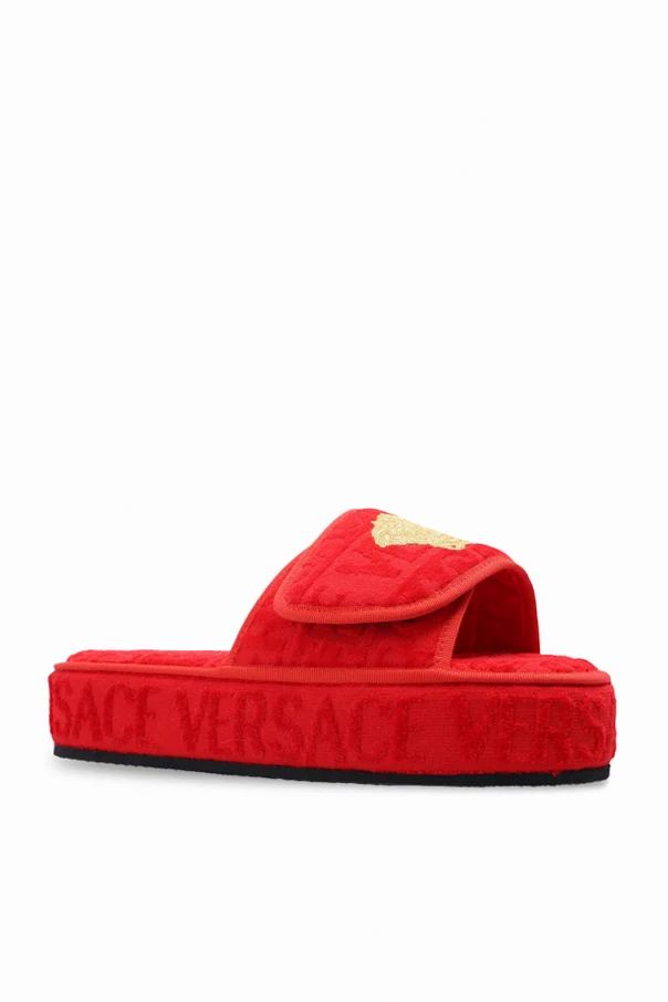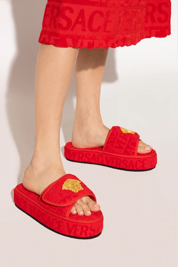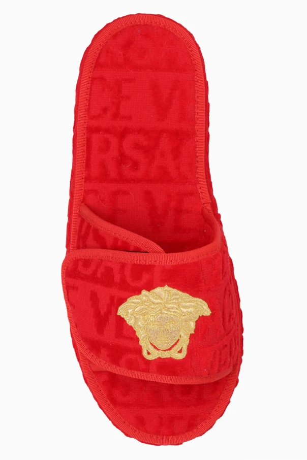 Red fabric slides from Versace Home. Fastened with velcro, this pair features an embroidered logo pattern, patch with the iconic Medusa head in gold-tone and a black rubber sole.