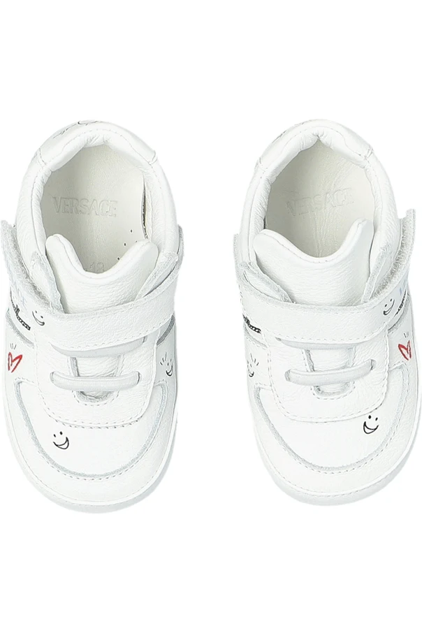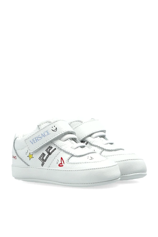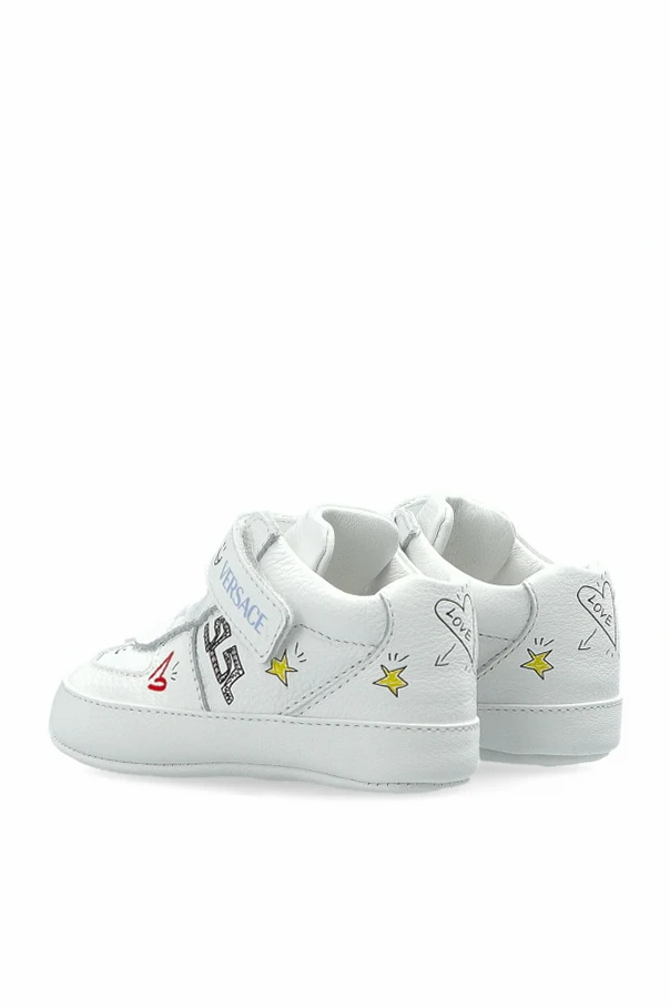 Delight in the playful sophistication of these leather-printed sneakers designed for little ones by Versace Kids. Crafted entirely from high-quality leather with a refined, smooth finish, these shoes combine the allure of luxury with whimsical, multicolor prints of stars, hearts, charming sketches, and vibrant lettering, including the iconic "MILANO" and designer initials.