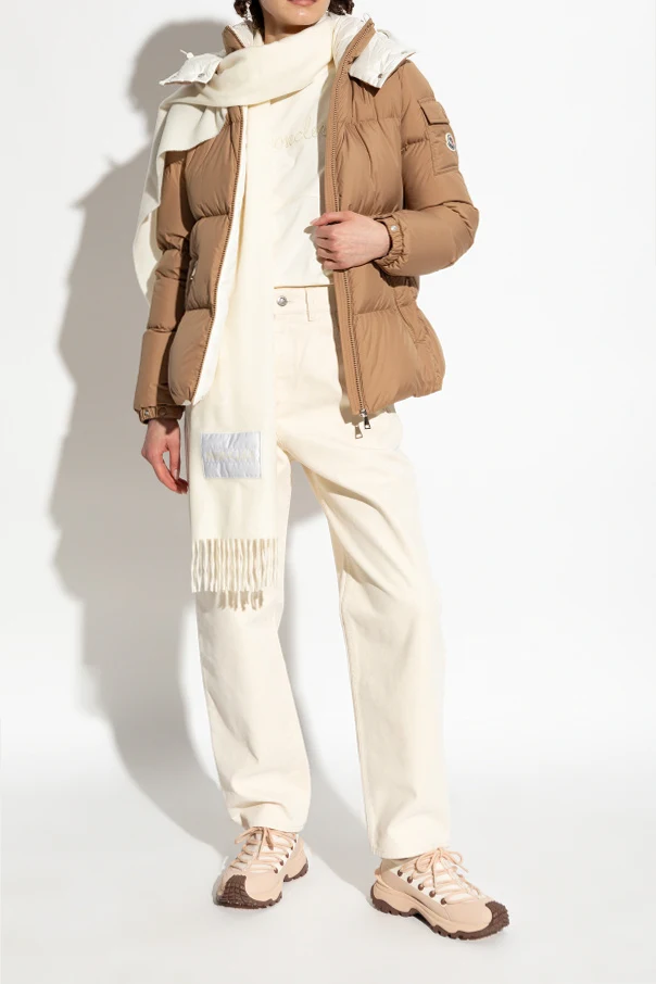 The elegant color palette of pink, beige, and brown, complemented by contrasting details like the dark brown sole and beige laces, exudes a sophisticated charm. A prominent MONCLER logo embellishes the side, while the interior is lined with plush material for an indulgent wearing experience.