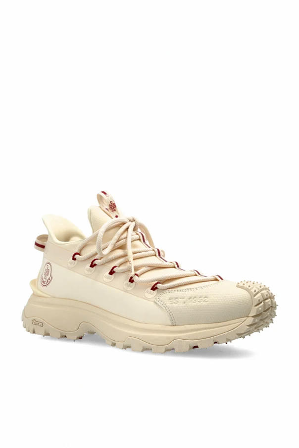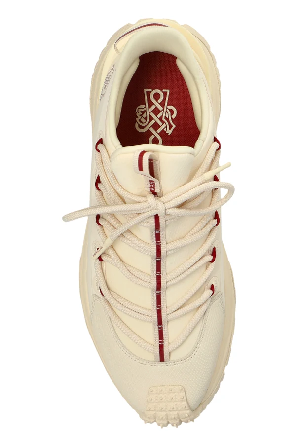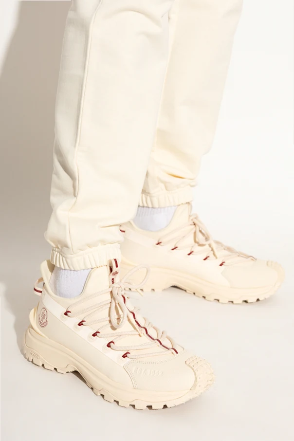 The dominant creamy hue exudes understated luxury, while the iconic Moncler logo , prominently displayed on the sides and tongue, serves as a testament to the brand’s storied heritage. A texturized element with script adorns the front, adding a unique touch to the design.