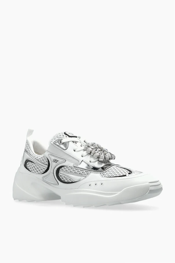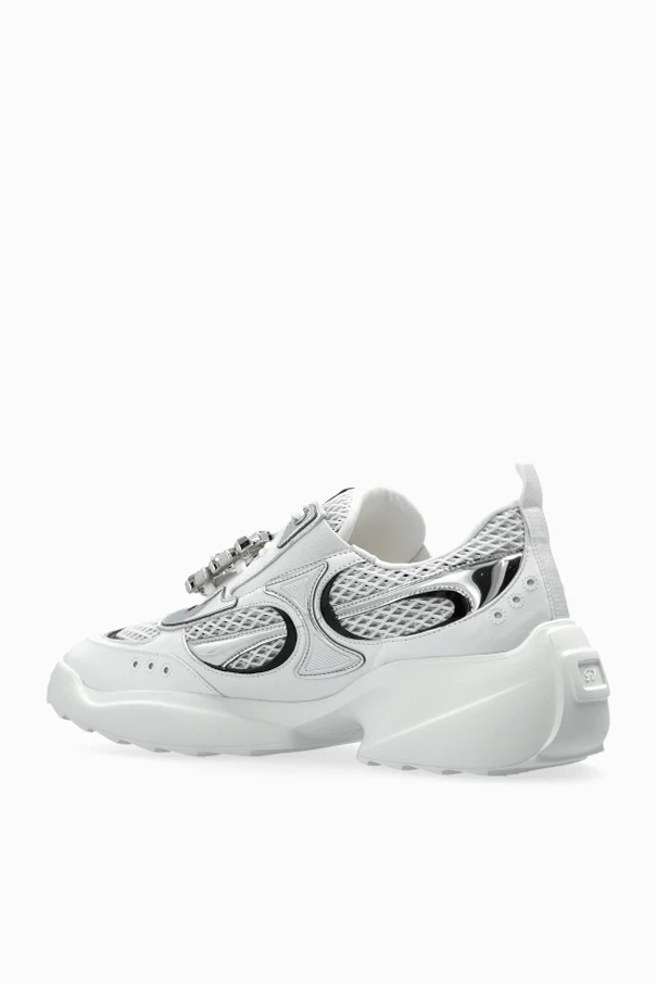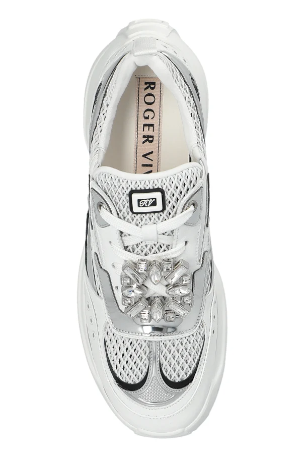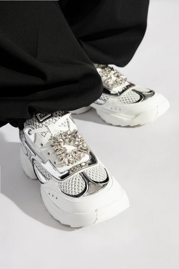 Introducing the exquisite Motor Run sneakers from the illustrious designer Roger Vivier . These exclusive white athletic shoes epitomize the perfect blend of sportiness and sophistication. With a robust sole and a dynamic pattern of curved lines and perforations, these sneakers exude a distinctive character.
