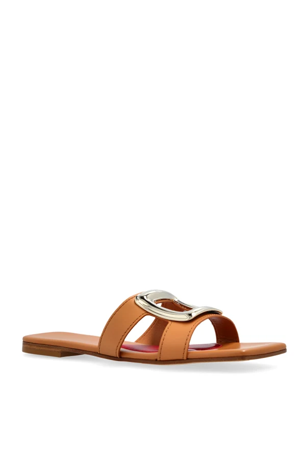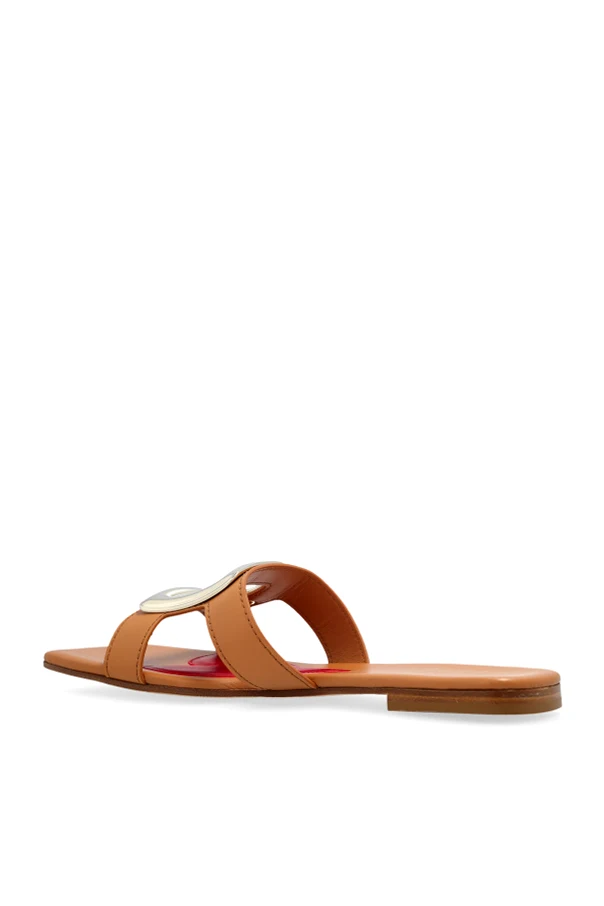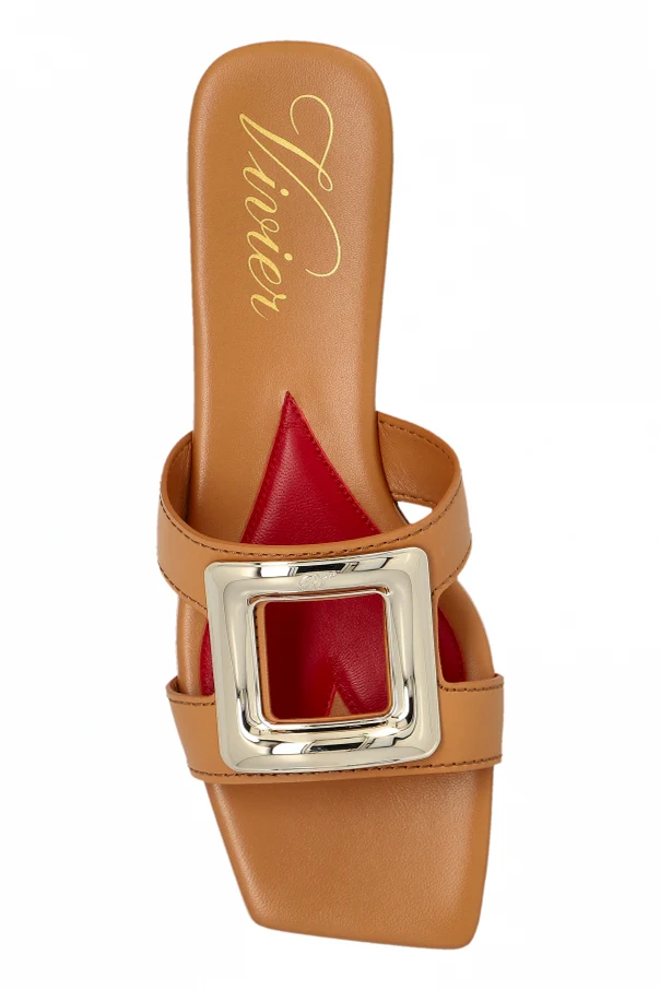 Introducing the exquisite Leather Slides by the esteemed designer Roger Vivier . These sandals, crafted from the finest leather, are a testament to sophisticated minimalism. The rich brown hue, complemented by a flat sole and a slightly rounded square toe, exudes understated elegance.