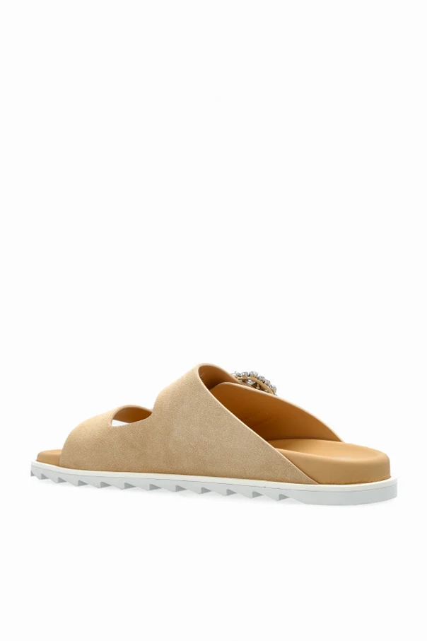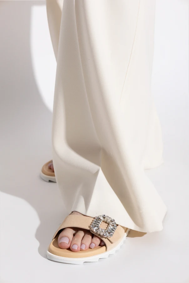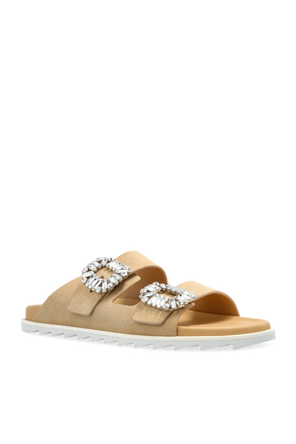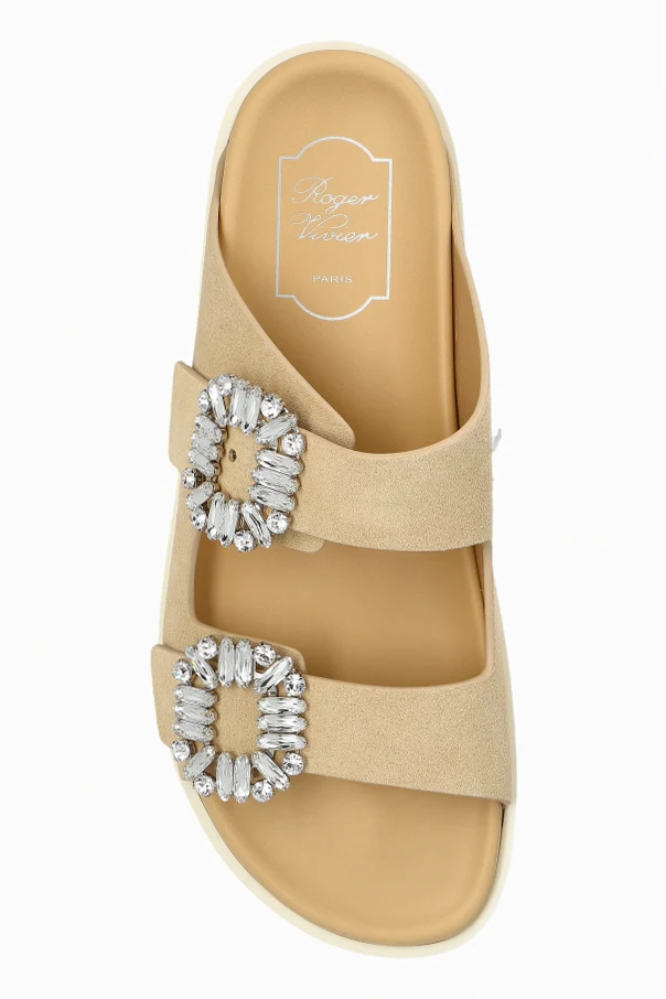 Introducing the exquisite Suede Slides with Shimmering Embellishments from the exclusive collection of renowned designer Roger Vivier . These slides epitomize a harmonious blend of luxury and comfort , perfect for sunlit summer days.