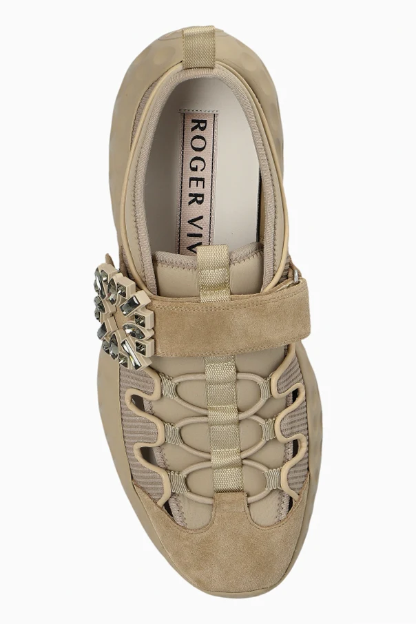 Cloaked in a refined beige palette, discreet stitch detailing and molded panels create a subtle interplay of textures. Attention is drawn to the oversized decorative buckle—a luminous, crystal geometric flower—artfully set asymmetrically above the elegant velcro fastening. The Roger Vivier insignia is meticulously printed on the insole and intricately embroidered on the heel, affirming its provenance.