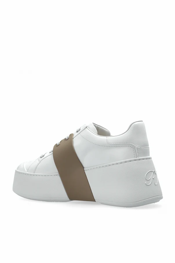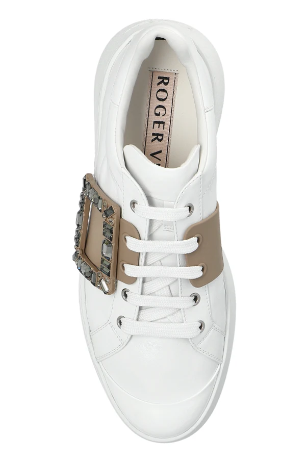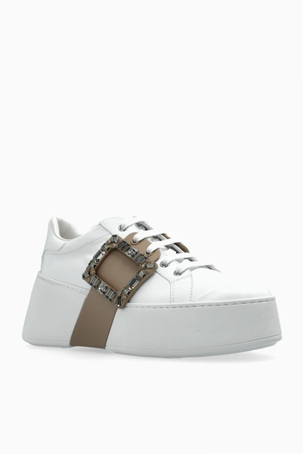 Experience the avant-garde allure of the Viv Skate Platform Sneakers by Roger Vivier—a seamless union of modern design and refined luxury. These athletic low-tops are expertly crafted from pristine white leather, boldly punctuated by a wide beige leather band crossing the midfoot.