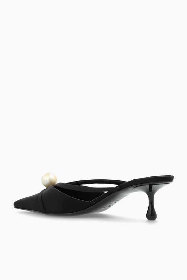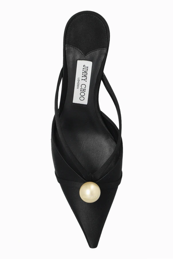 Envisioned by the acclaimed house of Jimmy Choo , the Sana mules embody a refined fusion of contemporary allure and classic sophistication. Crafted with a lustrous, satin-like upper, these black heeled slides highlight an elongated, pointed toe silhouette, lending a distinctly graceful and slender aesthetic. Exquisite, slender straps elegantly cross the instep, their delicacy contrasted by a singular, opulent adornment—a sizeable pearl at the toe’s center, evoking understated splendor.