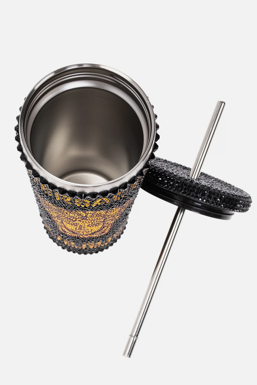 Black and gold-tone travel mug from Versace Home. Made of aluminium. Entirely embellished with crystals, this item is also enriched by the iconic Medusa head, logo detail and Greca pattern, epitomizing the Versace glamour. Comes with a silver-tone metal straw.