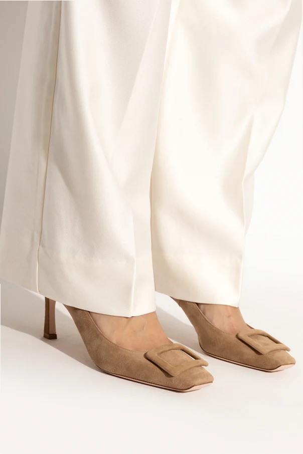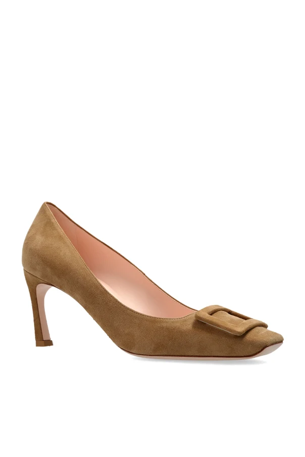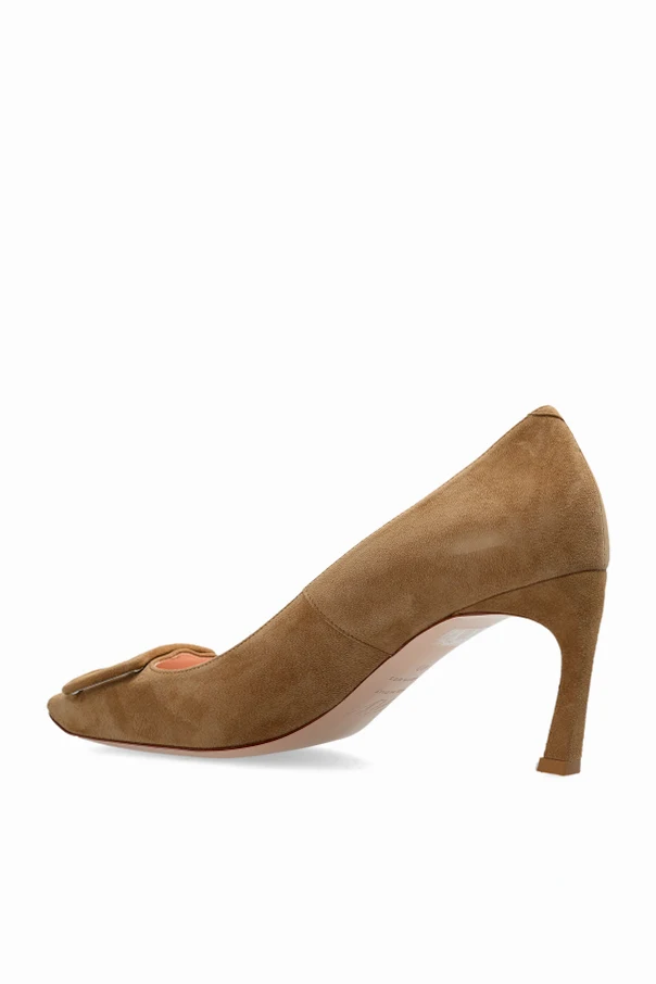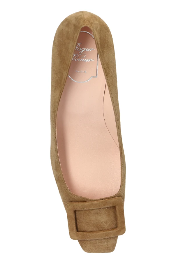 A statement oversized buckle, meticulously wrapped in matching suede, adorns the toe—an iconic hallmark of Roger Vivier’s artistry. The interior features a pale blush lining and a sculpted leather insole embossed with the distinguished ‘Roger Vivier Paris’ insignia, reflecting unparalleled attention to detail and craftsmanship.