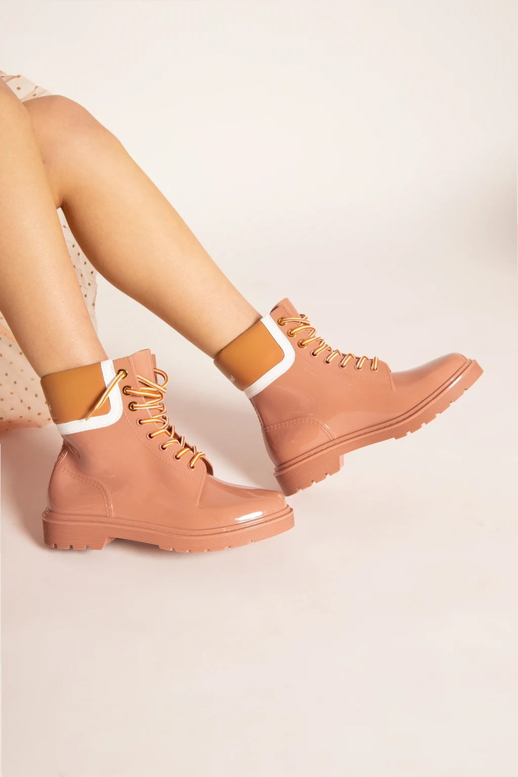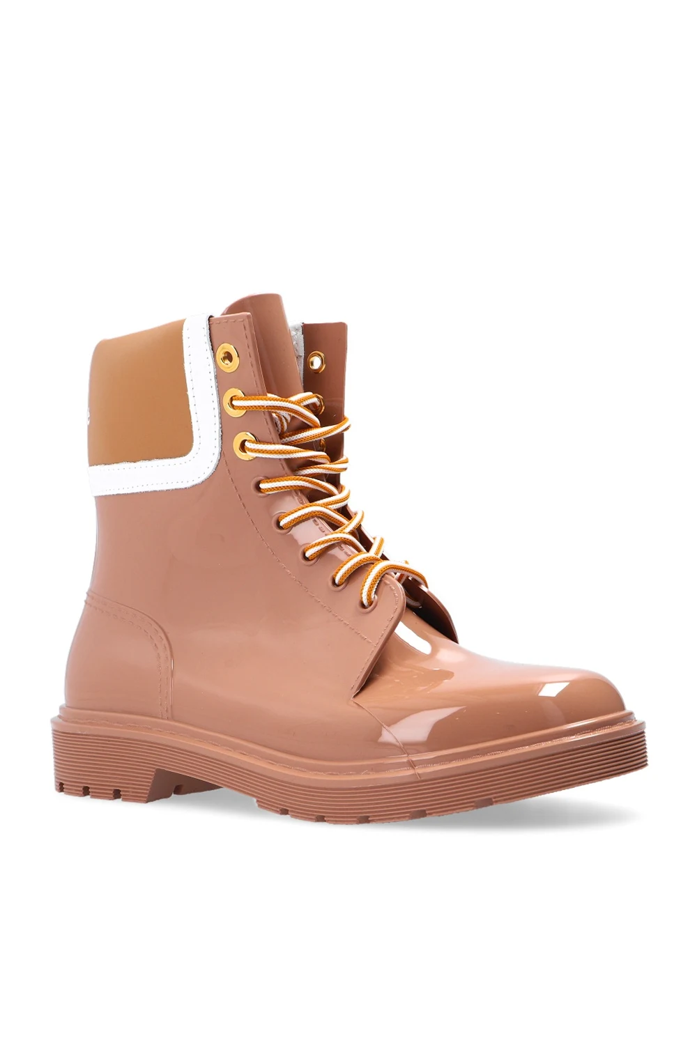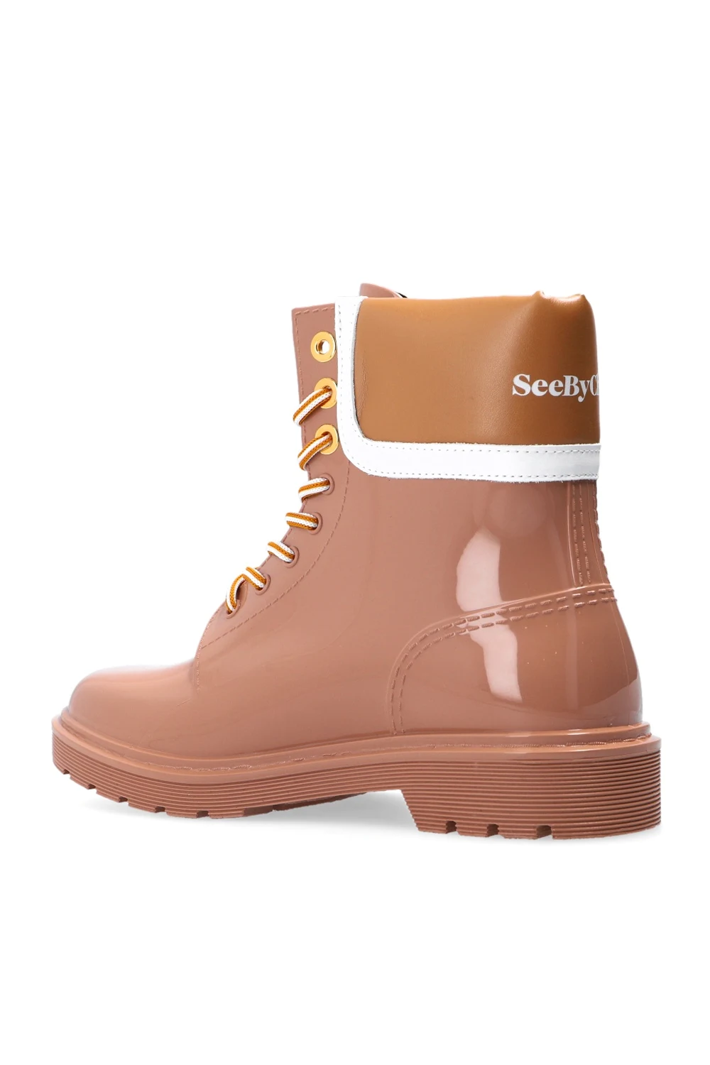 Brown 'Florrie' rain boots from See By Chloé. Crafted in rubber, this lace-up pair sits on a brown rubber sole and showcases a white logo print for the brand recognition.