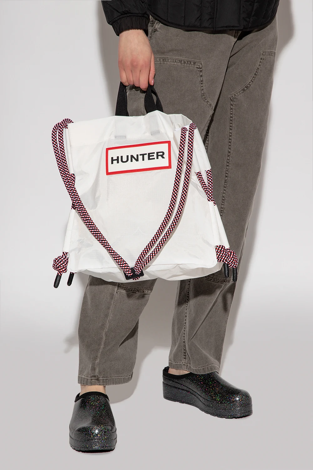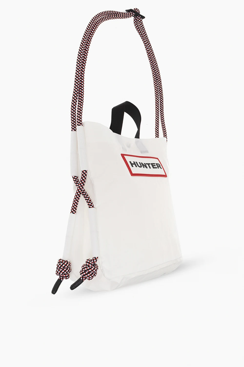 White shoulder bag from Hunter. Crafted from recycled waterproof fabric, this design fastens with a snap button and is decorated with a rubber logo detail in white and red. It is complete with three pockets at the back, two half-round handles in black, metal hardware in silver-tone and black as well as one internal compartment with one zip pocket.