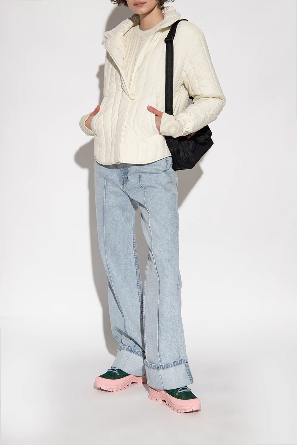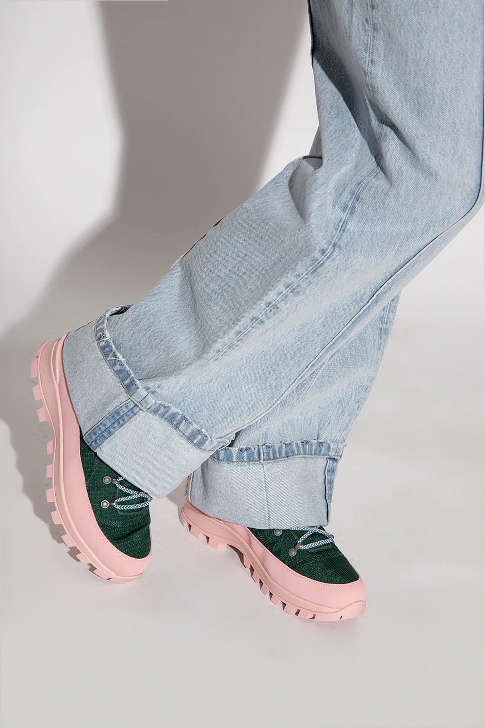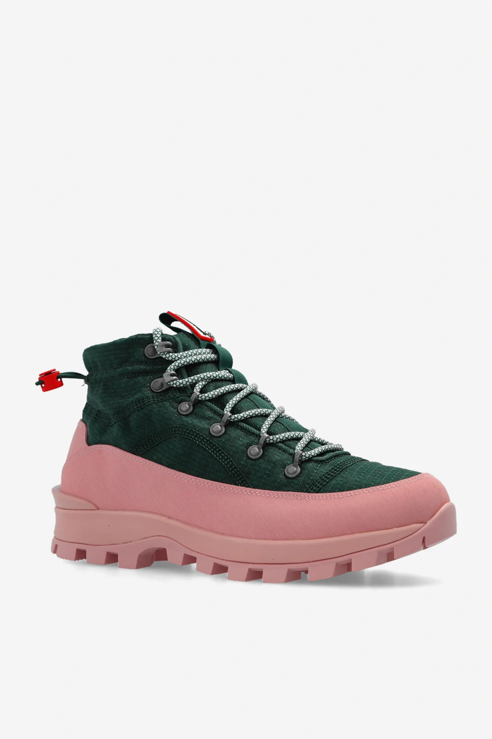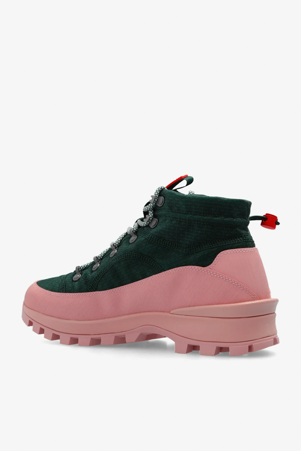 Pink and dark green ‘Travel Explorer’ lace-up boots from Hunter. Made of recycled waterproof fabric and TPU, this lace-up pair features a logo patch in white, red and black, drawstrings and brown rubber sole provides extra grip for all terrains. Capable of repelling light to moderate rain showers.