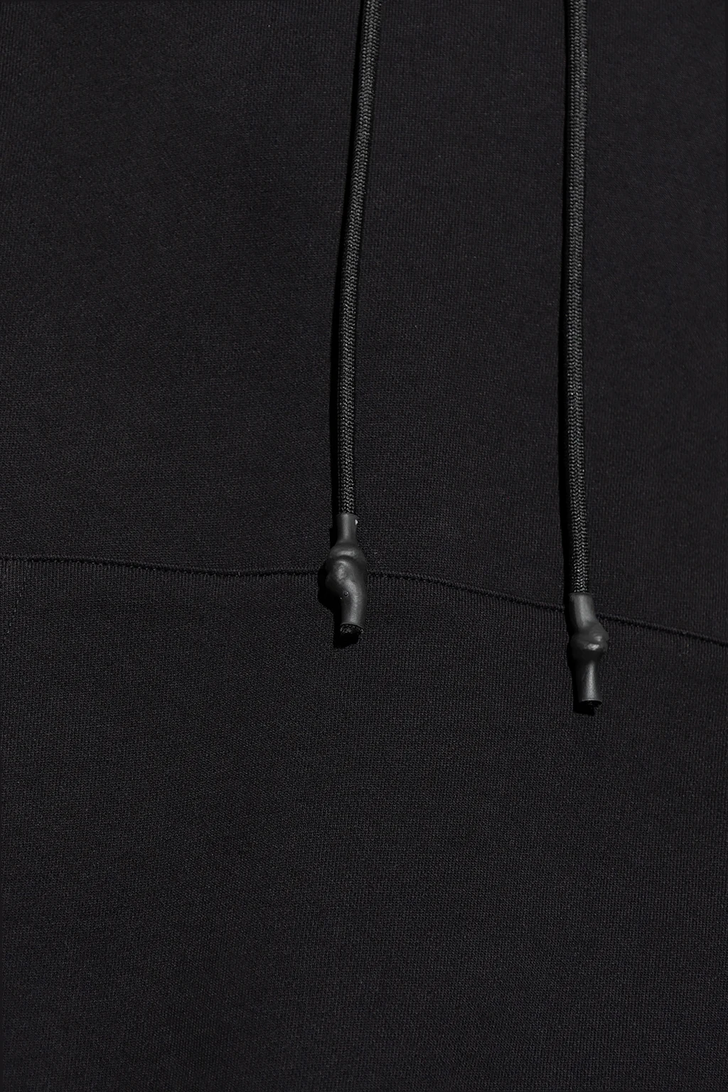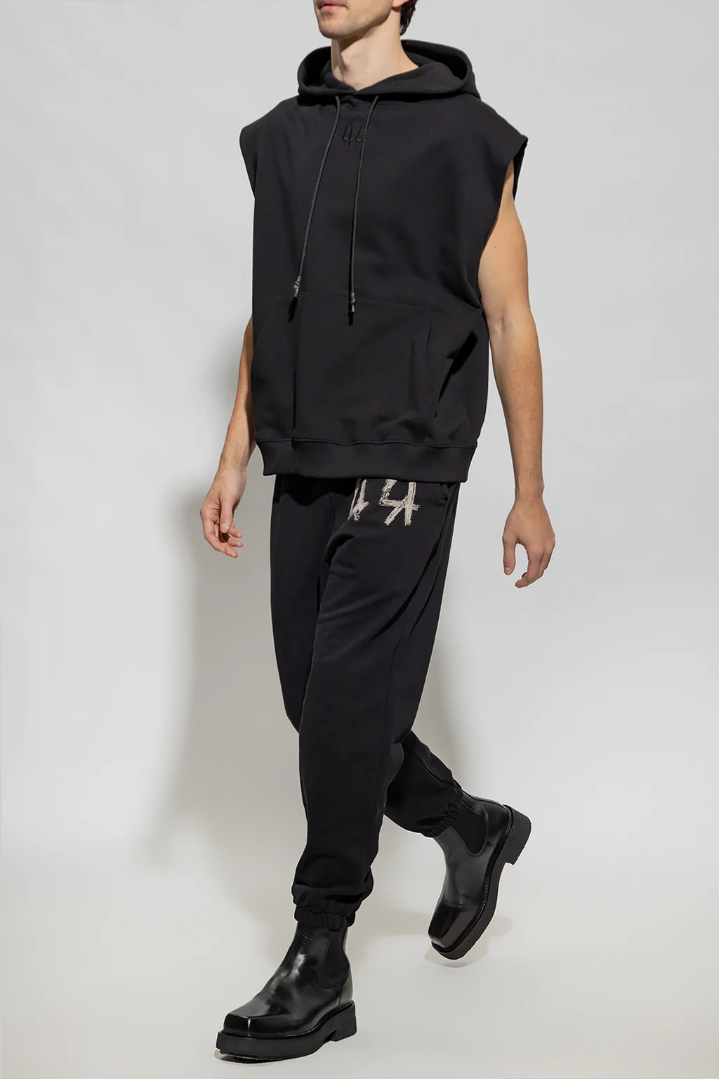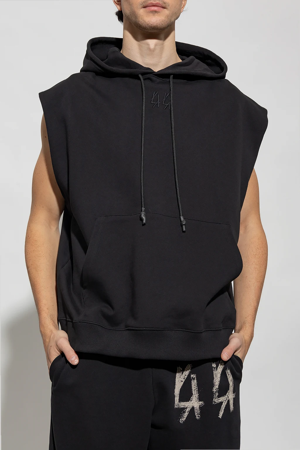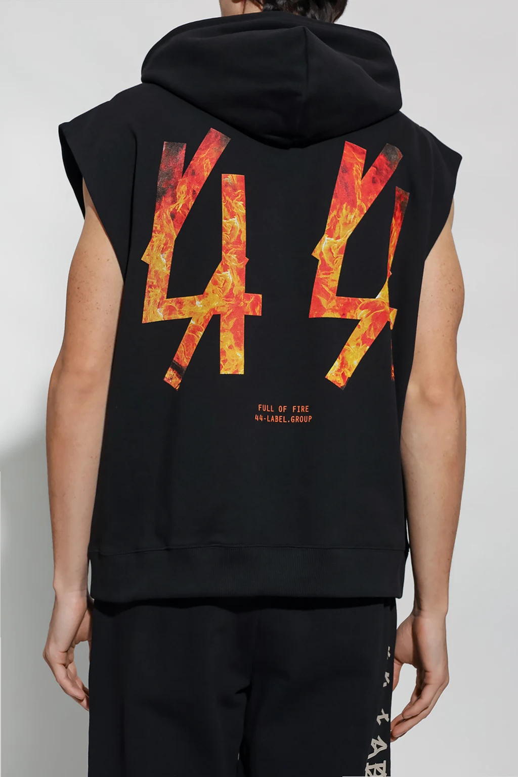 Black sleeveless sweatshirt with a drawstring hood from 44 Label Group. Crafted from cotton jersey, this style features logo embroidery accompanied by a kangaroo pocket on the front, an orange, yellow and black flames graphic at the back and an elasticated trim on the bottom hem.