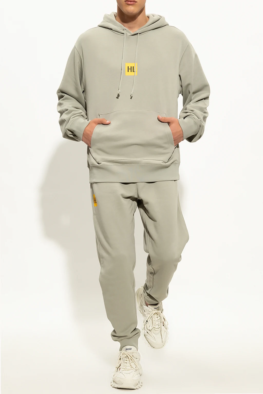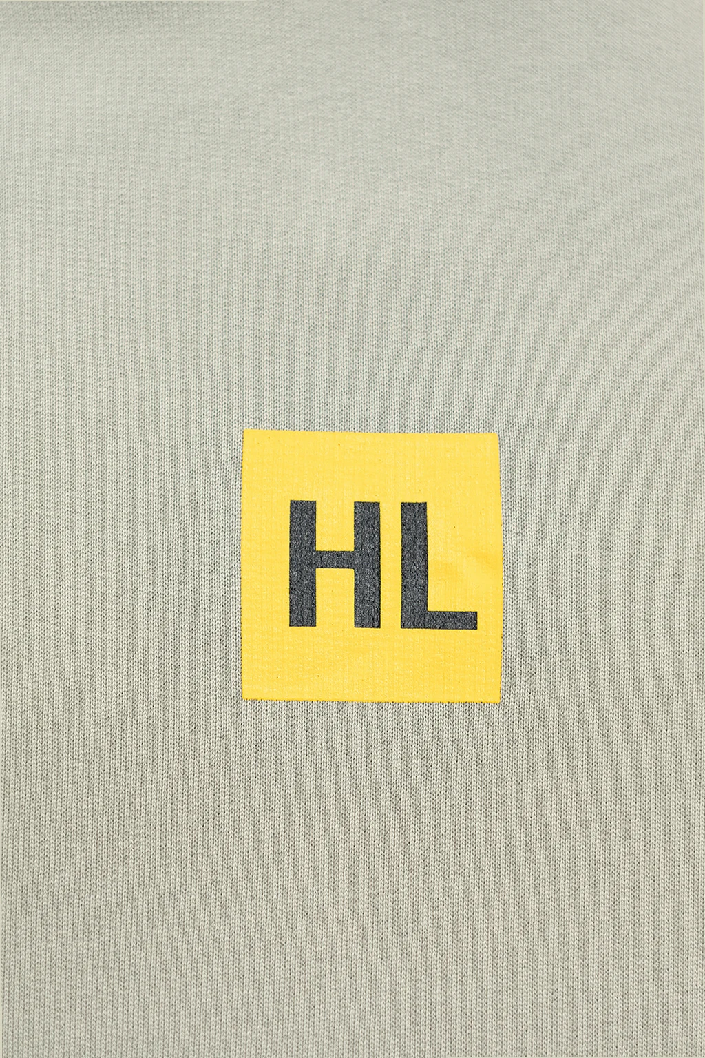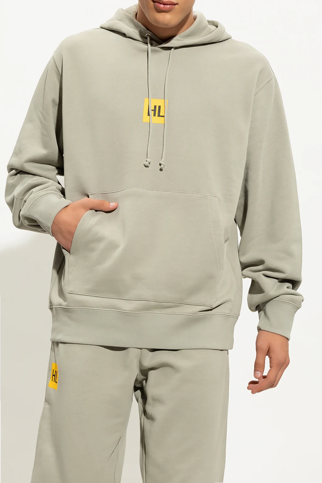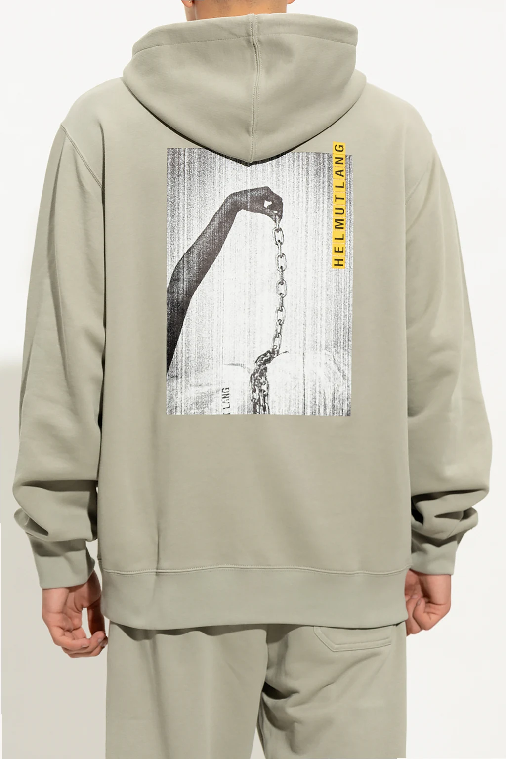 Greenish grey hoodie from Helmut Lang. Made of cotton, this garment features a yellow and black logo print, drawstring hood, slip pocket and ribbed trims at the hem and cuffs.