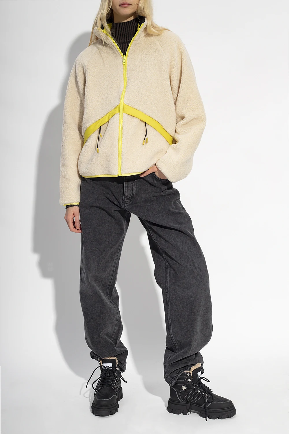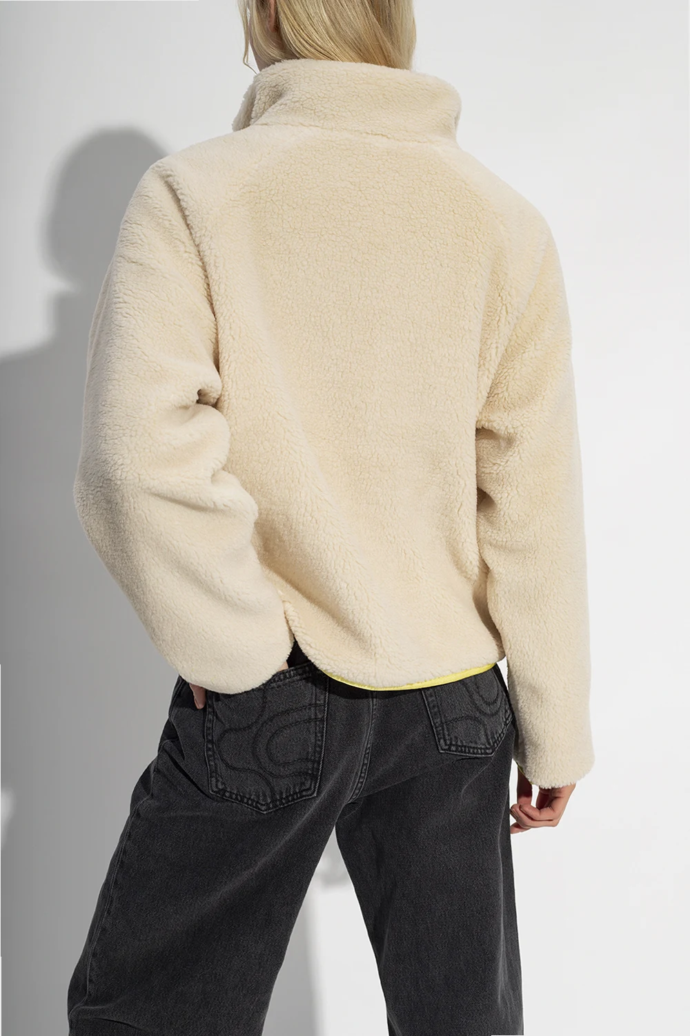 Reversible jacket with a stand collar from Woolrich. Fastened with a zip, this garment features two zip pockets and trimming at the sleeves and hem. One side is made of cream fleece, the other is yellow and crafted from fabric.