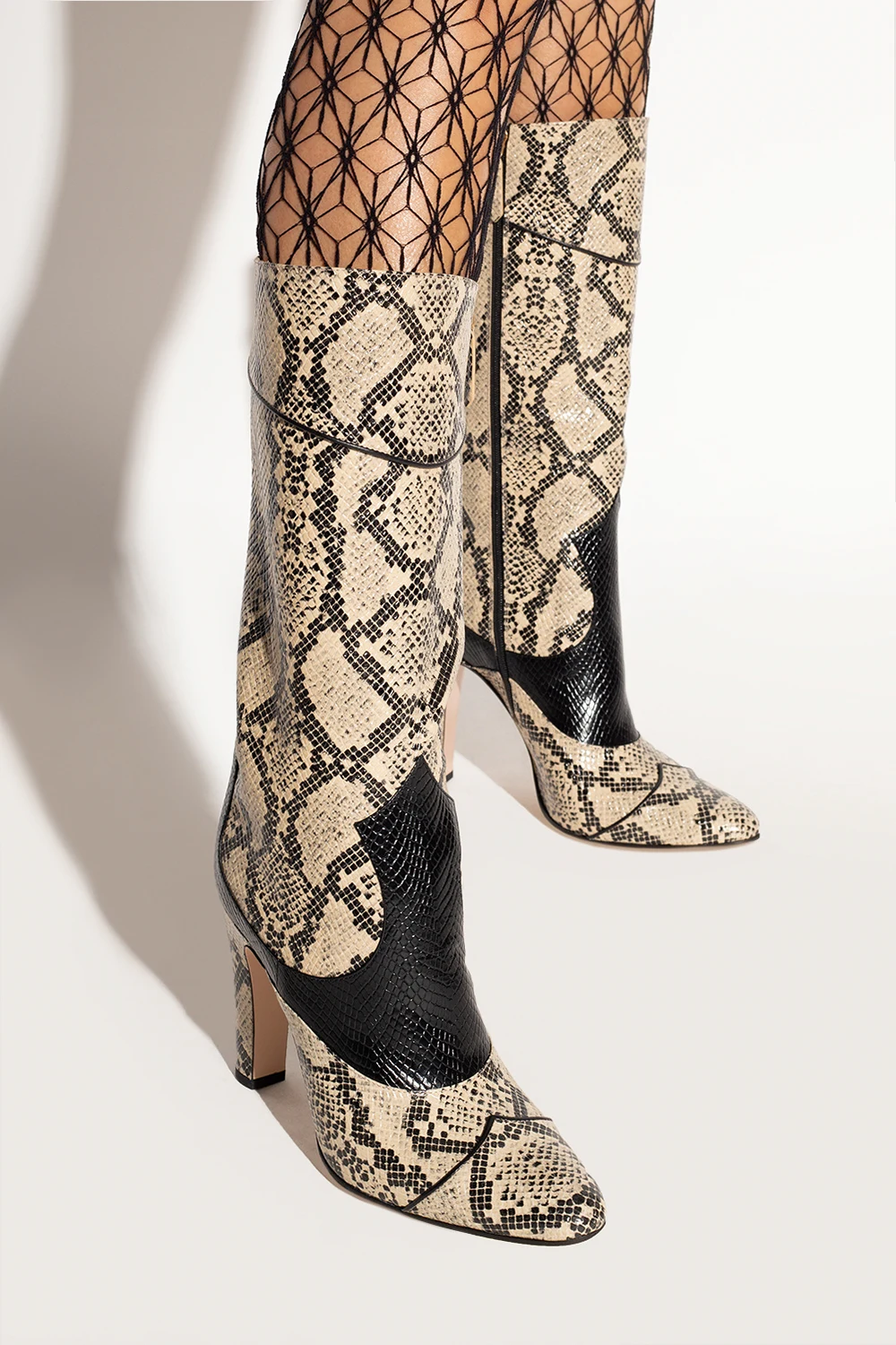 Light beige and black heeled boots from Gucci. Crafted from leather with a python skin effect, this model sits on a light beige leather sole and features a side zip fastening.