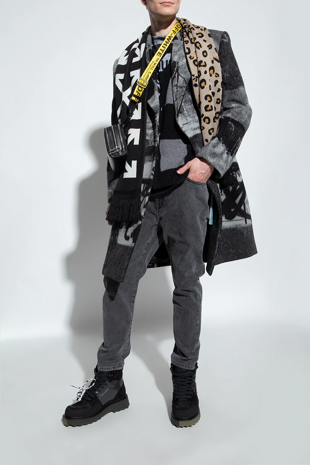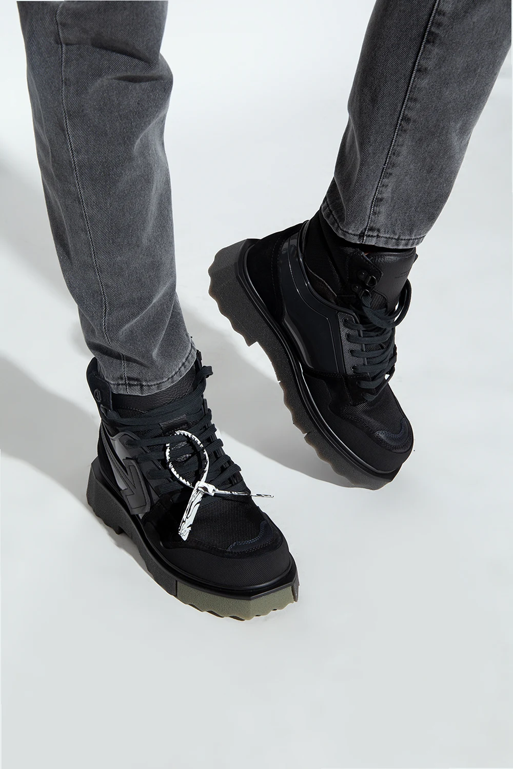 Black ‘Hiking’ boots from Off-White. Trimmed with leather and suede, this lace-up pair features a logo embossed on the tongue, black patch, the label’s signature black and white zip tie and rubber sole in dark grey and green.