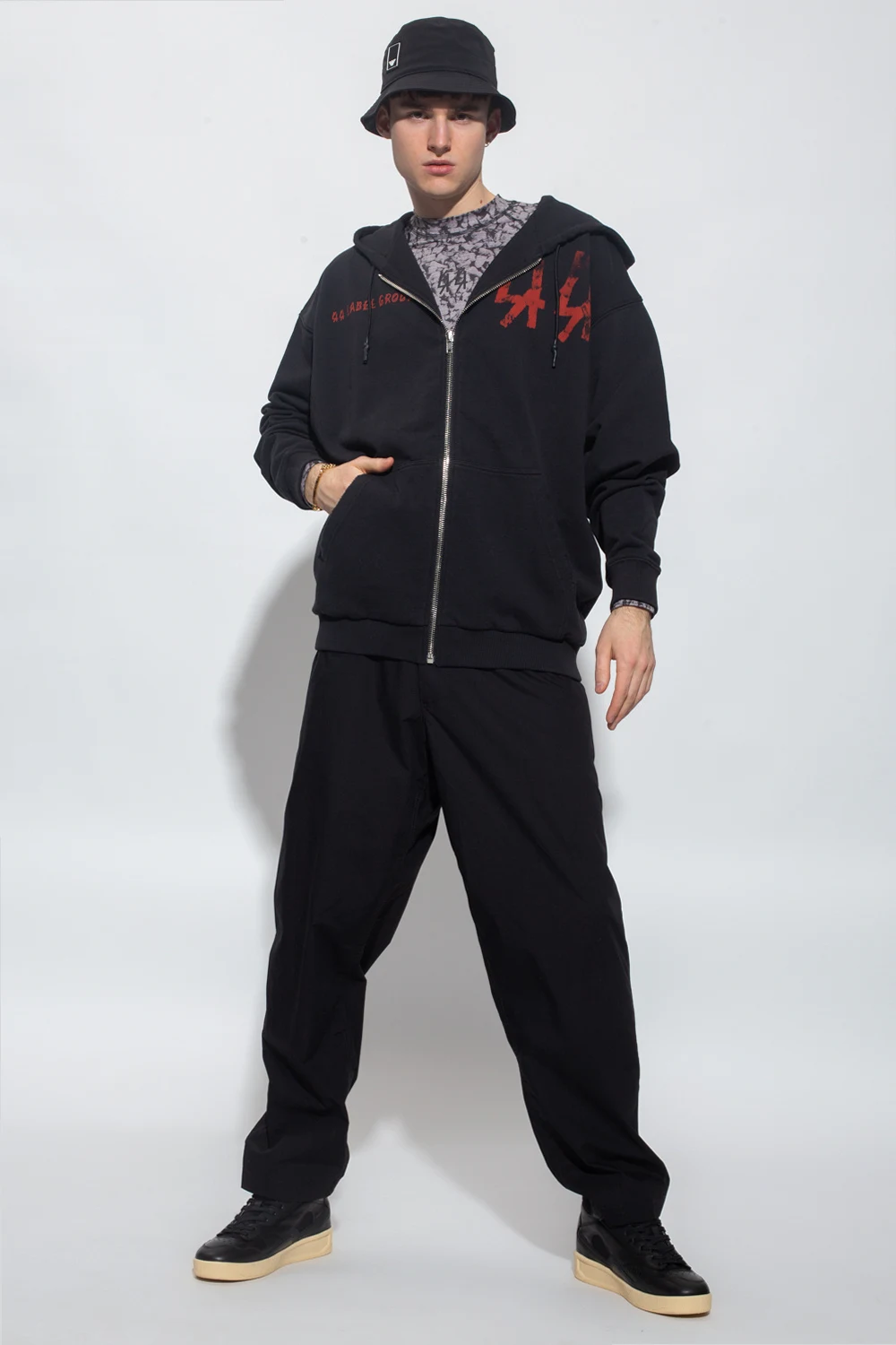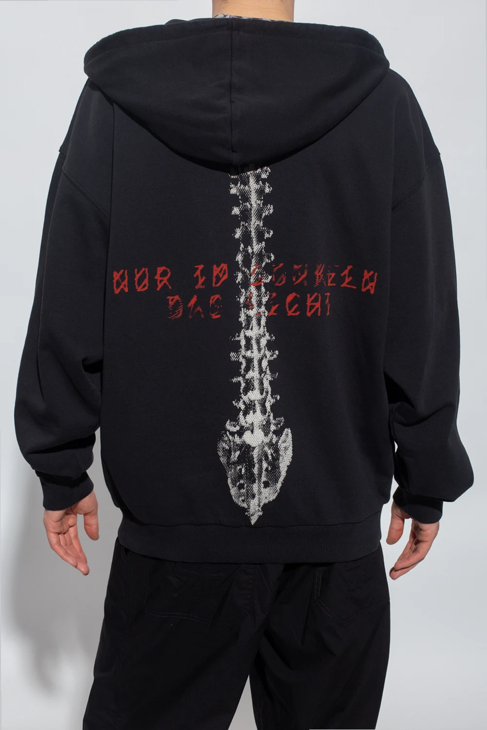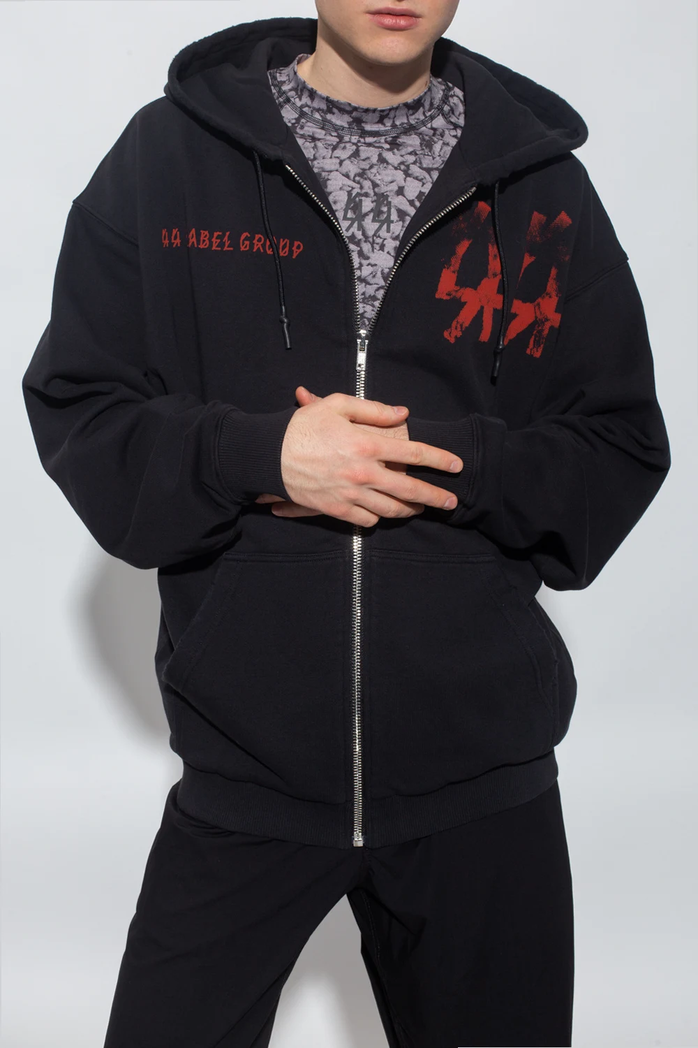 Black ‘44 Spine’ sweatshirt from 44 Label Group. Made of cotton, this garment features a zip fastening, drawstring hood, print and logo in red and cream.