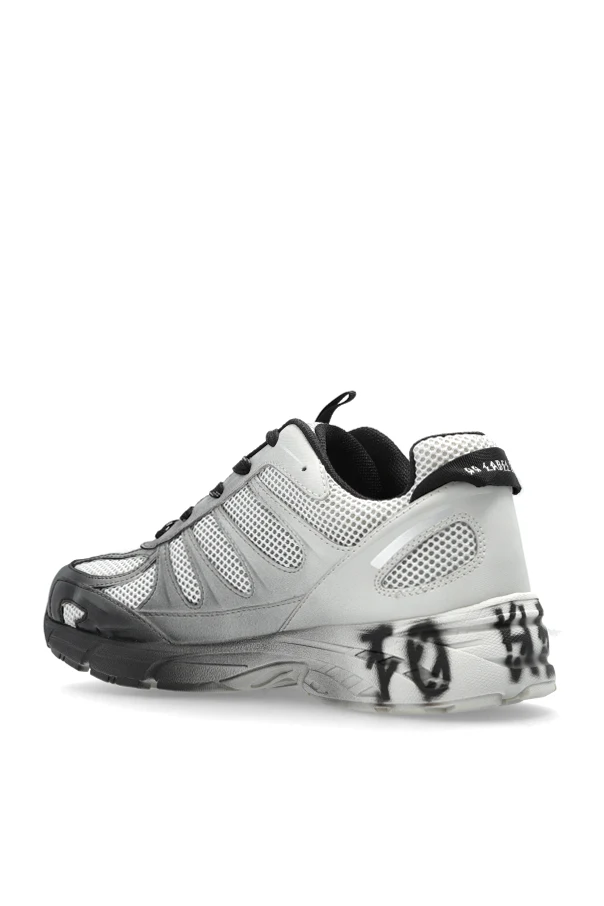 The meticulously layered upper combines breathable perforated mesh with sleek synthetic and textile-leather panels, capturing the brand’s dedication to exceptional materials and comfort. Signature graffiti-inspired black lettering on the sole adds a bold, artistic edge, while distinct designer logos embellish the tongue and heel, underscoring exclusivity.