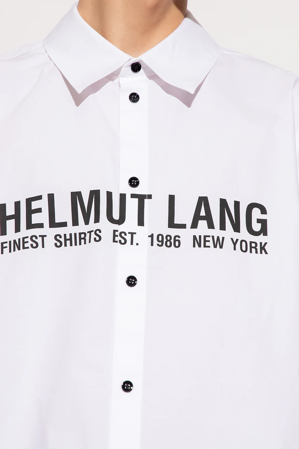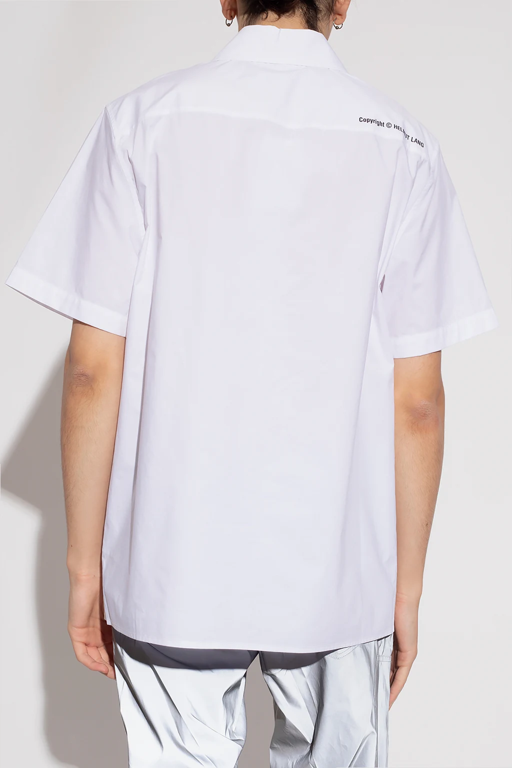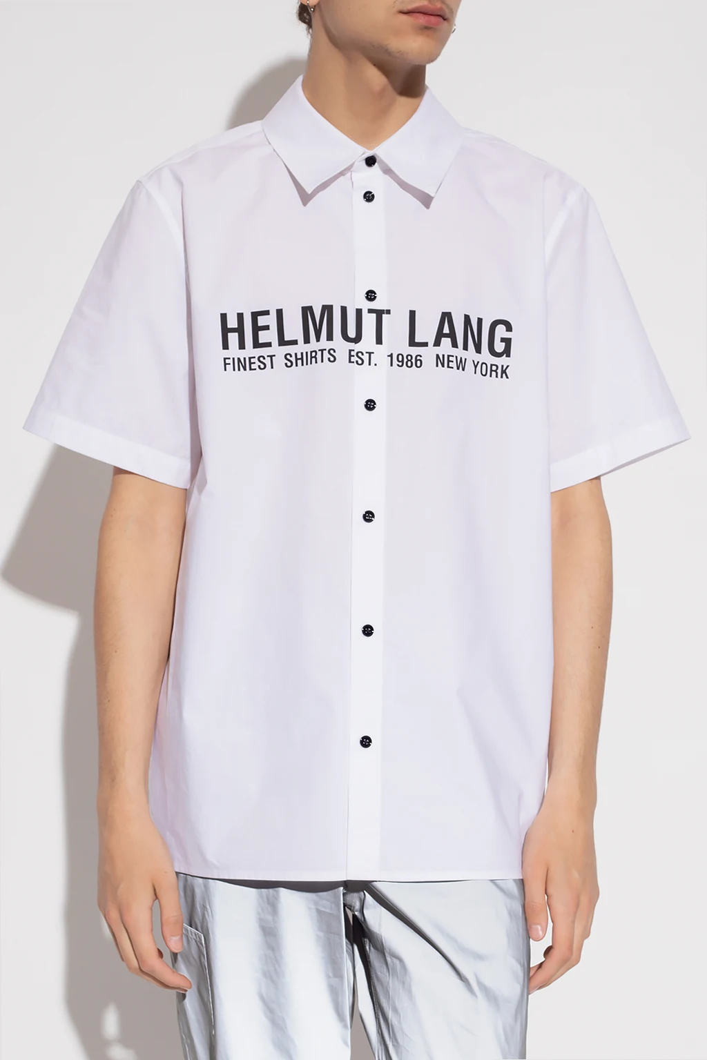 White shirt from Helmut Lang. Made from cotton, this style features button fastenings, short sleeves and a black graphic print with the brand\'s logo.