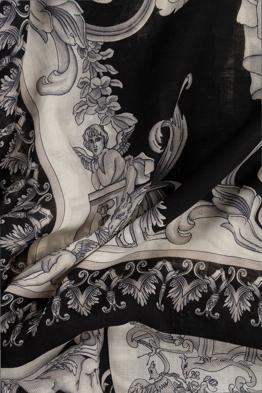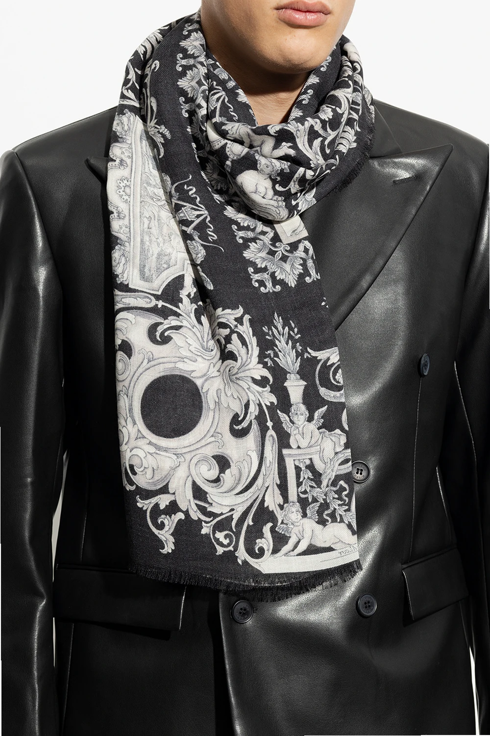 Black shawl from Versace. Crafted from a wool and silk blend, this style showcases the brand\'s signature Silver Baroque pattern in white and grey, and raw hems.