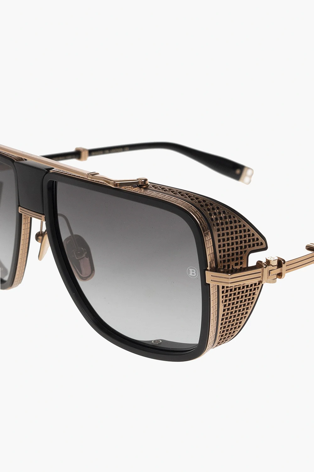 Black and brass-tone ‘O.R.’ sunglasses from Balmain. This aviator pair is made of matte materials and features vintage style elements with black titanium side shields, double bridge with a logo, adjustable nose pads, logo-shaped tips and grey gradient lenses with 100% UV protection. Comes with a case.