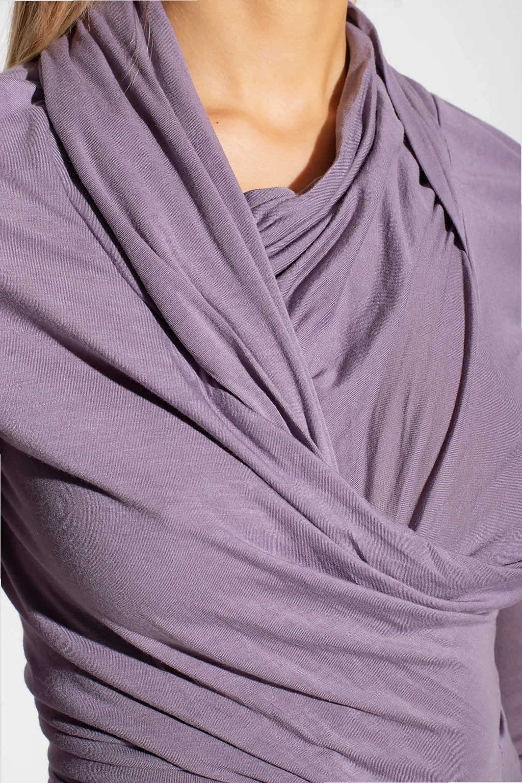 Purple top from Rick Owens Lilies. This long sleeve design features decorative gathers and raw cut edges.