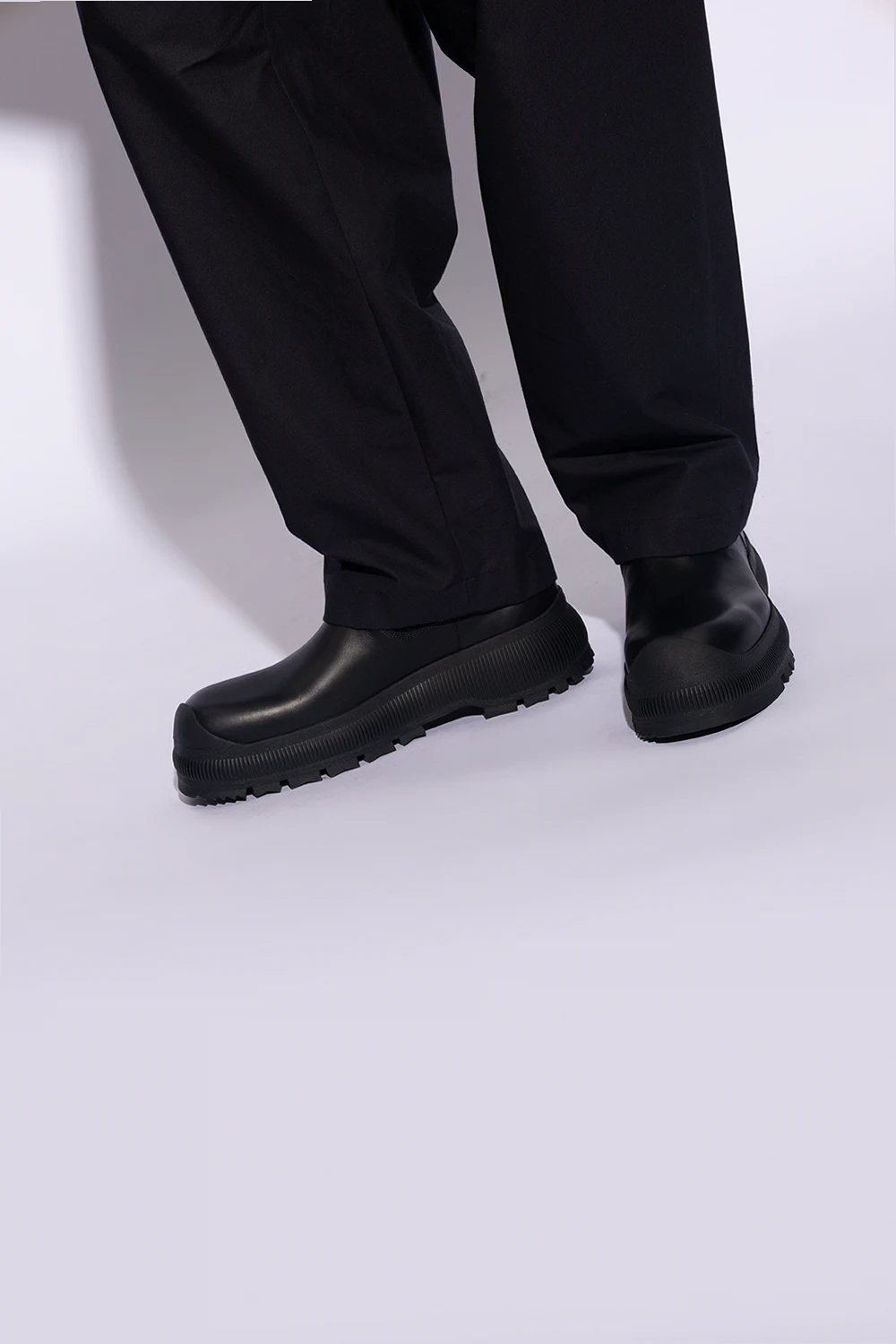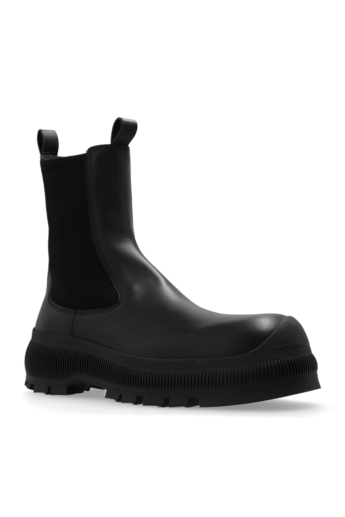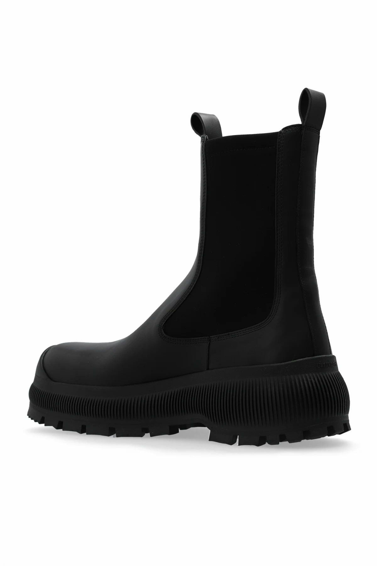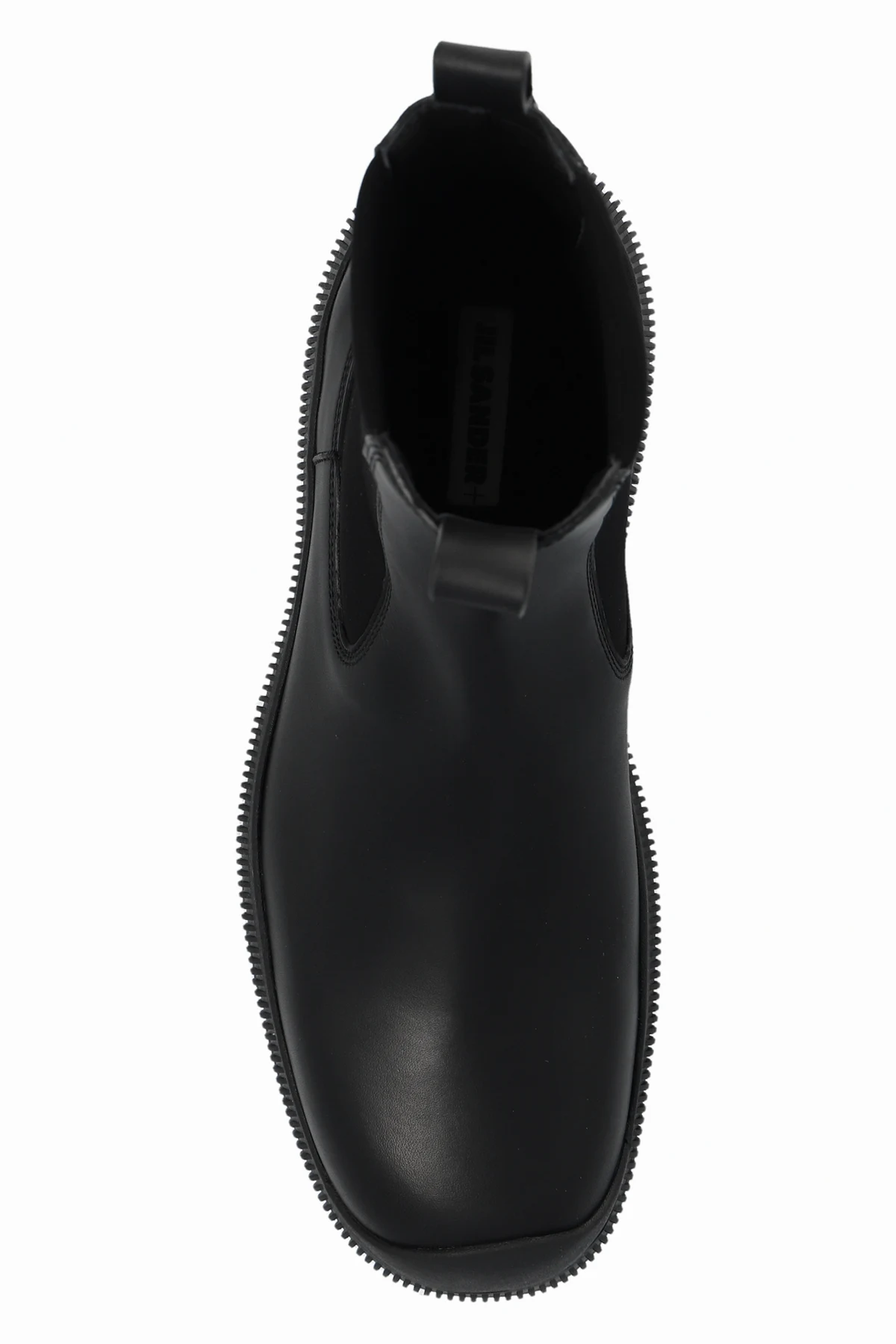 Black Chelsea boots from JIL SANDER+. Made of leather, this pair features elastic side panels, a black logo at the back and a black rubber Vibram sole.