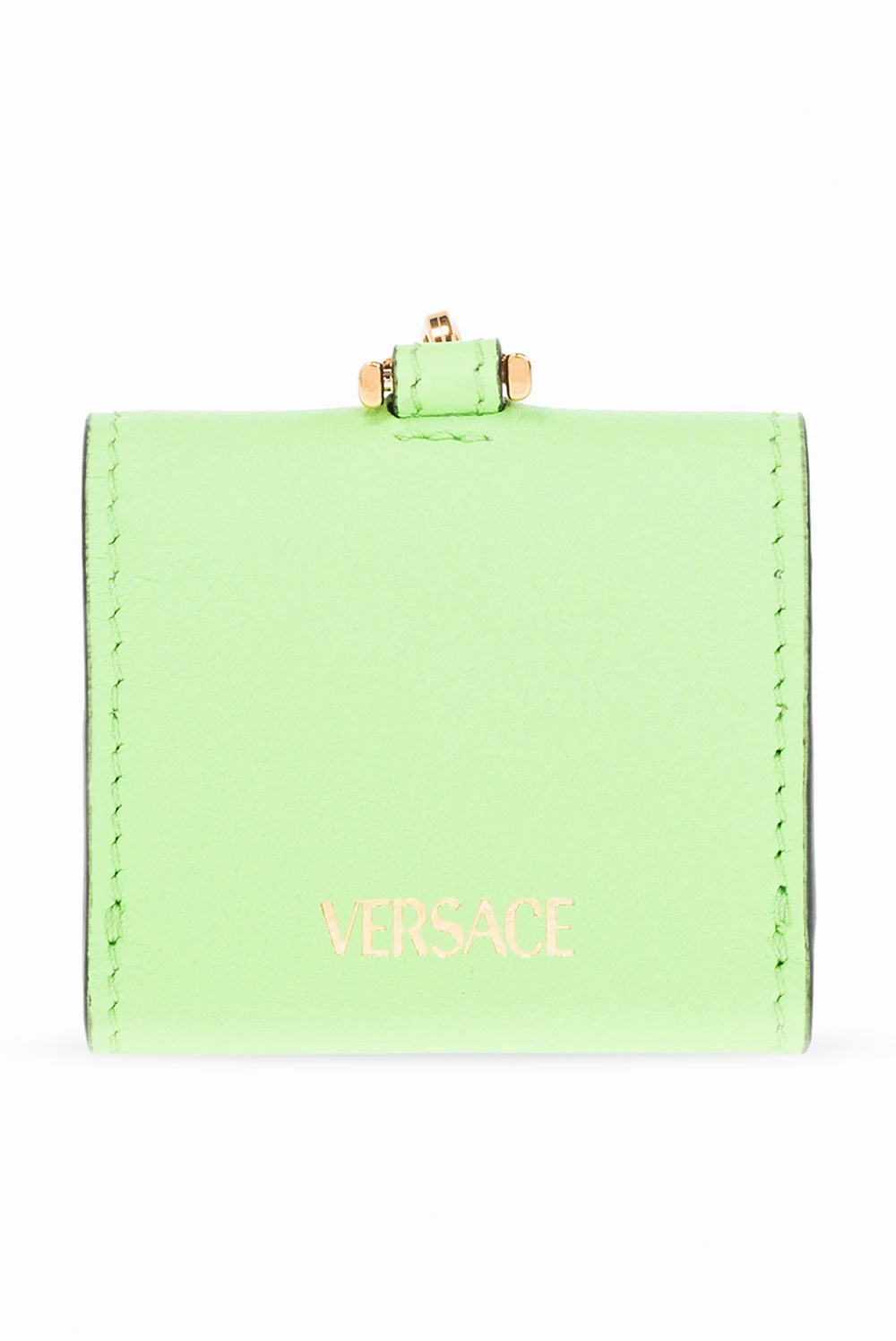 Light green AirPods case from Versace. Made of calf leather, this item secures with a snap and showcases the brand\'s signature Medusa application, a detachable gold-tone neck strap and a purple-clad interior.
