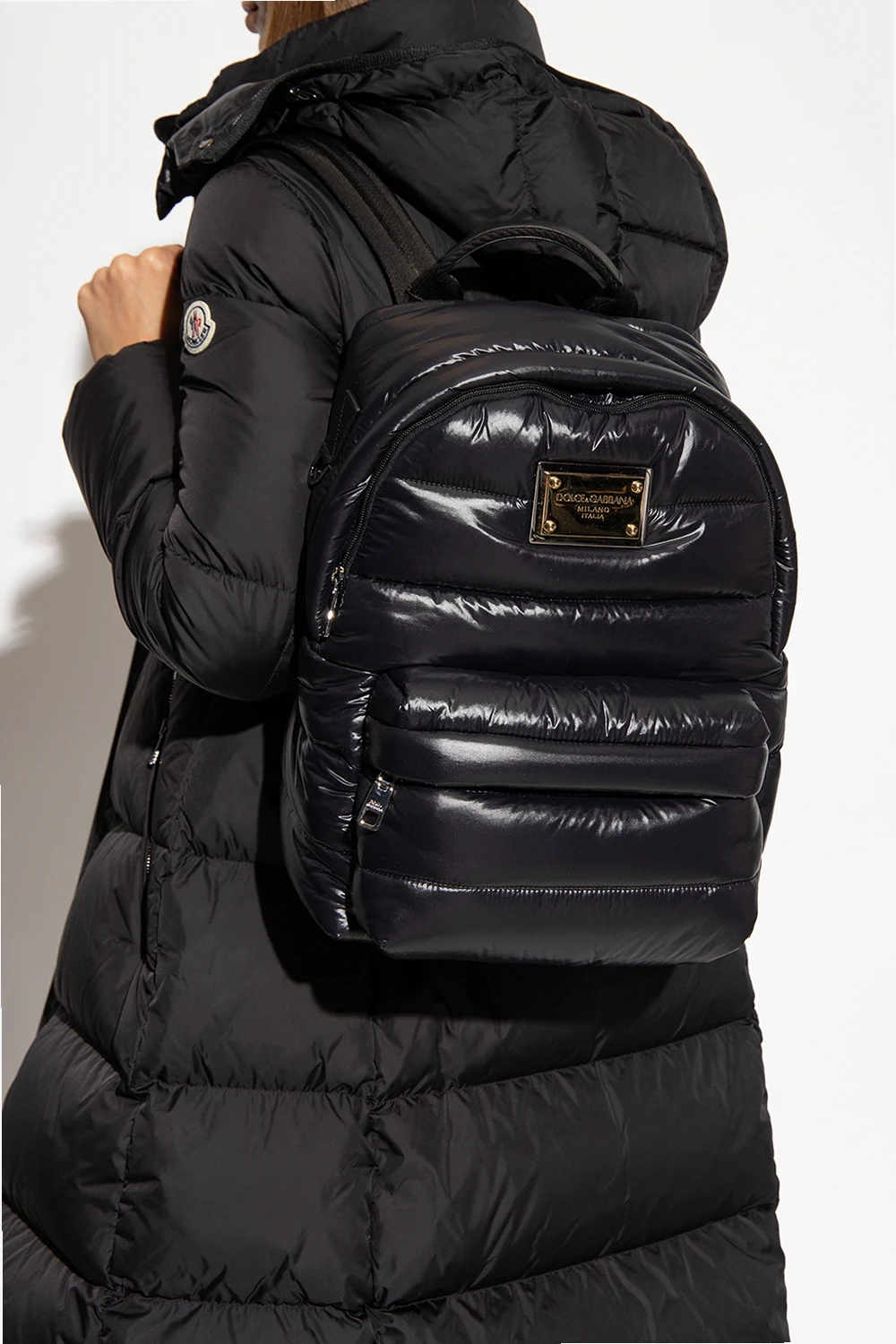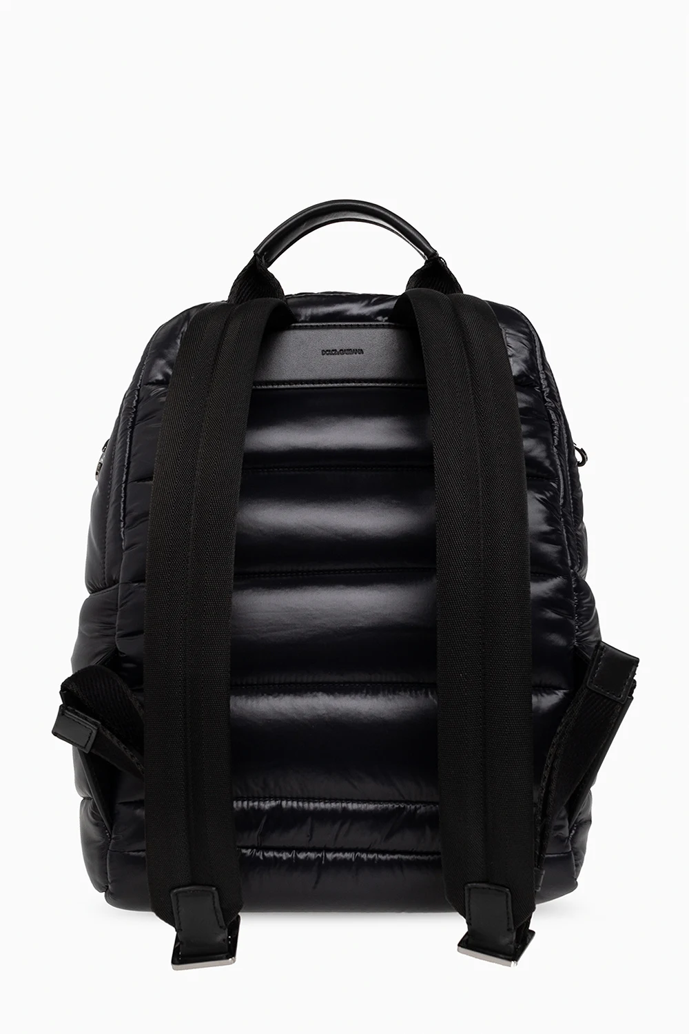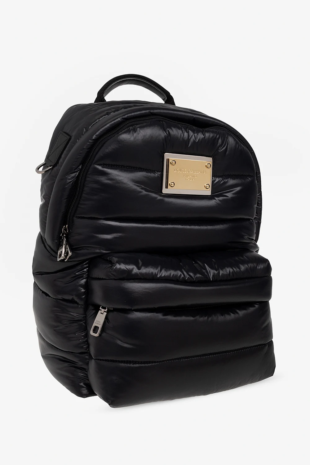 Black quilted backpack from Dolce & Gabbana. Crafted from technical fabric with a shiny finish and calf leather trims, this model is complete with a zipped front pocket, metal logo-engraved appliqué, top handle, adjustable shoulder straps, gold-tone and dark silver-tone metal hardware and one internal compartment with one slip pocket and one zip pocket.