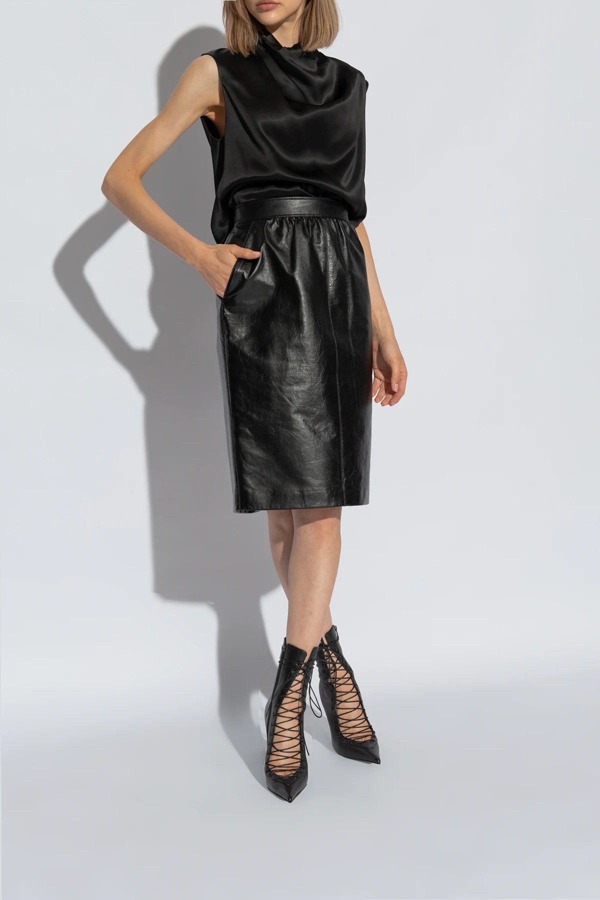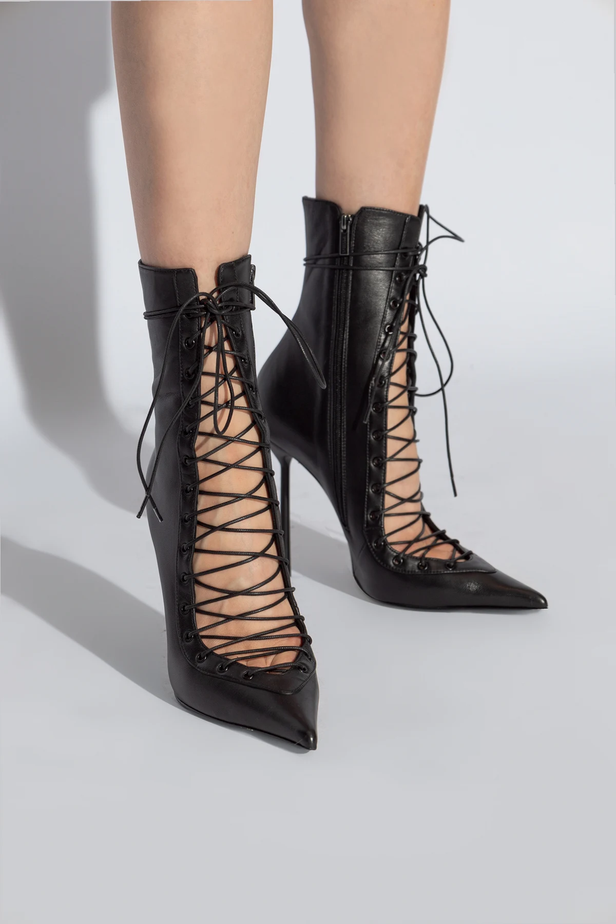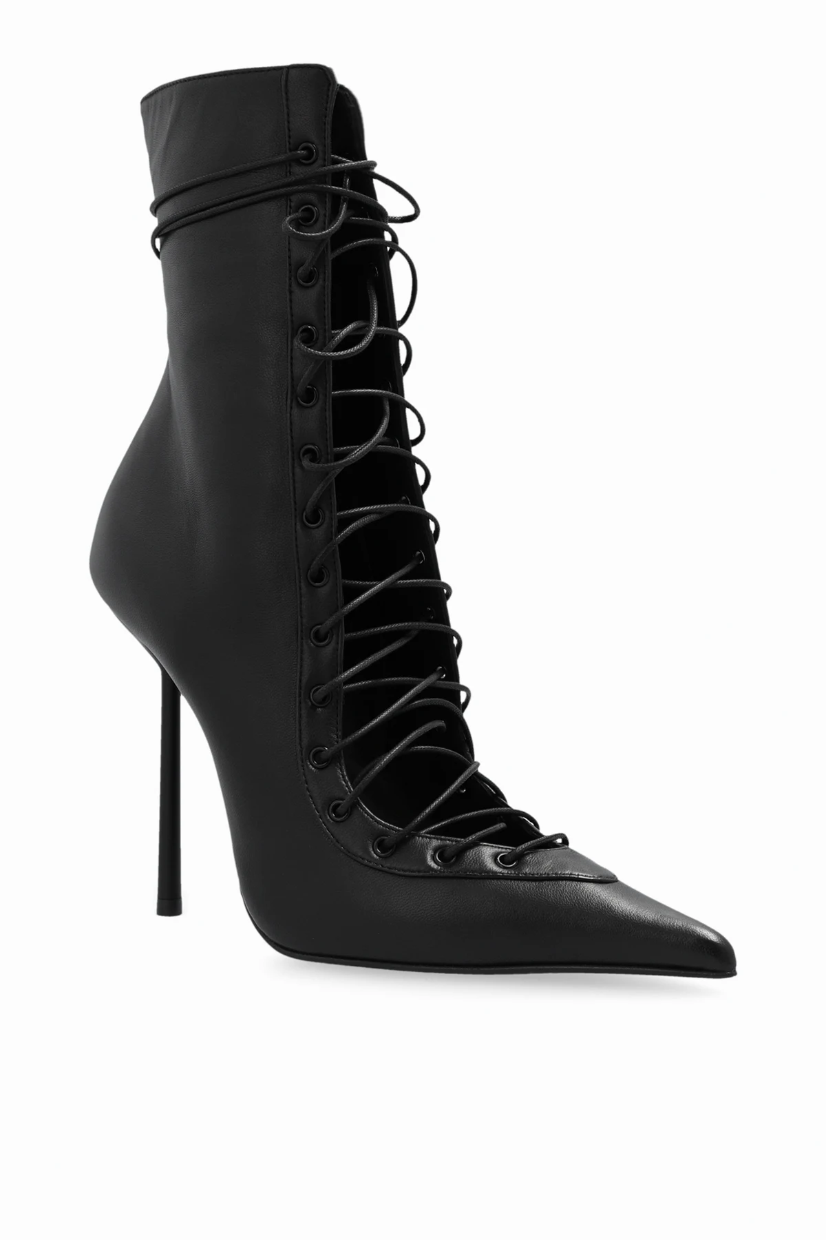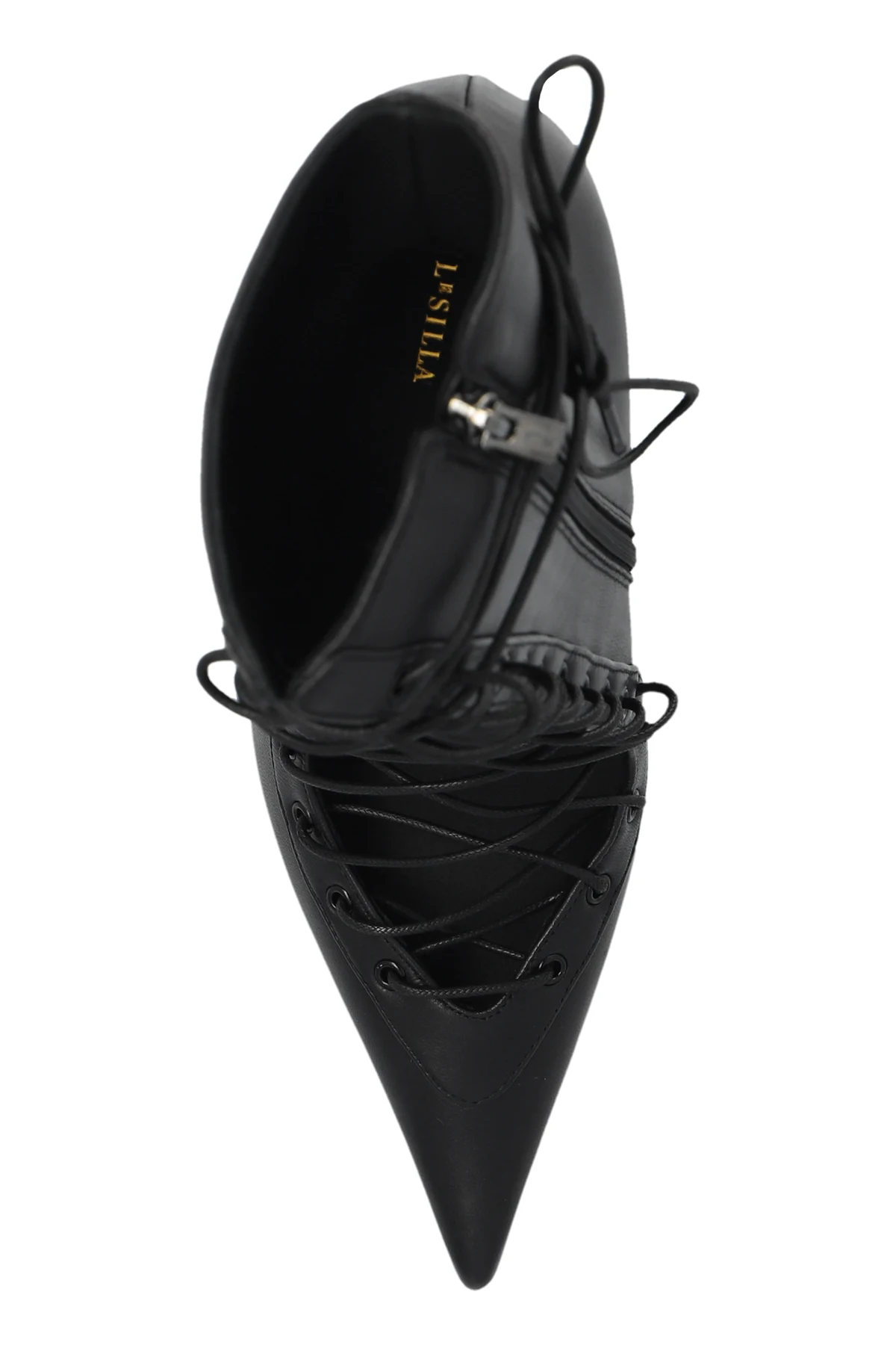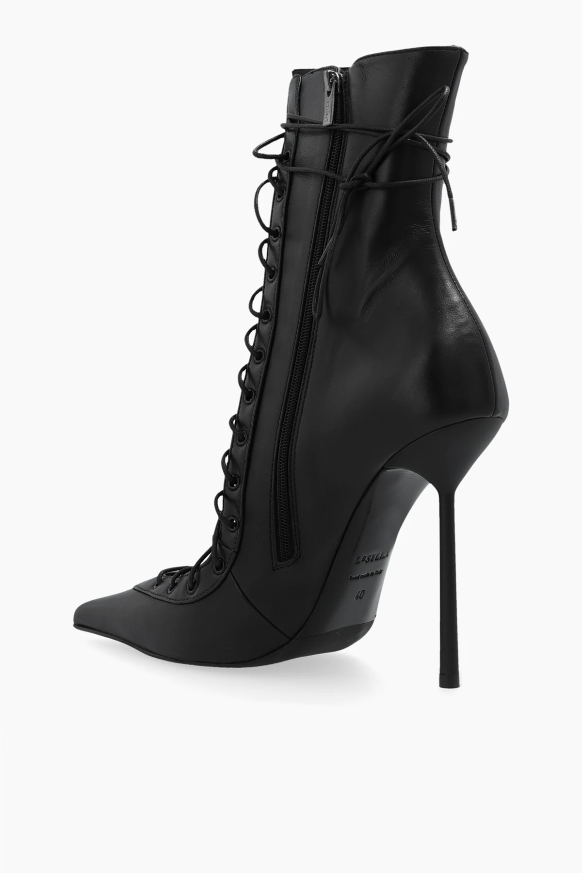 Introducing the epitome of sophistication and flair, the `Colette` High-Heeled Booties by the renowned designer Le Silla. These exquisite booties, with their dominant black hue, are crafted from the finest quality leather, ensuring a glossy and smooth finish that captivates at first glance. The lacing detail that graces the entire front of the boot adds a touch of elegance and audacity, while the sharply pointed toe endows these shoes with a refined character. The slender heel, of medium height, strikes the perfect balance between style and comfort, making them an ideal choice for both day and night wear. Notably, the rear zipper closure enhances functionality, allowing for effortless slipping on and off. Furthermore, the interior of the boot is stamped with the collection’s name, signifying its authenticity and exclusive craftsmanship. The outer layer and lining are both 100% leather, complemented by a durable rubber and leather sole, promising enduring wear and timeless appeal. Why Purchase the `Colette` Booties? Impeccable craftsmanship from high-quality leather Elegant lacing detail and sleek design Optimal balance of style and comfort with medium-height heel Easy rear zipper closure for convenience Exclusive brand authentication with collection name interior stamp