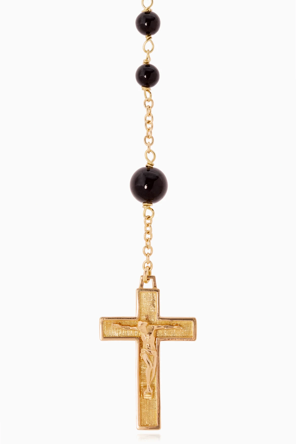 Introducing the Rosary Necklace by Dolce & Gabbana, an exquisite piece of unisex jewelry that seamlessly blends religious symbolism with contemporary elegance. This masterfully crafted necklace features a traditional rosary design, adorned with thirty-six meticulously handwoven black jade beads set on an 18 kt yellow gold chain. The necklace boasts a central cross with the figure of Christ, connected to the main strand through six additional black jade beads and a medallion depicting the Virgin Mary. The reverse side of the cross is intricately engraved, adding a touch of refined detail. Designed to be both a practical item of daily devotion and a striking fashion accessory, this rosary necklace is completed with a classic lobster clasp for ease of wear. Its universal appeal is highlighted by its presentation on both male and female models, making it a versatile addition to any wardrobe. Why Buy This Product? Exquisite Craftsmanship - Handwoven black jade beads and 18 kt yellow gold chain. Elegant Design - Traditional rosary form with a central cross and medallion. Versatile Wear - Suitable for both men and women. Iconic Brand - Designed by the world-renowned Dolce & Gabbana. Attention to Detail - Intricate engraving and thoughtful design elements.
