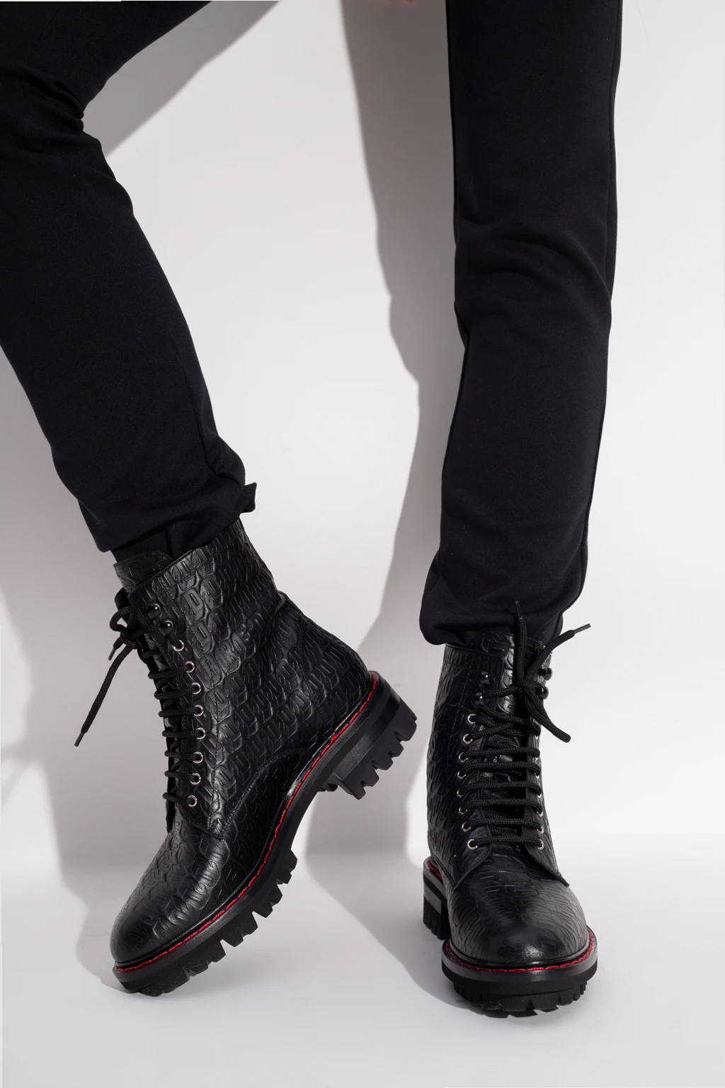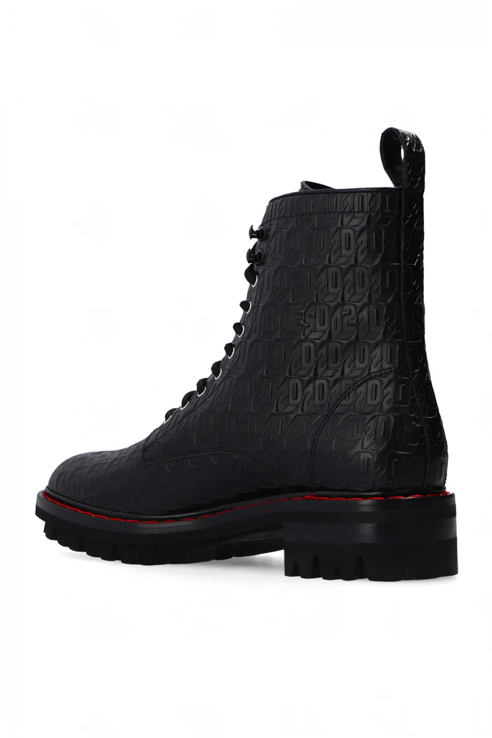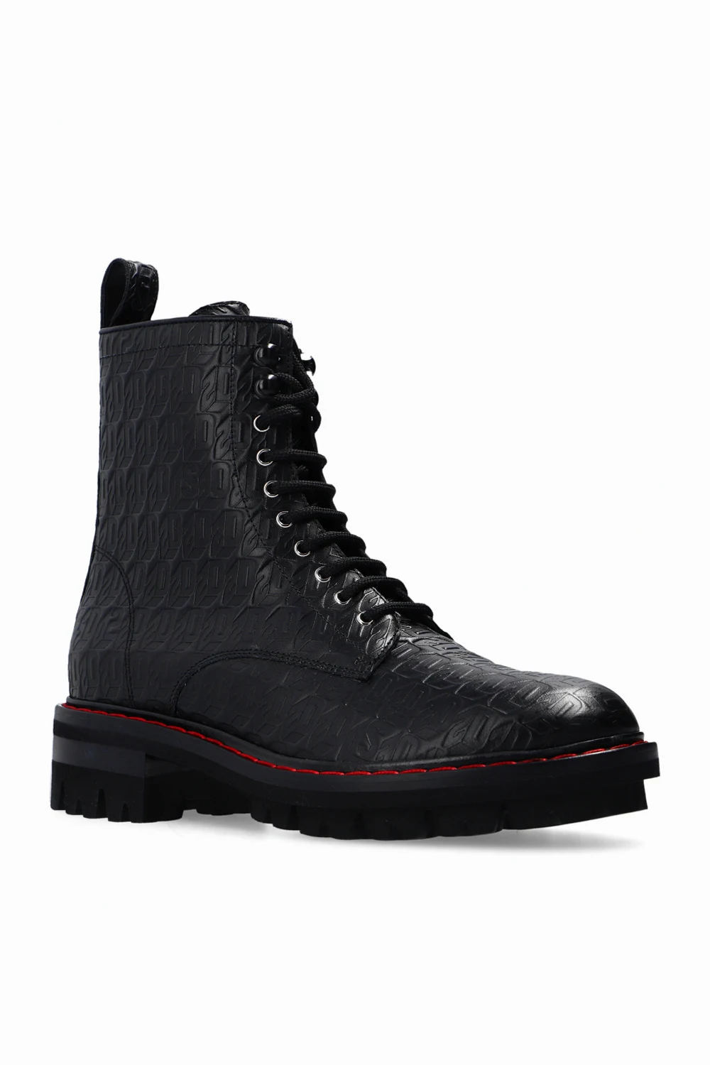 Black ‘Monogram’ ankle boots from Dsquared2. Crafted from calf leather, this lace-up model sits on a black rubber sole and showcases an embossed logo and distinctive red stitching.