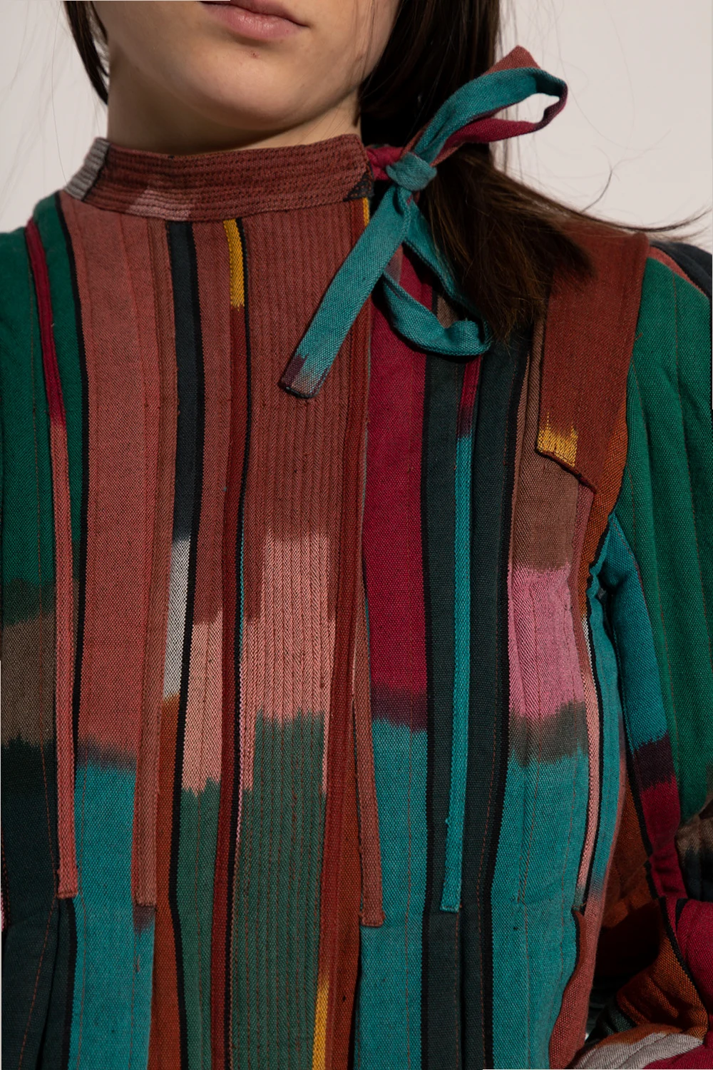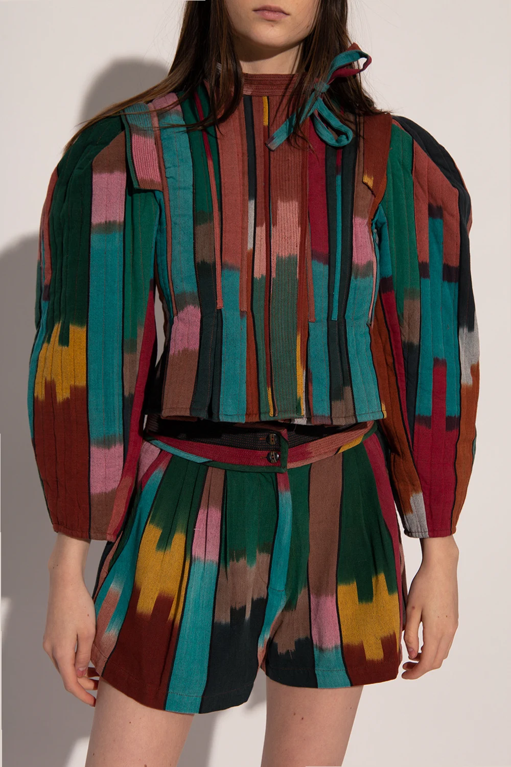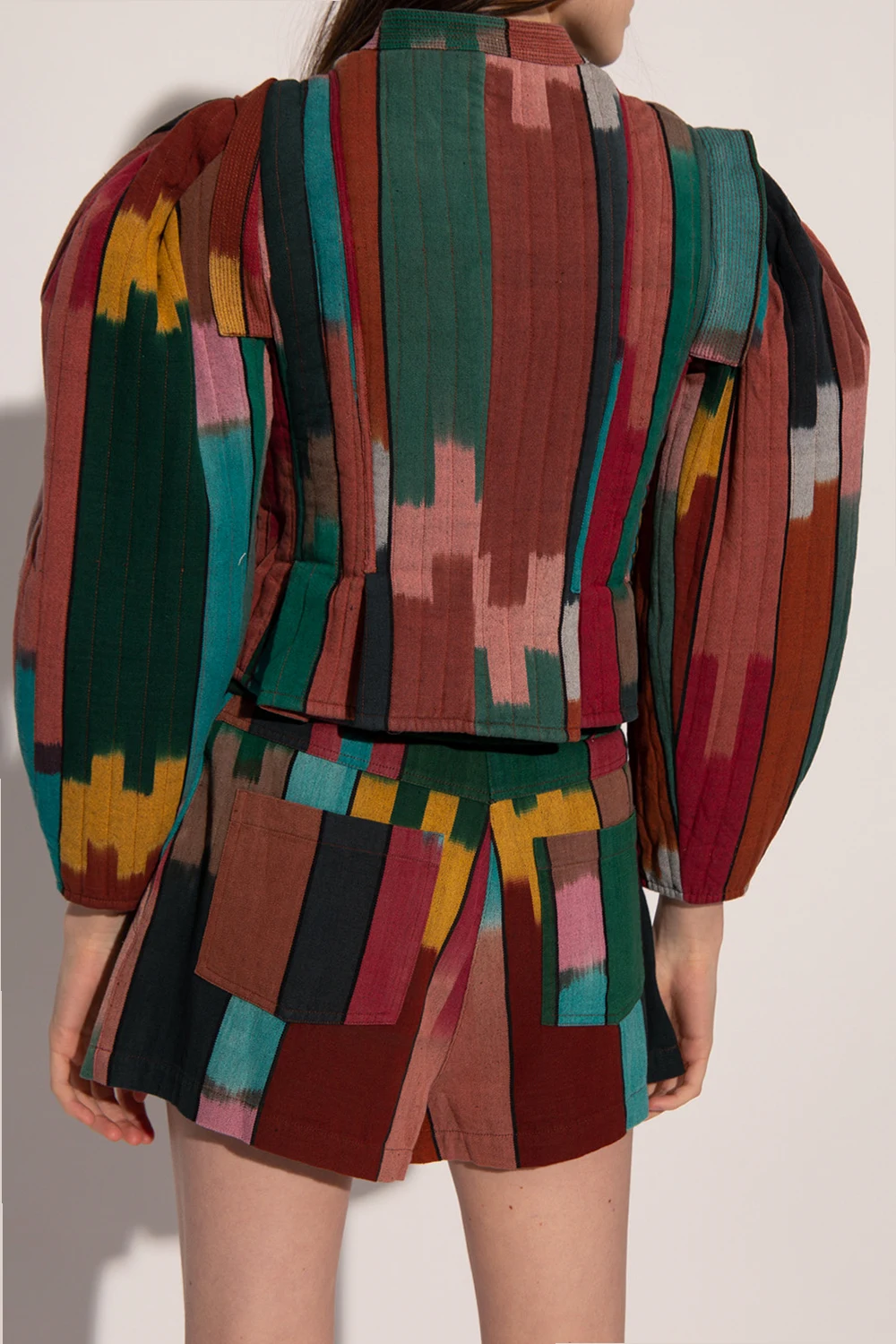 Colorful jacket \'Afia\' by Ulla Johnson. Made in India from hand-woven cotton using century-old weaving techniques for eye-catching patterns in enhanced colors. Fastened with a zipper covered with a pleat. Neckline tied with drawstrings. Long, puff sleeves.