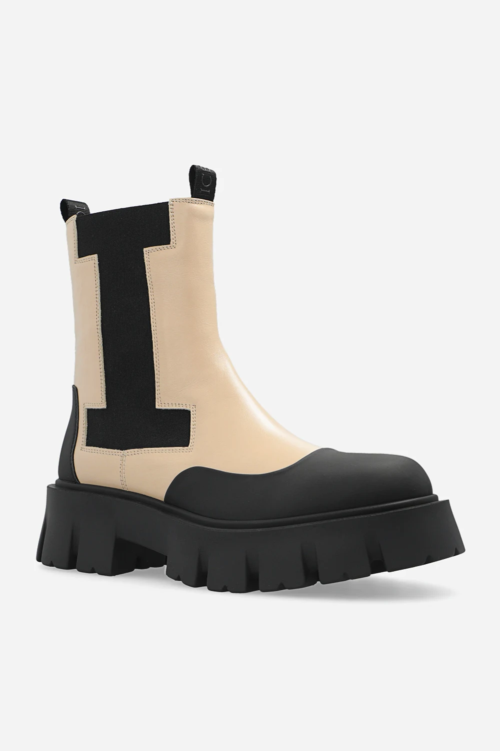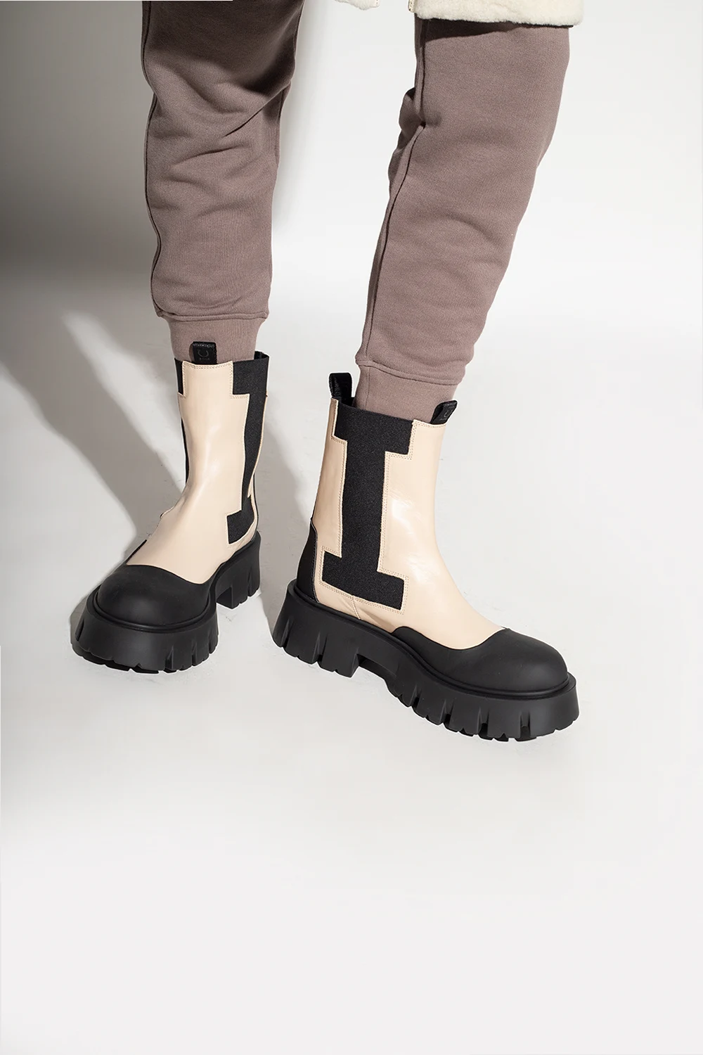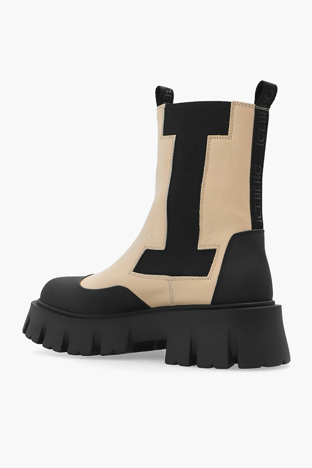 Light beige Chelsea boots from Iceberg. Crafted from leather with rubber trims, this pair is complete with black elastic panels, grosgrain strap with a rubber logo pattern and black chunky rubber sole with Wellfeet light technology.