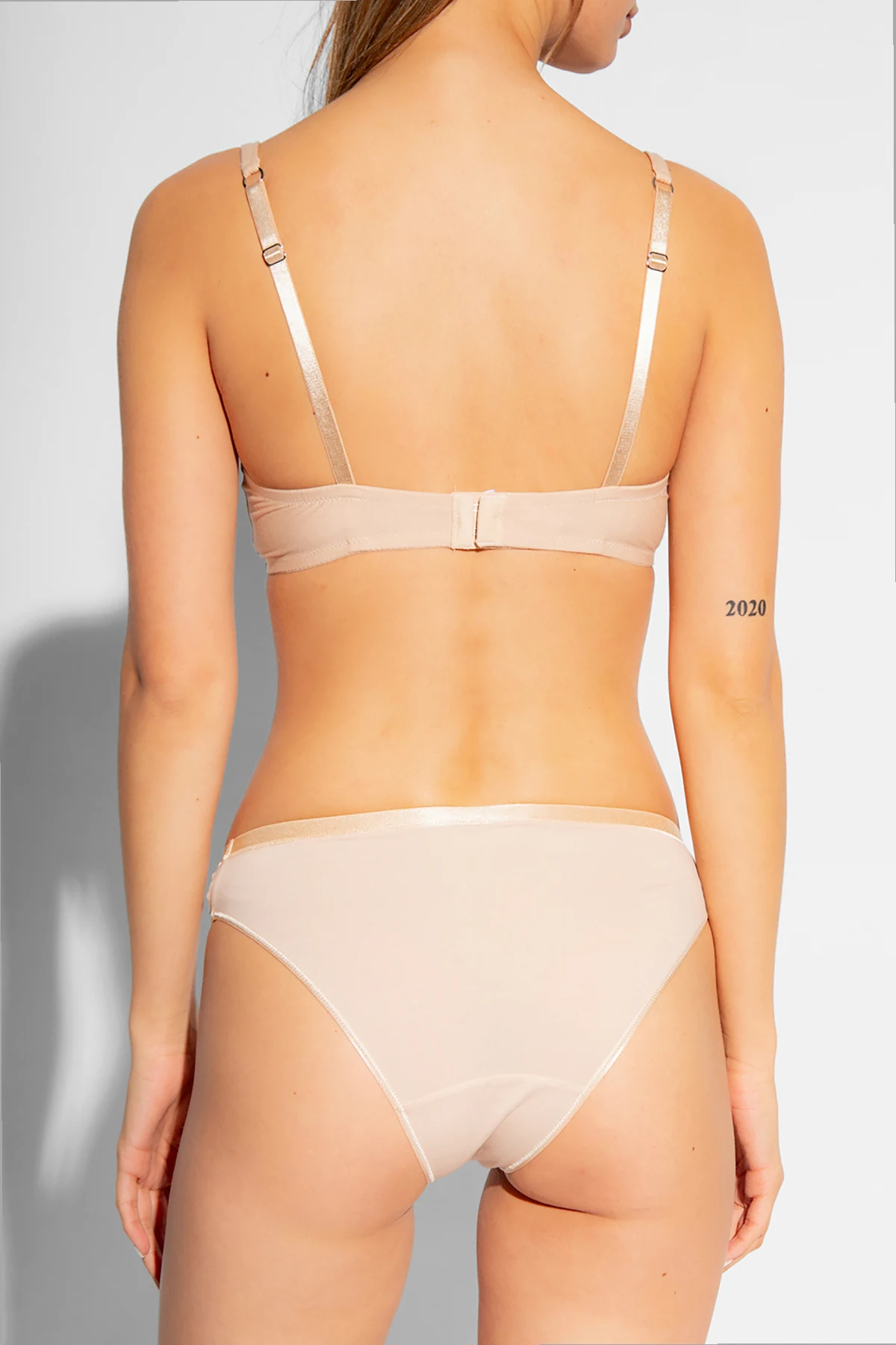 Beige bra from Hanro. Crafted from Pima cotton, this design features adjustable hook and eyes fastenings at the back and adjustable shoulder straps.