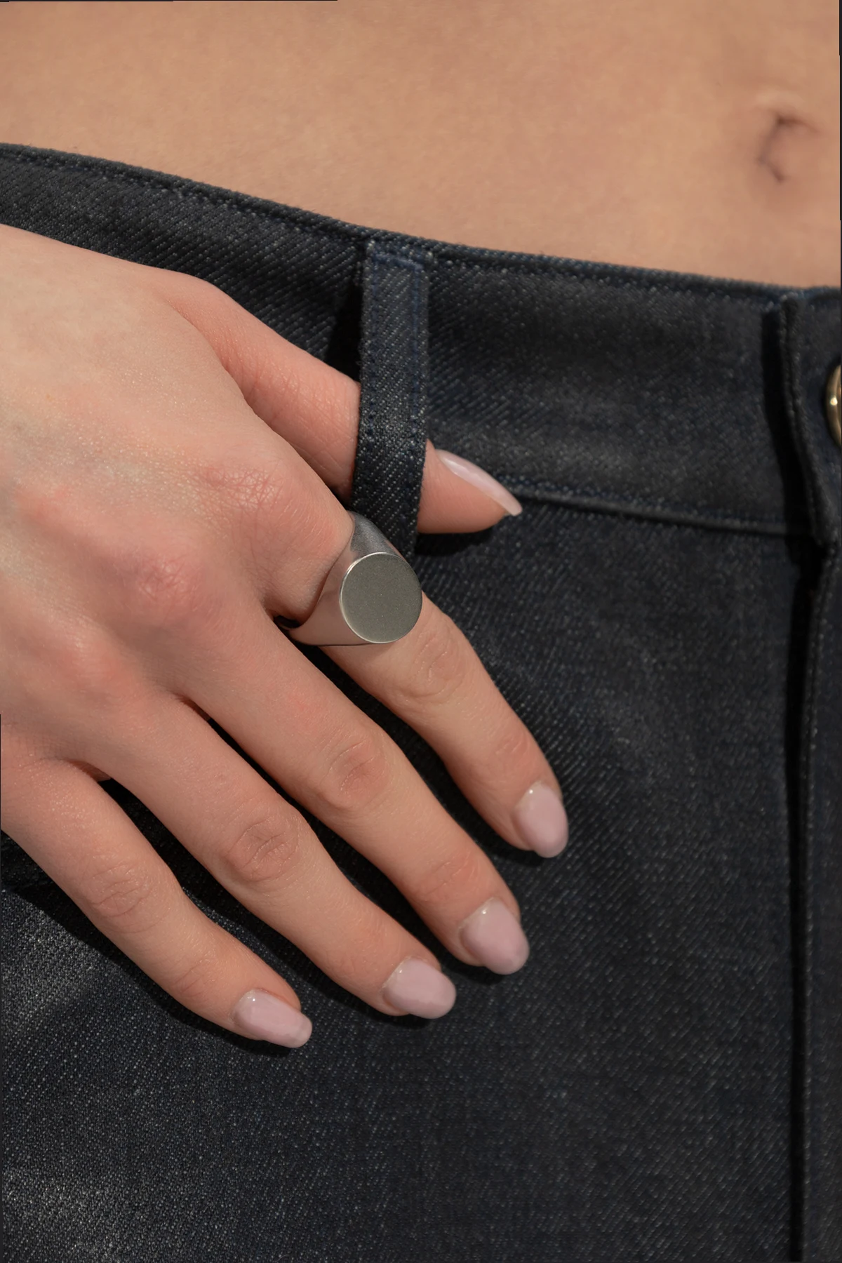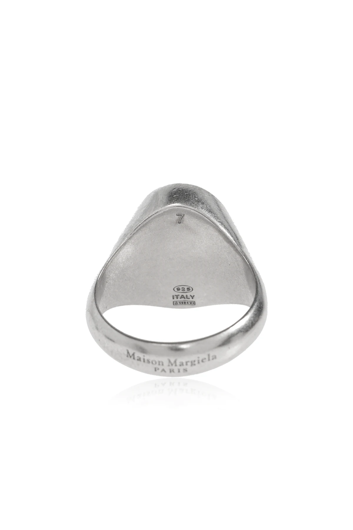 Introducing the Silver Signet, an exquisite unisex ring that embodies a classic, minimalist design. Crafted from fine silver, this piece exudes an elegant allure that is both subtle and sophisticated. Its smooth, oval surface presents a timeless silhouette, ideal for everyday wear or special occasions. On the interior, the engraved logo of Maison Margiela adds a touch of prestige, highlighting the renowned designer\'s signature style. This Parisian fashion house, founded by the elusive Belgian designer Martin Margiela, is celebrated for its avant-garde approach to fashion since the late 1980s. Under the creative direction of the eccentric John Galliano since 2014, the brand continues to redefine gender norms with its unisex collections. Why Choose This Product? Timeless and versatile design suitable for any gender. Crafted from high-quality silver for a luxurious appearance. Features the iconic Maison Margiela logo, a mark of distinction.