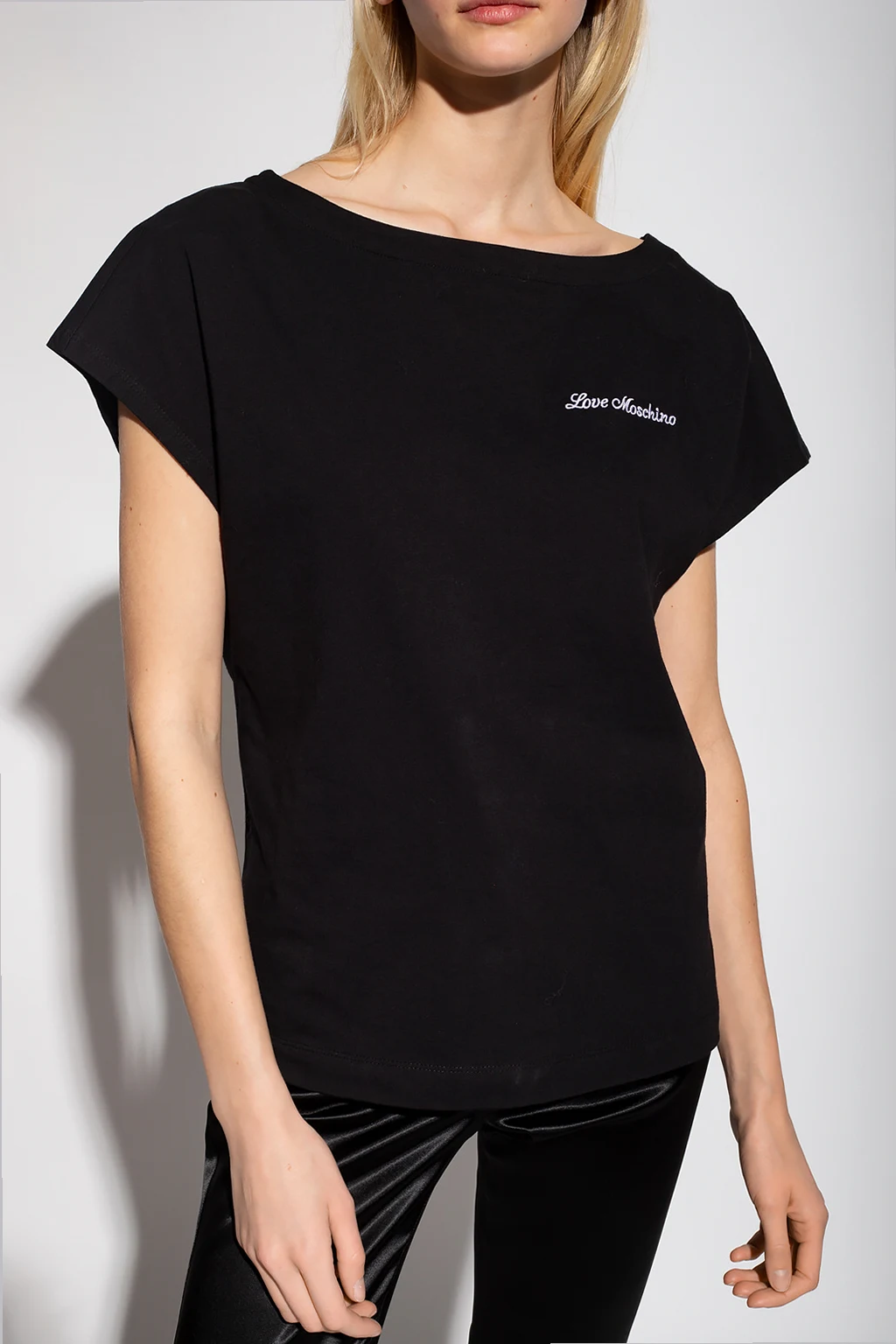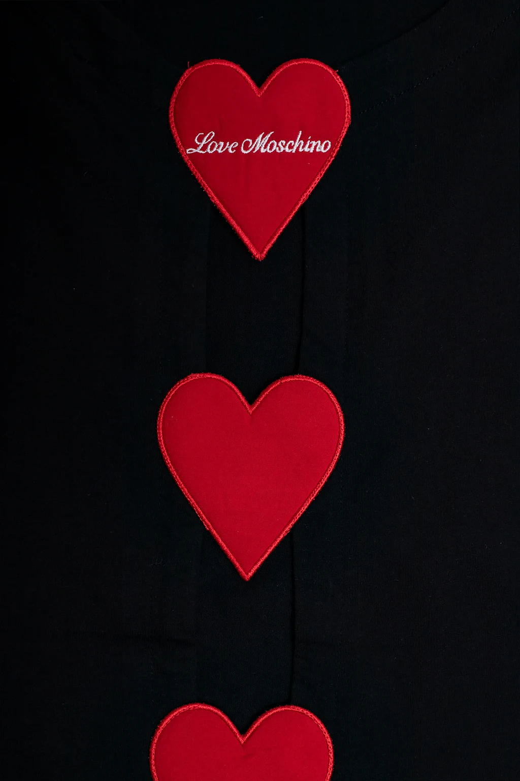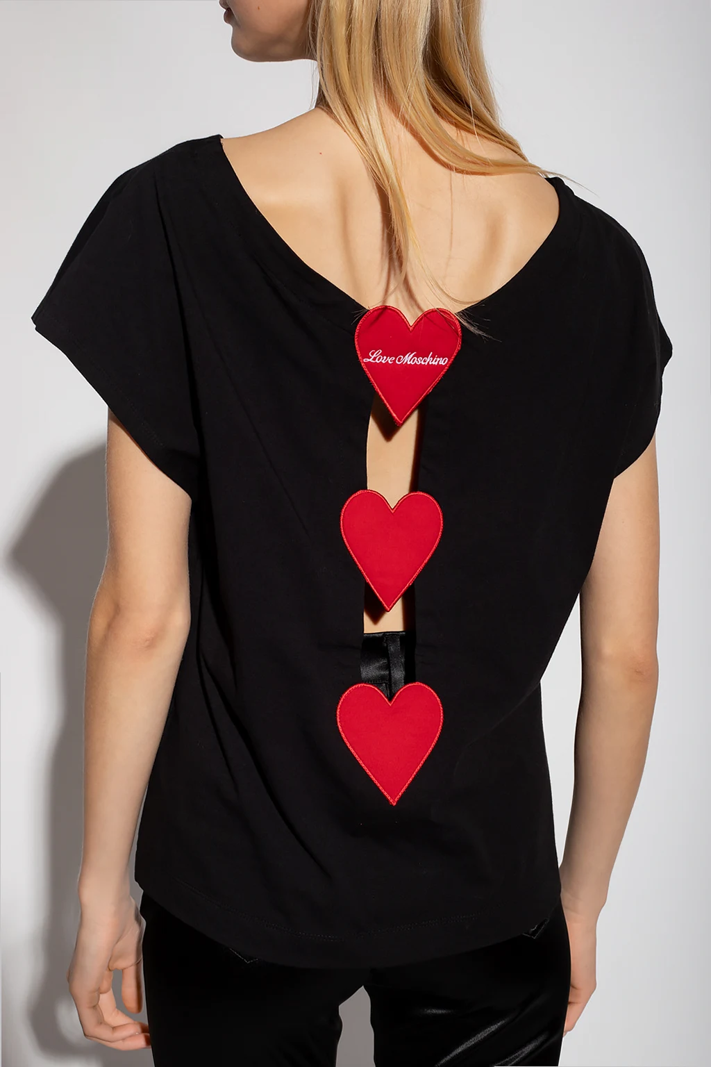 Black crewneck T-shirt from Love Moschino. Made of cotton, this style features short sleeves, an elasticated collar, white logo embroidery and distinctive cut-outs and a red appliqué on the back.