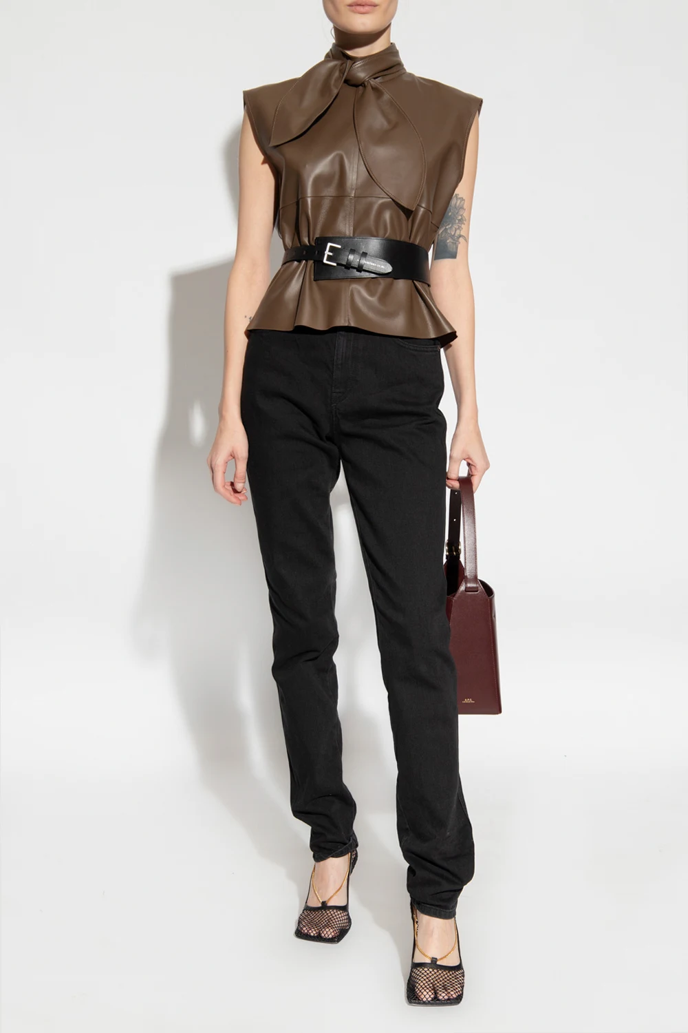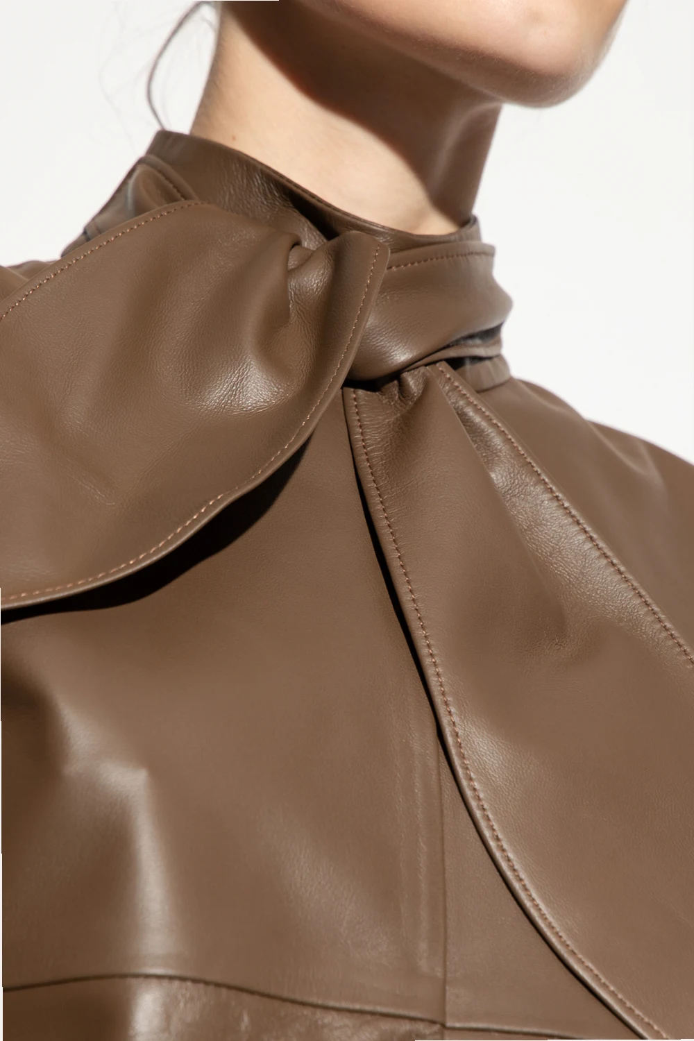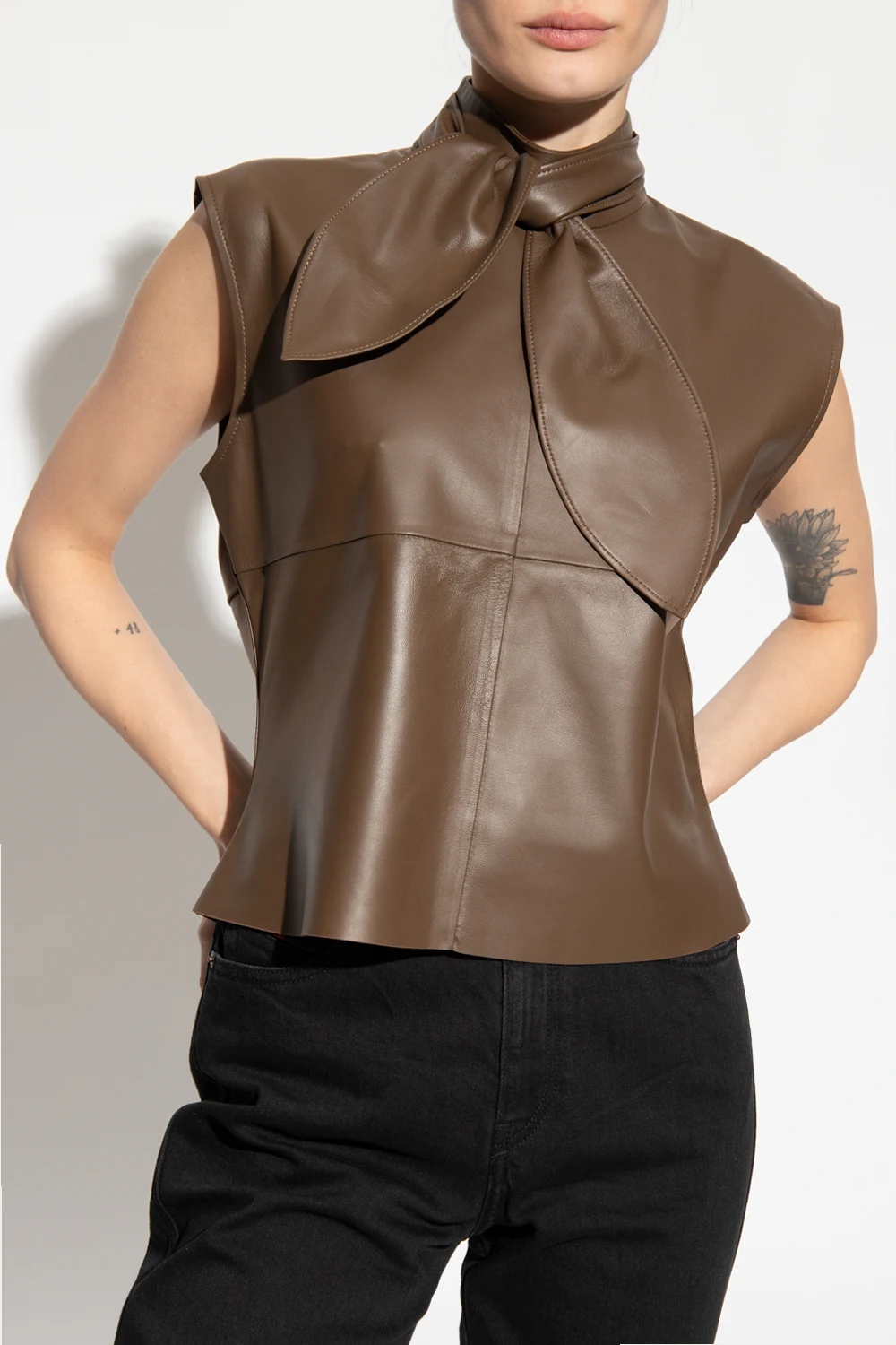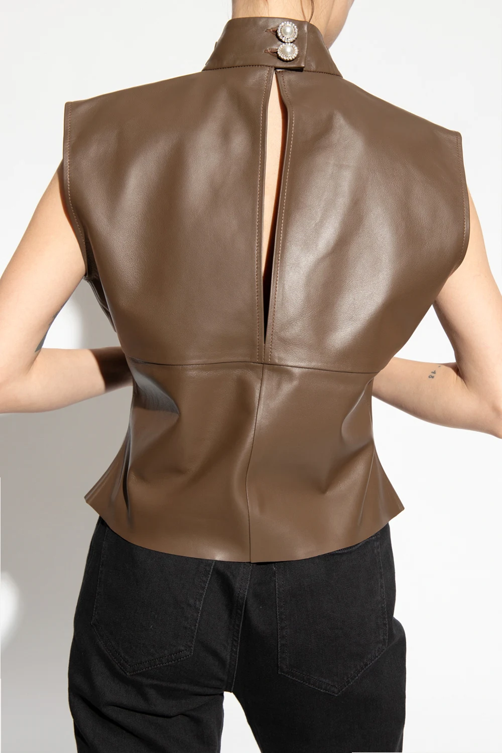 Brown ‘Unni’ top from Custommade. Made from lamb leather, this style features a high-neck collar with front ties and a denuded back with two glass pearl buttons accentuated with glossy appliqués.