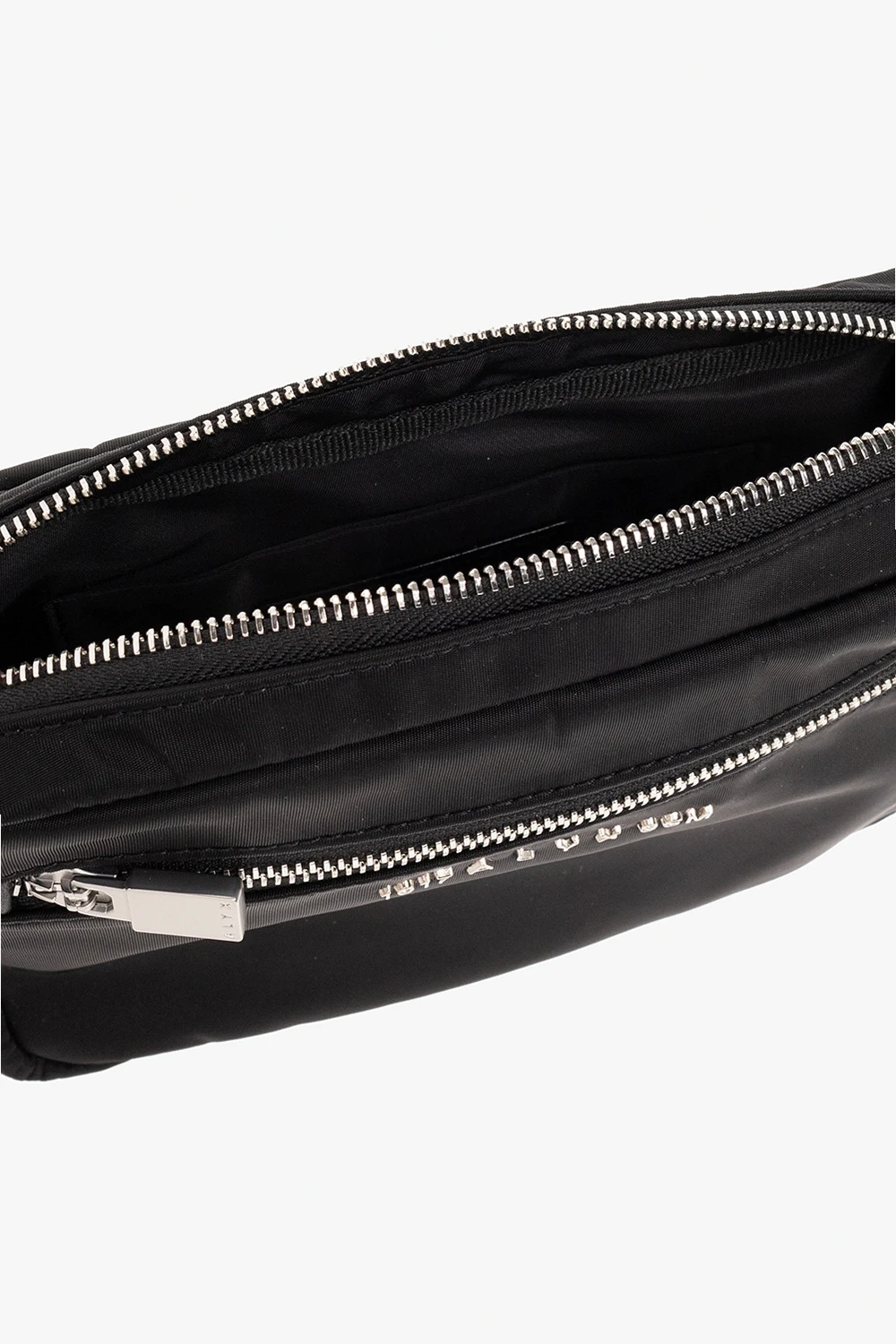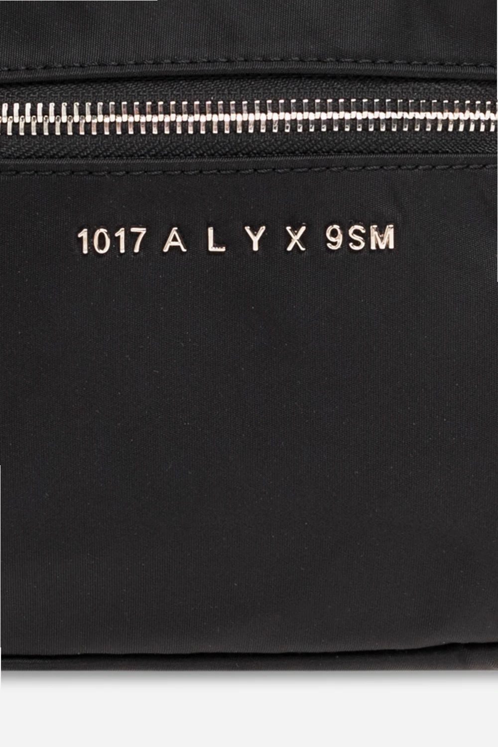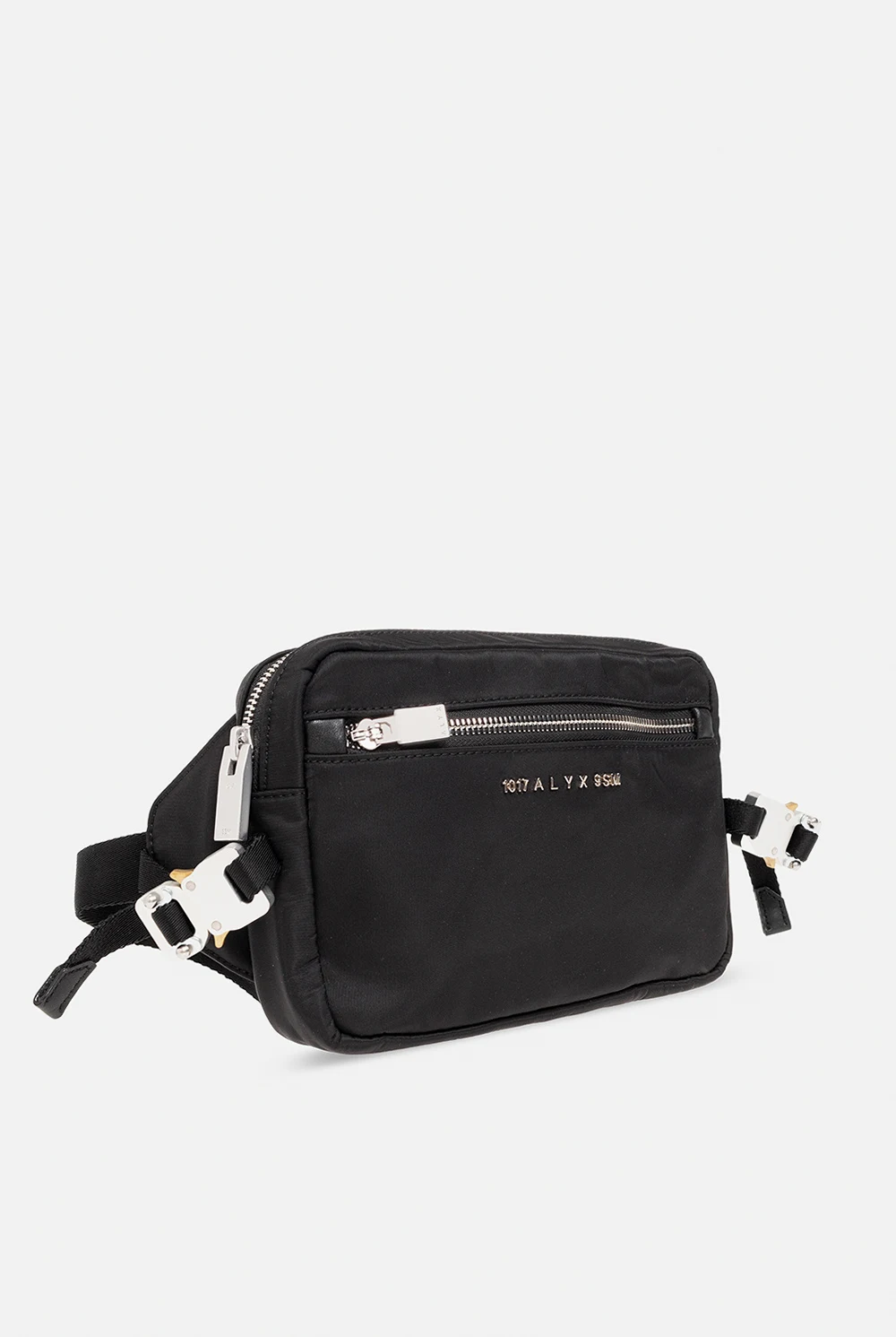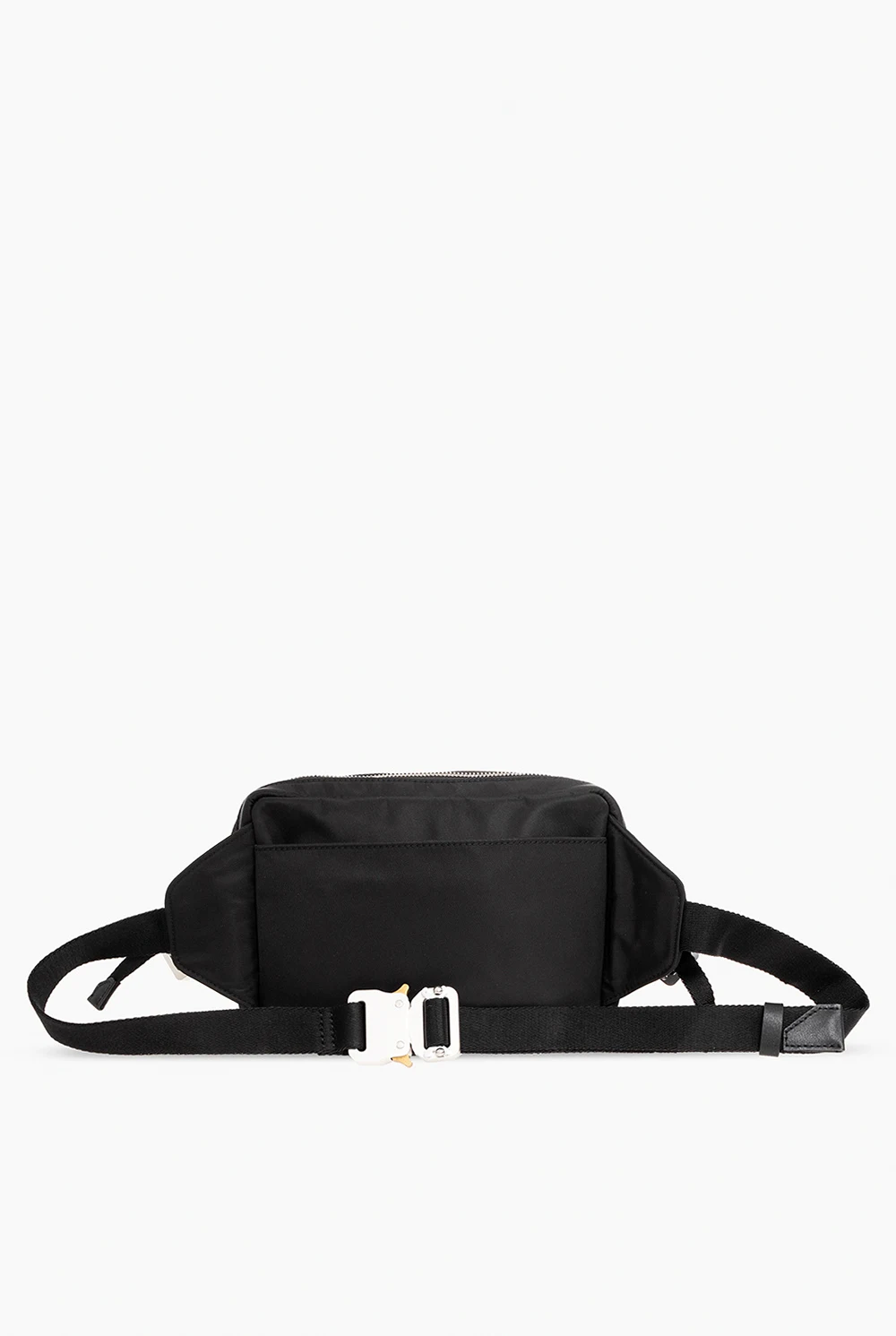 Black belt bag from 1017 ALYX 9SM. Made of nylon with leather trims, this model features a zip fastening, metal logo, front zip pocket, back pocket, the brand’s signature Rollercoaster buckles, adjustable belt, silver-tone metal hardware and one internal compartment with one slip pocket.