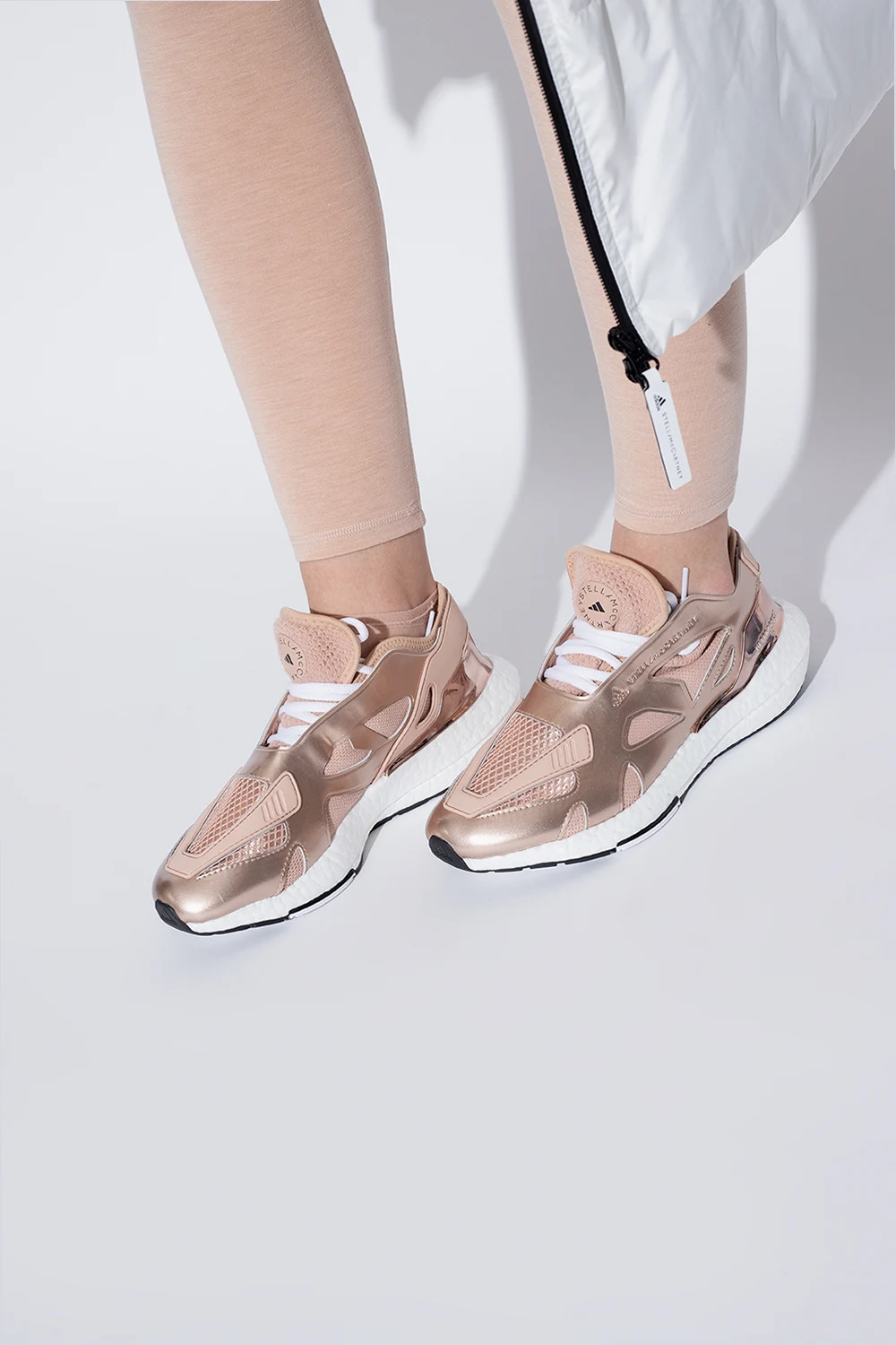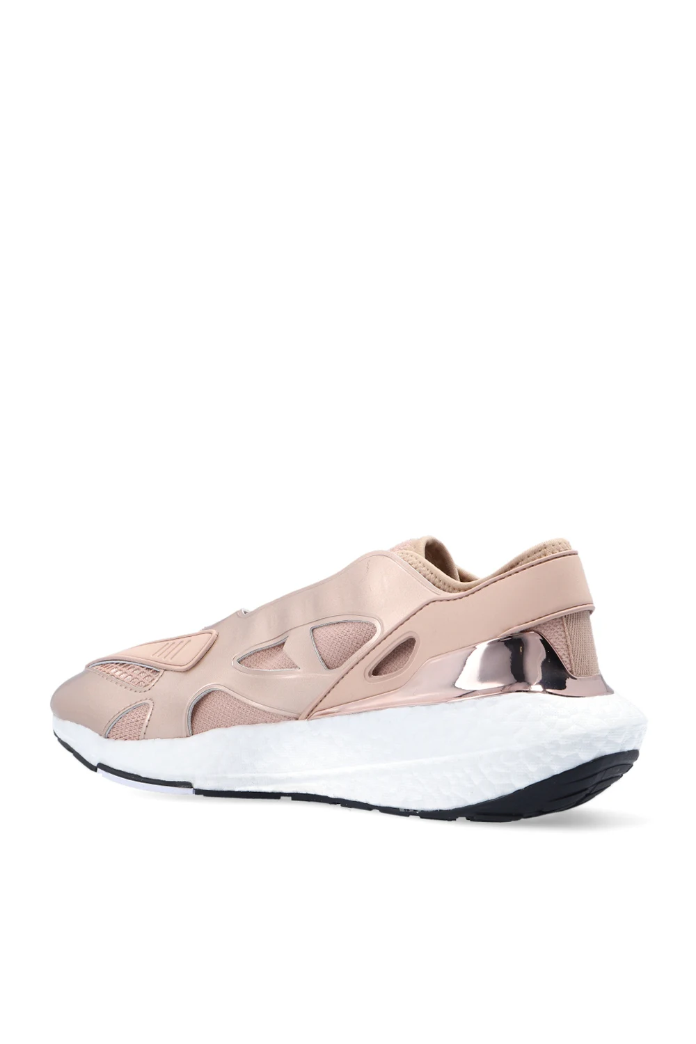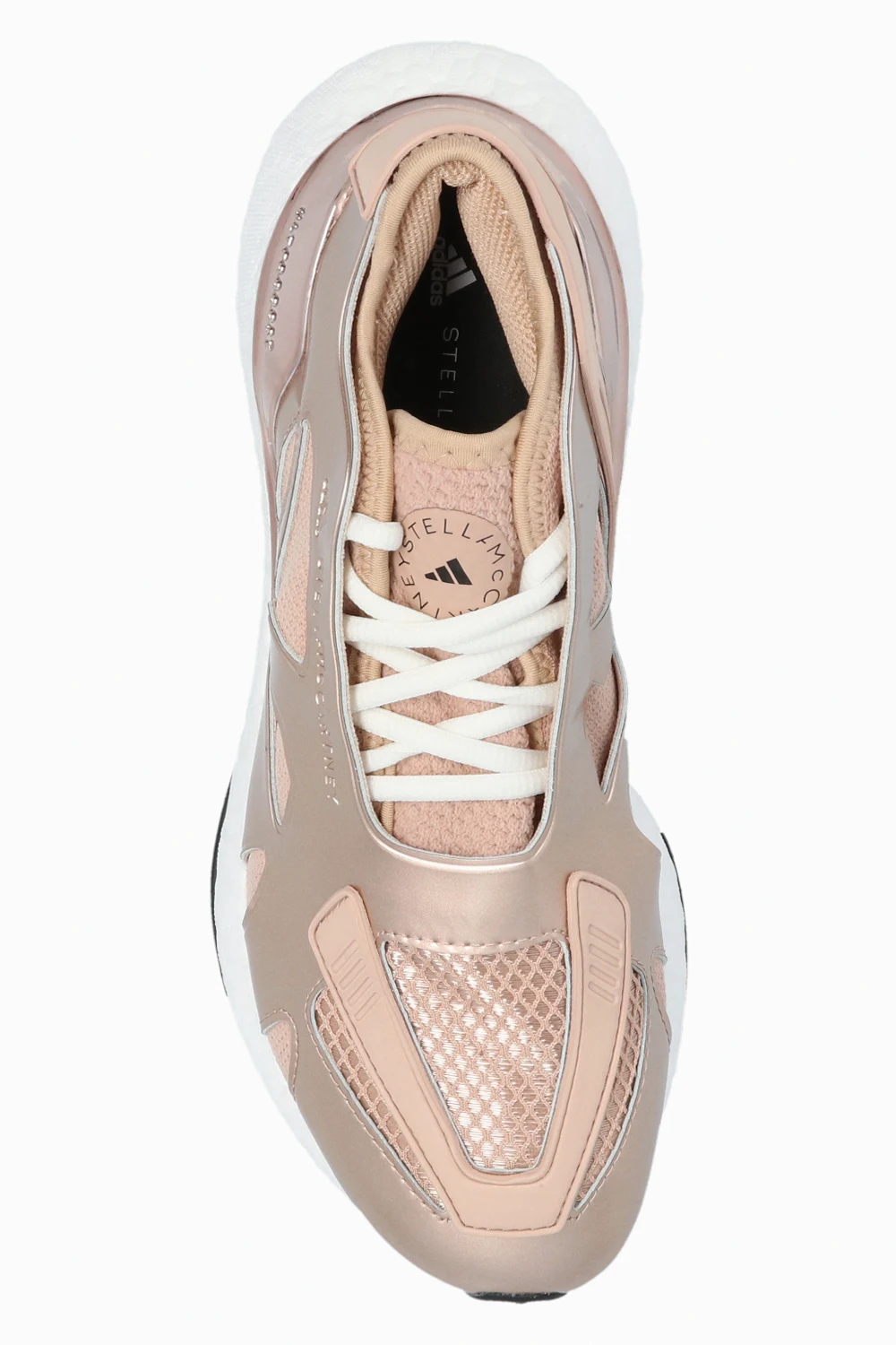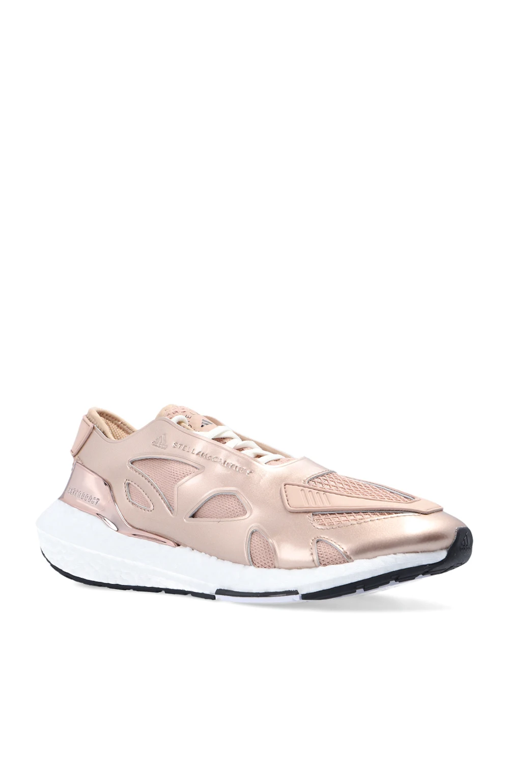 Blush pink ‘Ultraboost 22’ sneakers from ADIDAS by Stella McCartney. Crafted from recycled materials, this lace-up model features logo detailing on the sides, metallic trims and a black and white rubber sole.