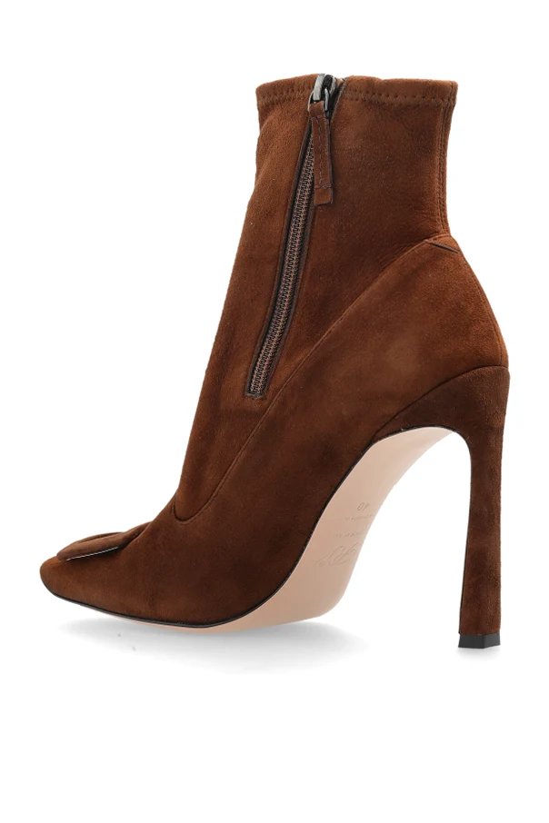 The Trompette Ankle Boots by Roger Vivier epitomize modern sophistication with a refined silhouette that gracefully embraces the ankle and tapers elegantly at the calf. Crafted entirely from premium brown suede, these boots are distinguished by their silky texture and understated monochromatic allure. The sleek, high stiletto heel and subtly squared toe introduce a meticulous balance of femininity and architectural form.