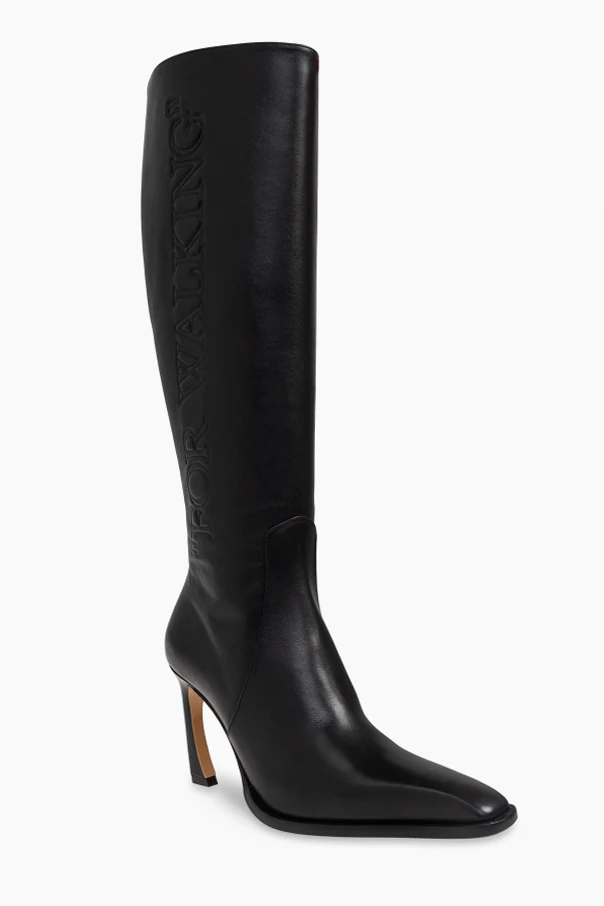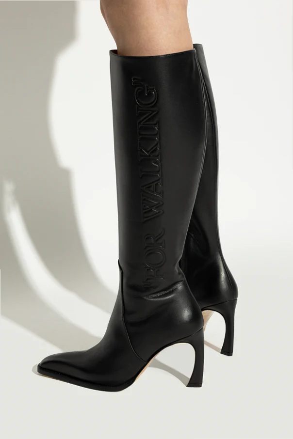 Distinguished by a high, slender heel accentuated by a contrasting bright base and a subtly rounded curve, this pair redefines silhouette with iconic Off-White artistry. The boldly embossed “FOR WALKING” statement detail, running vertically along the outer shaft, harmonizes with the premium leather for a striking yet refined visual identity.
