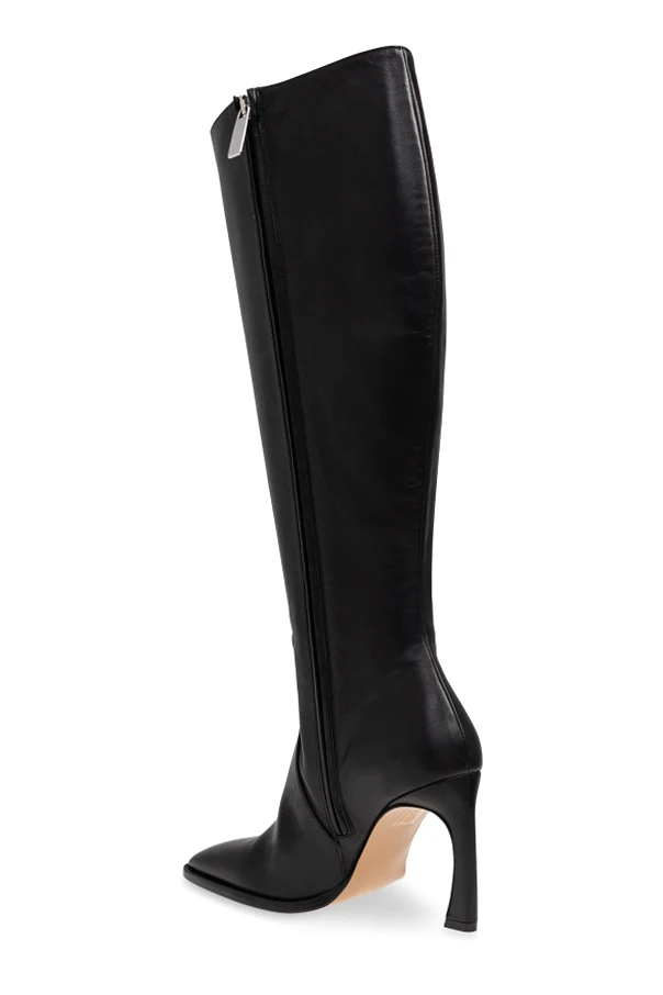Experience unparalleled sophistication with the ‘For Walking Loop’ knee-length boots by Off-White . Crafted from sumptuous, ultra-smooth calfskin leather in a deep, glossy black, these boots exude minimalist elegance with their sleek, form-fitting shaft and sensitively elongated, tapered toe.