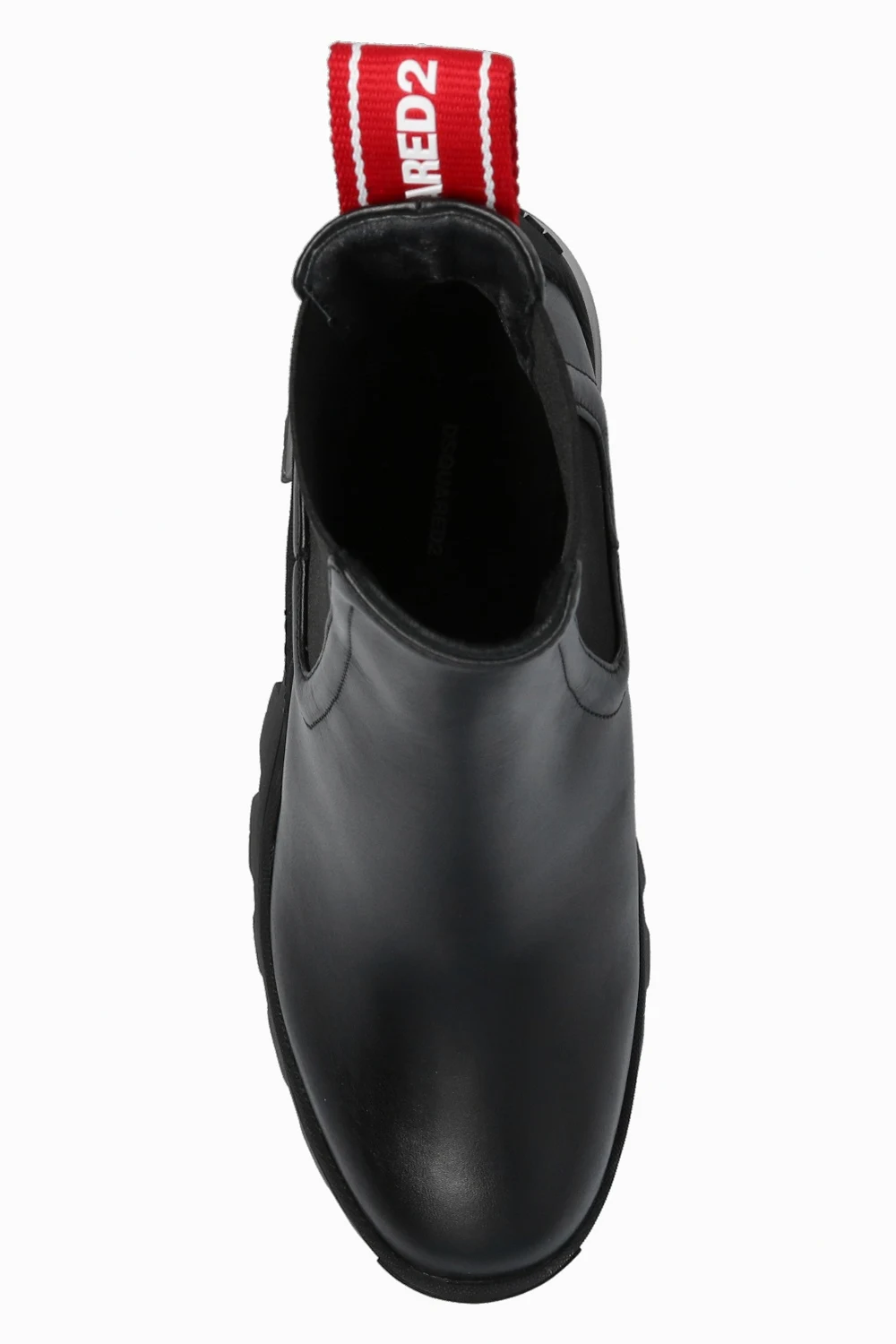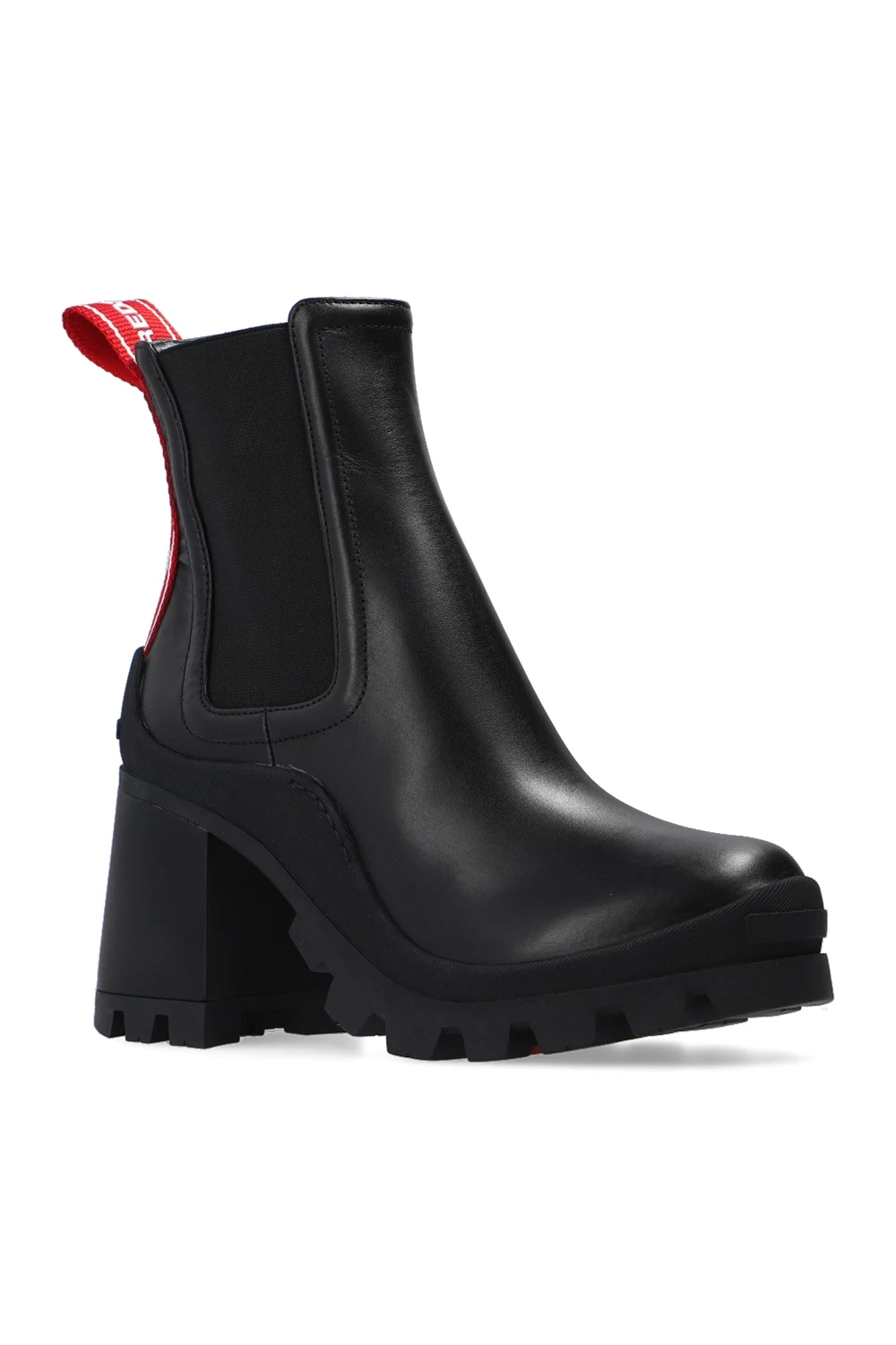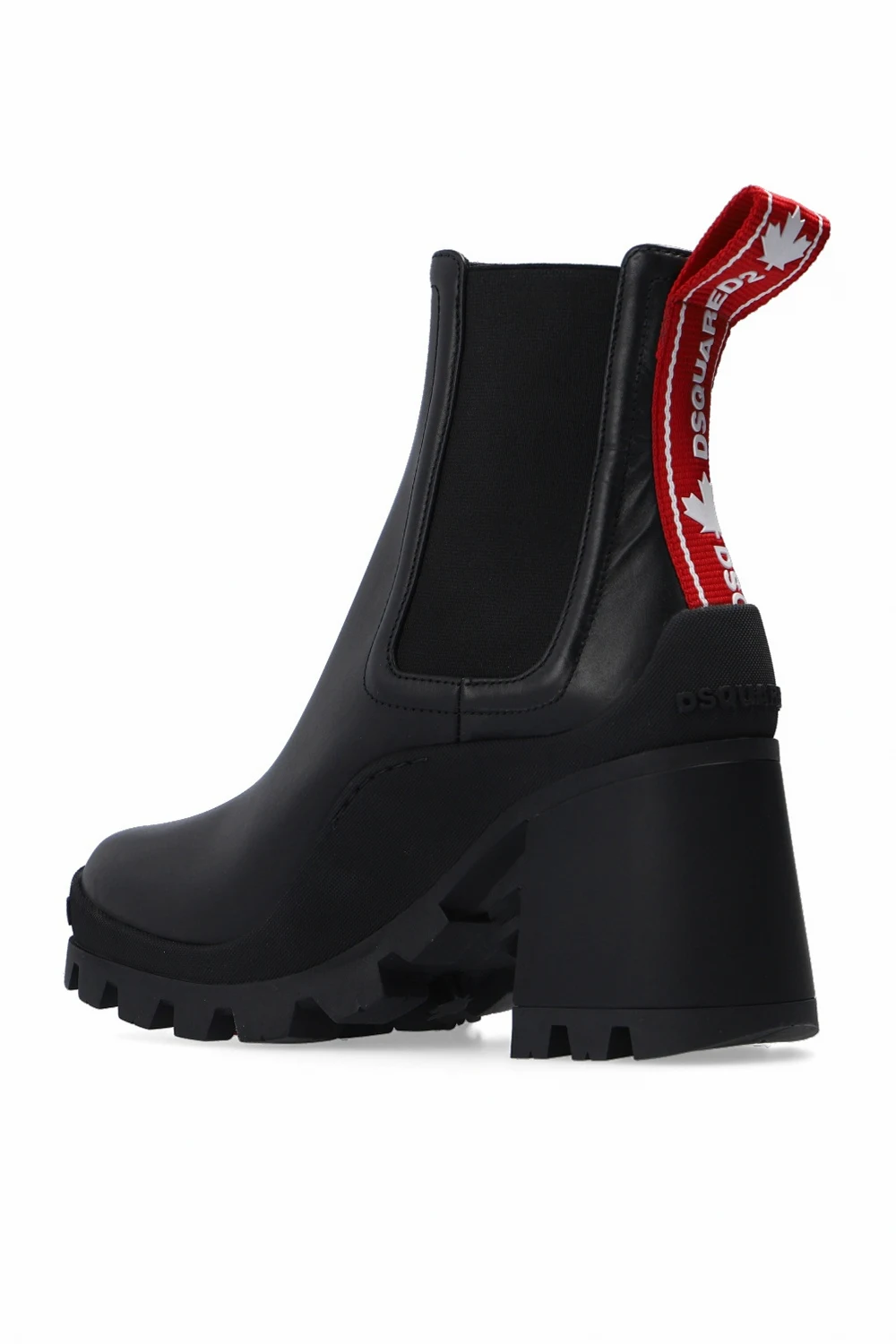Black ‘Tank Tape’ platform ankle boots from Dsquared2. Crafted from leather, this slip-on design features elastic side panels, a red grosgrain pull strap at the back with a raised logo pattern and a chunky rubber sole in black.