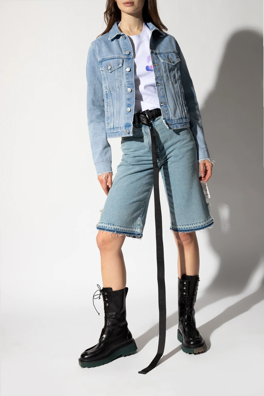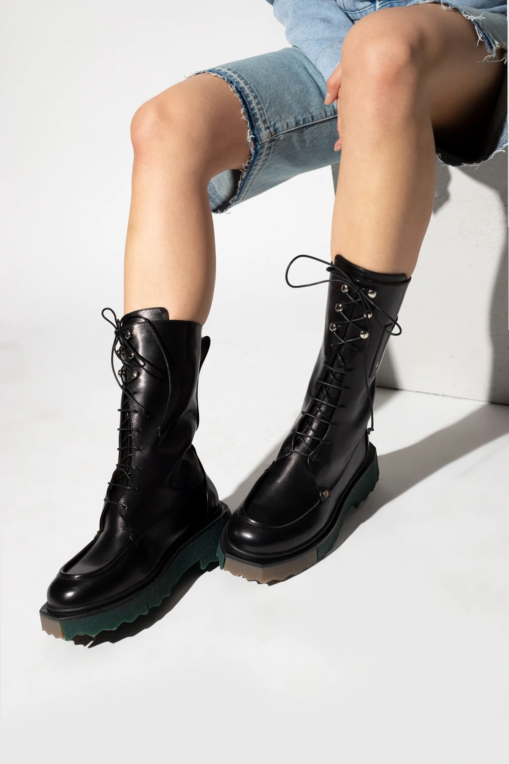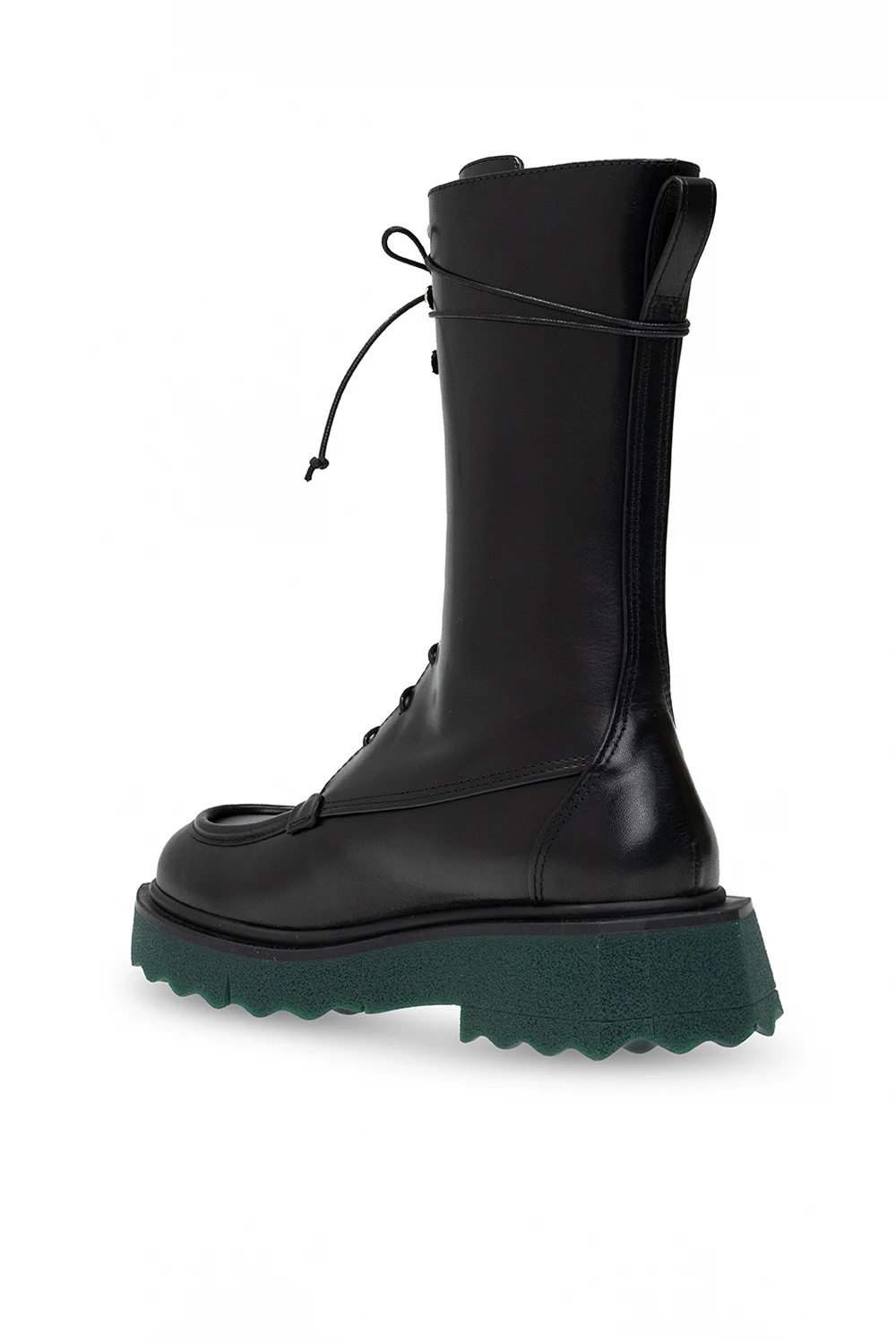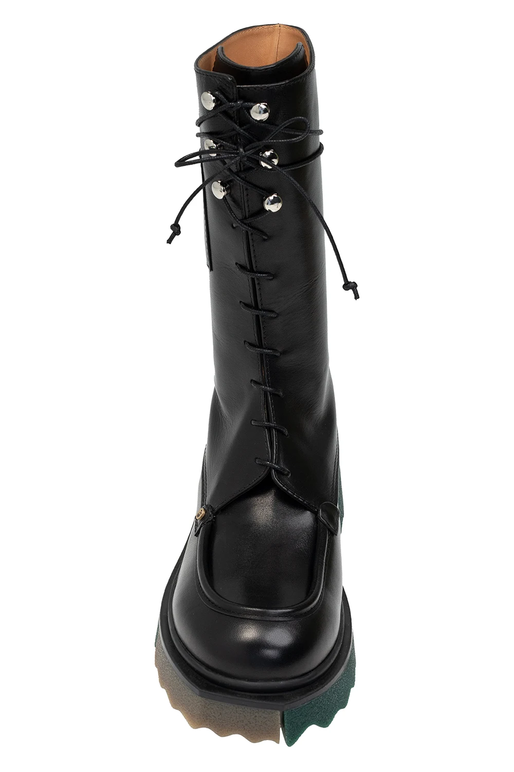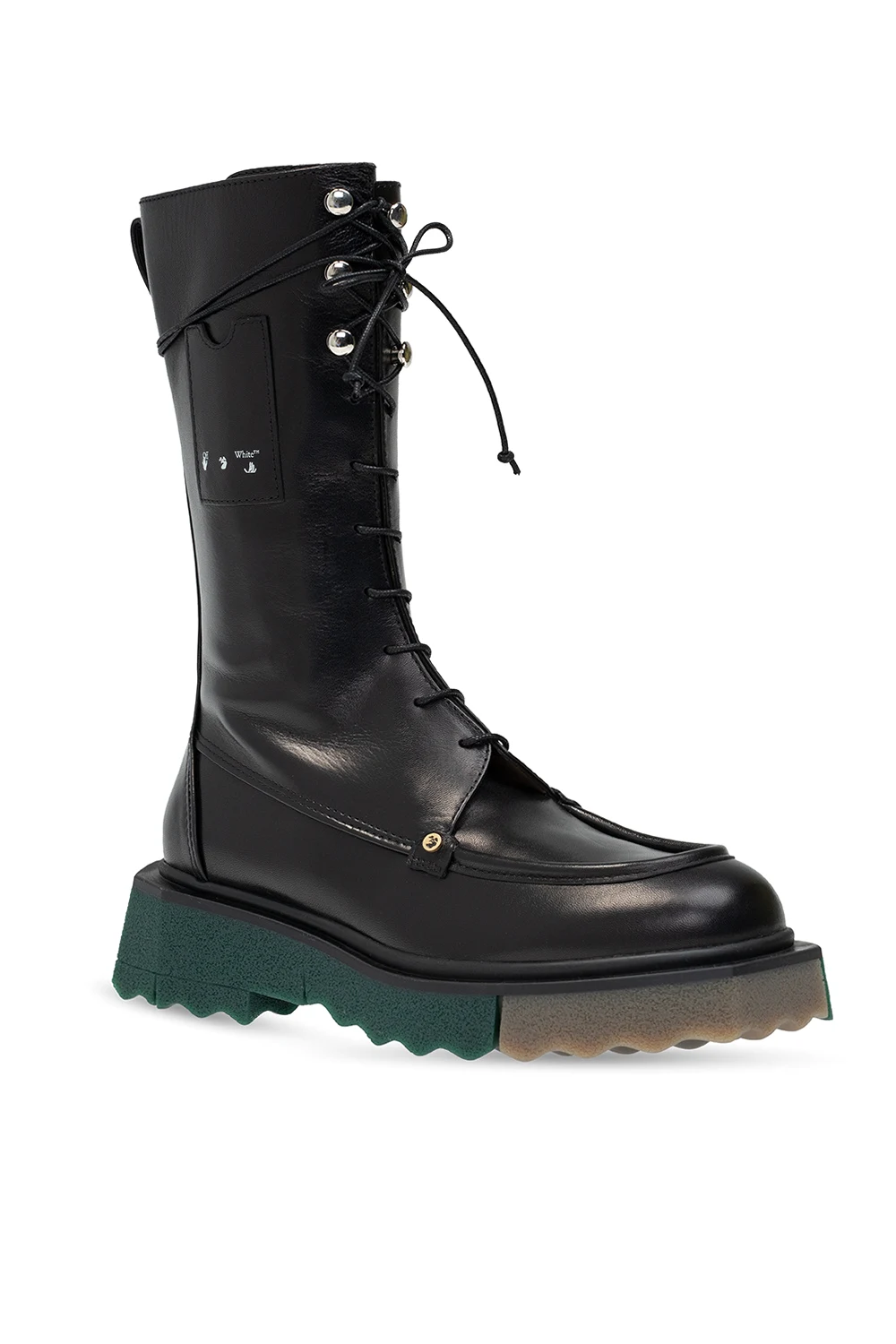 Black ankle boots from Off-White. Crafted from leather, this lace-up design features a logo-printed side pocket and rubber sole in dark green and brown.