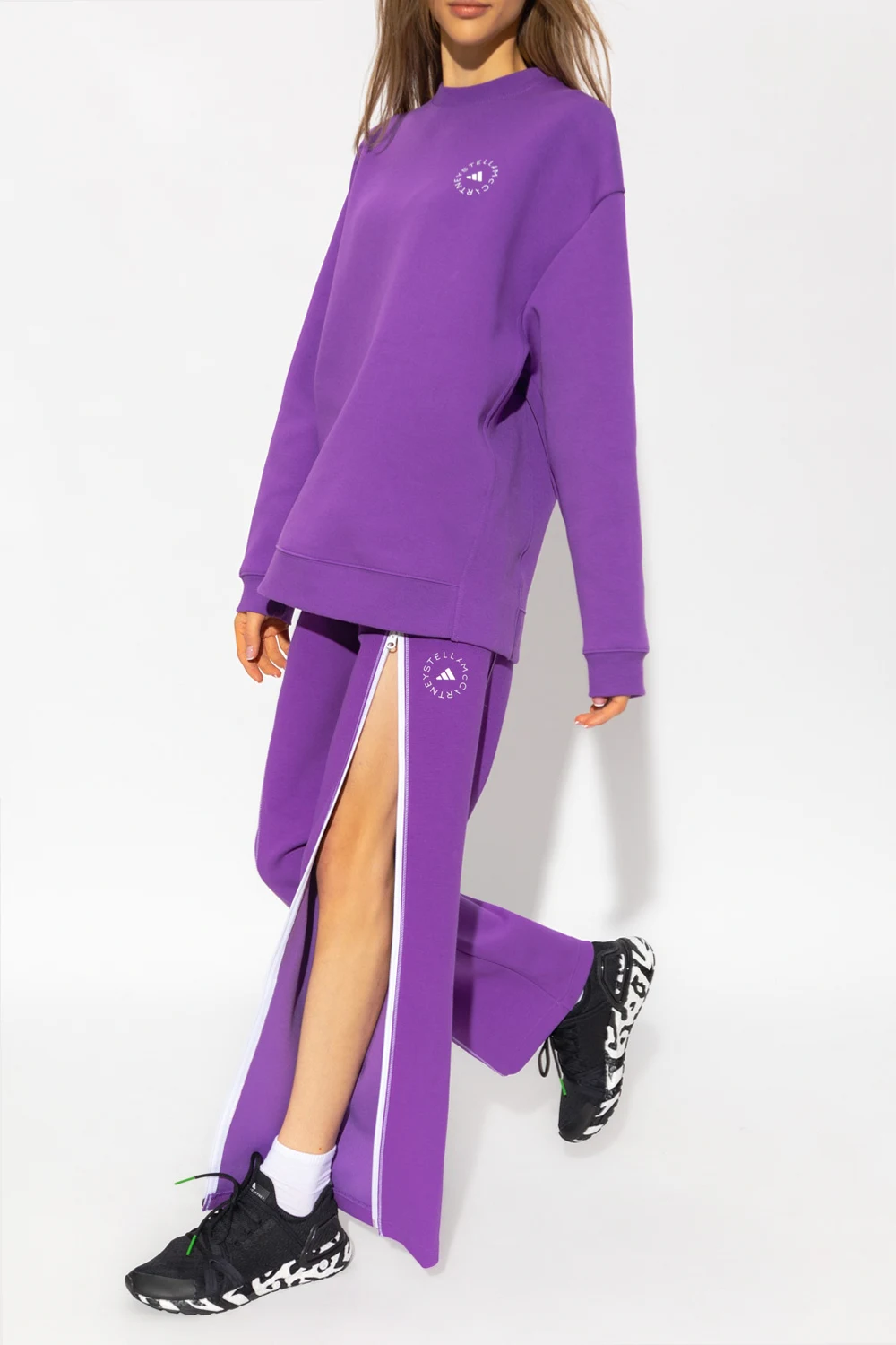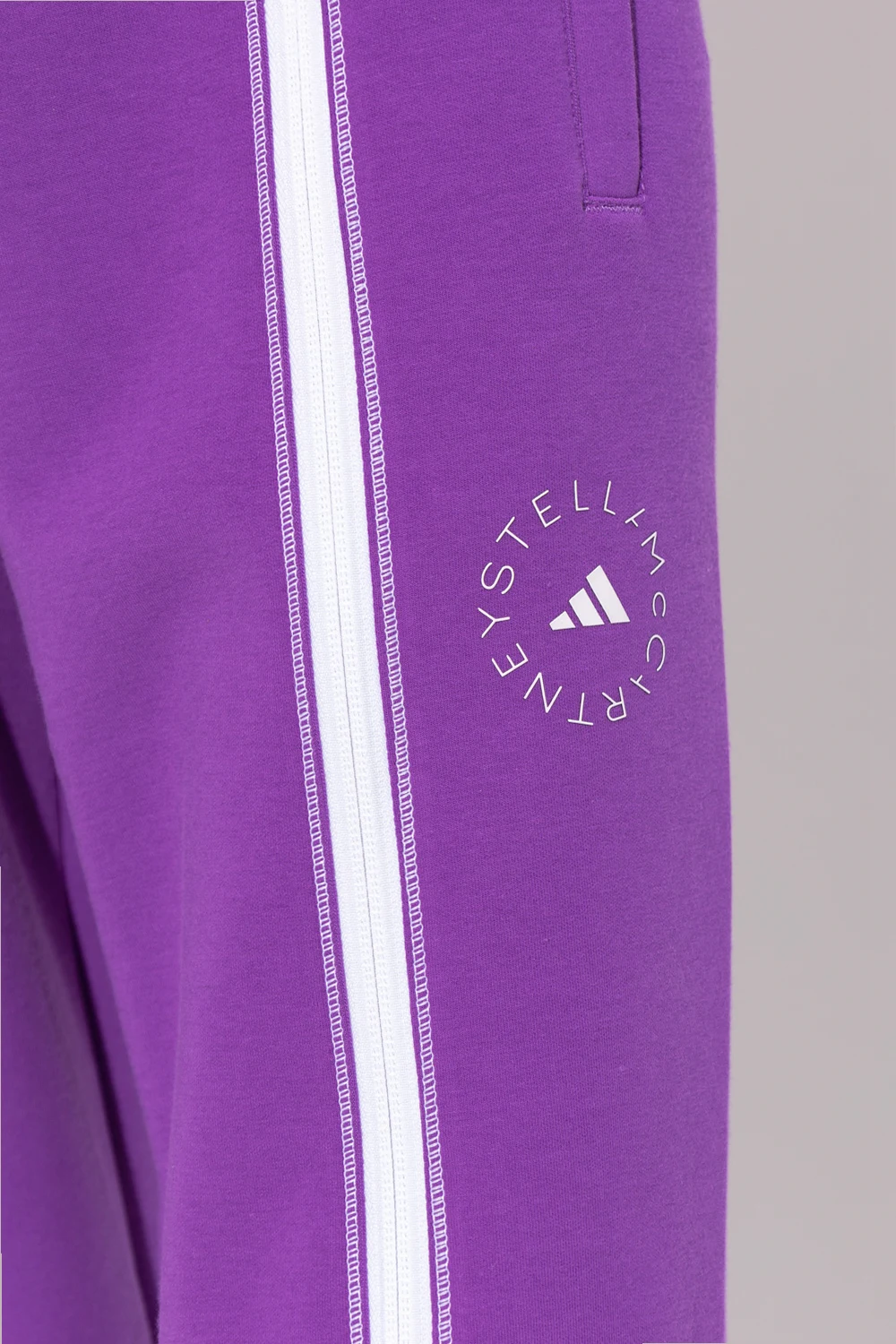 Purple sweatpants from ADIDAS by Stella McCartney. Crafted from recycled materials and organic cotton, this pair features an elastic drawstring waistband, zip fastening, logo print and stitching in white, two zip pockets and straight legs.