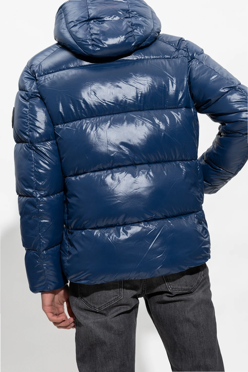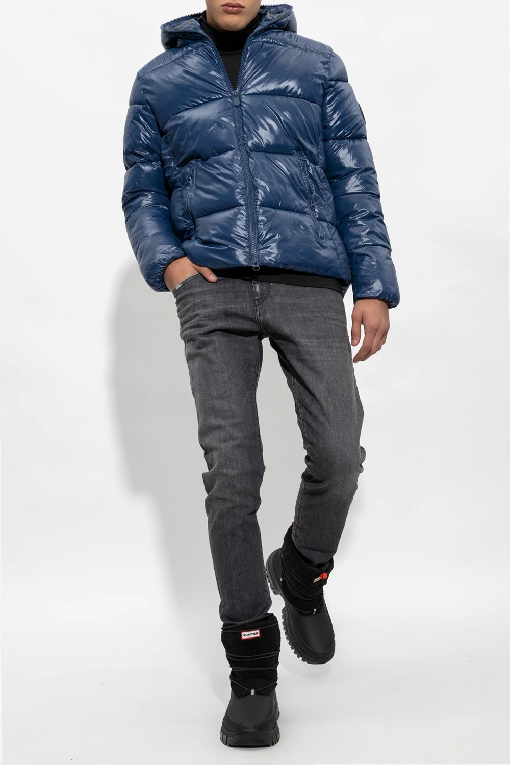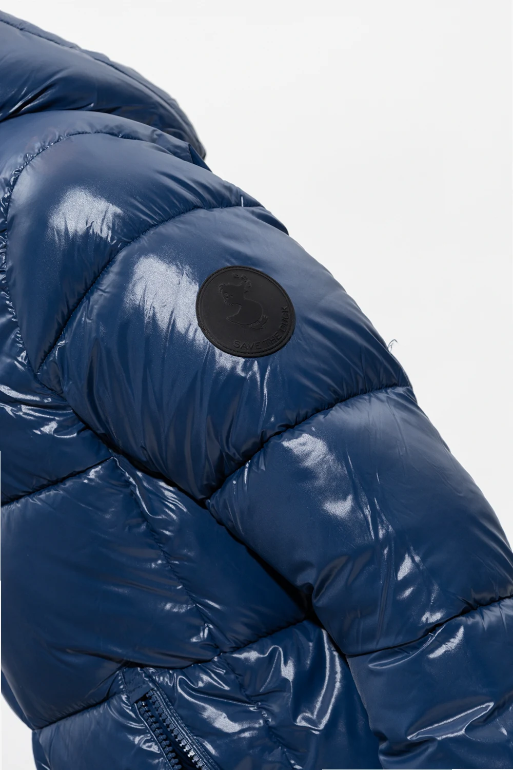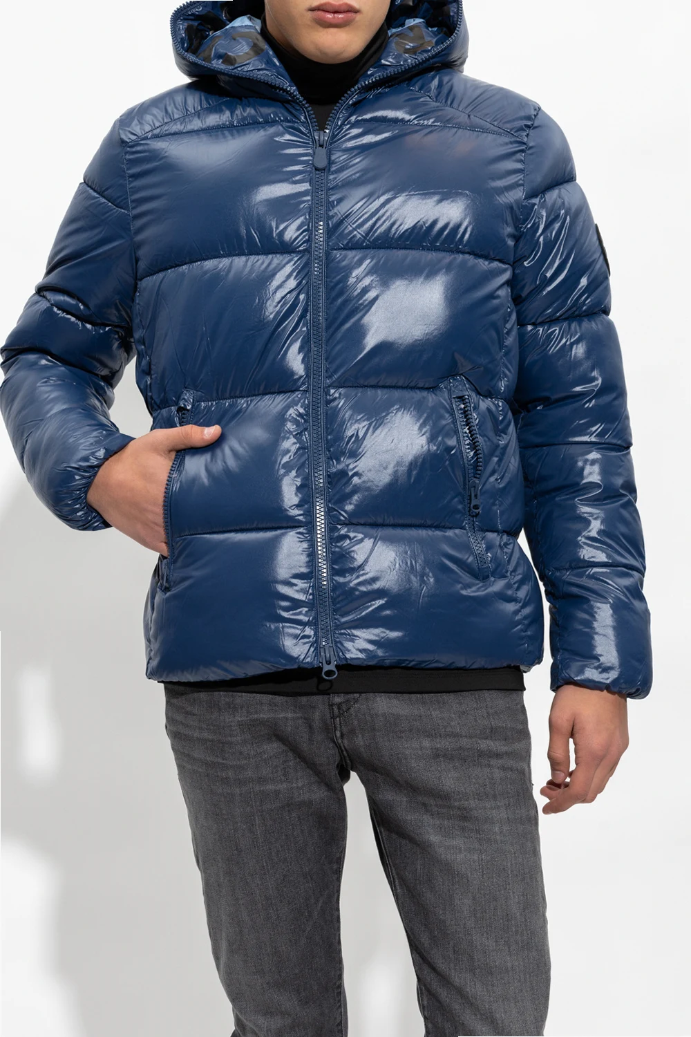 Navy blue ‘Edgard’ quilted jacket with a hood from Save The Duck. Padded with synthetic down Plumtech®, this style offers waterproof and windproof properties and features a two-way zip fastening, a black sleeve patch with a logo, a black print on the hood, two zip pockets, a drawcord-adjustable hem and long sleeves with elasticated cuffs. Temperature range: from -10°C up to +5°C.